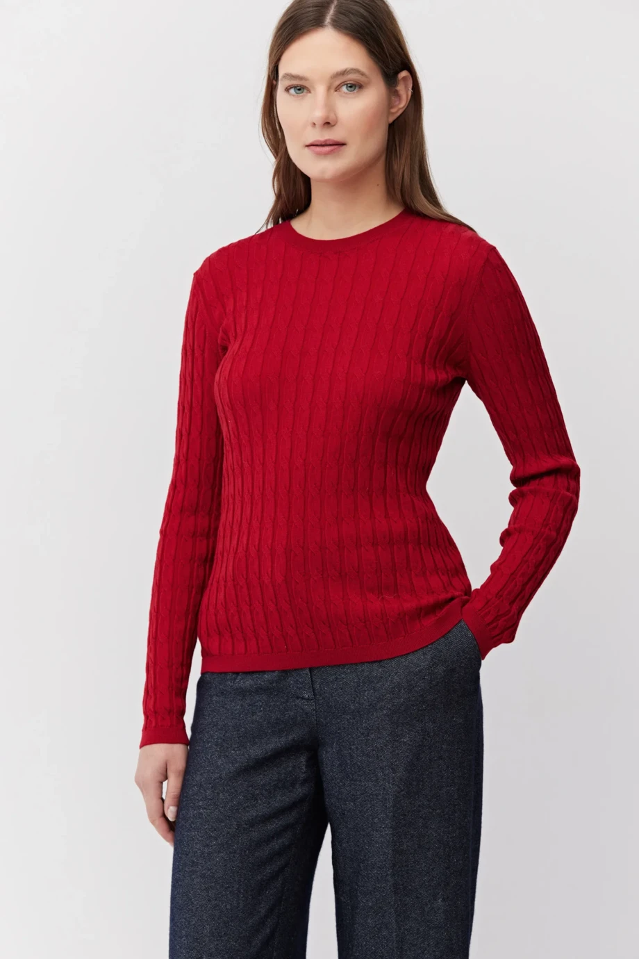 Bluse aus Merinowolle. Taillierter Schnitt, Rundhalsausschnitt und lange Ärmel. Strickware mit Zopfmuster, maschinell gestrickt mit einer Nadelstärke von 16 GG.
