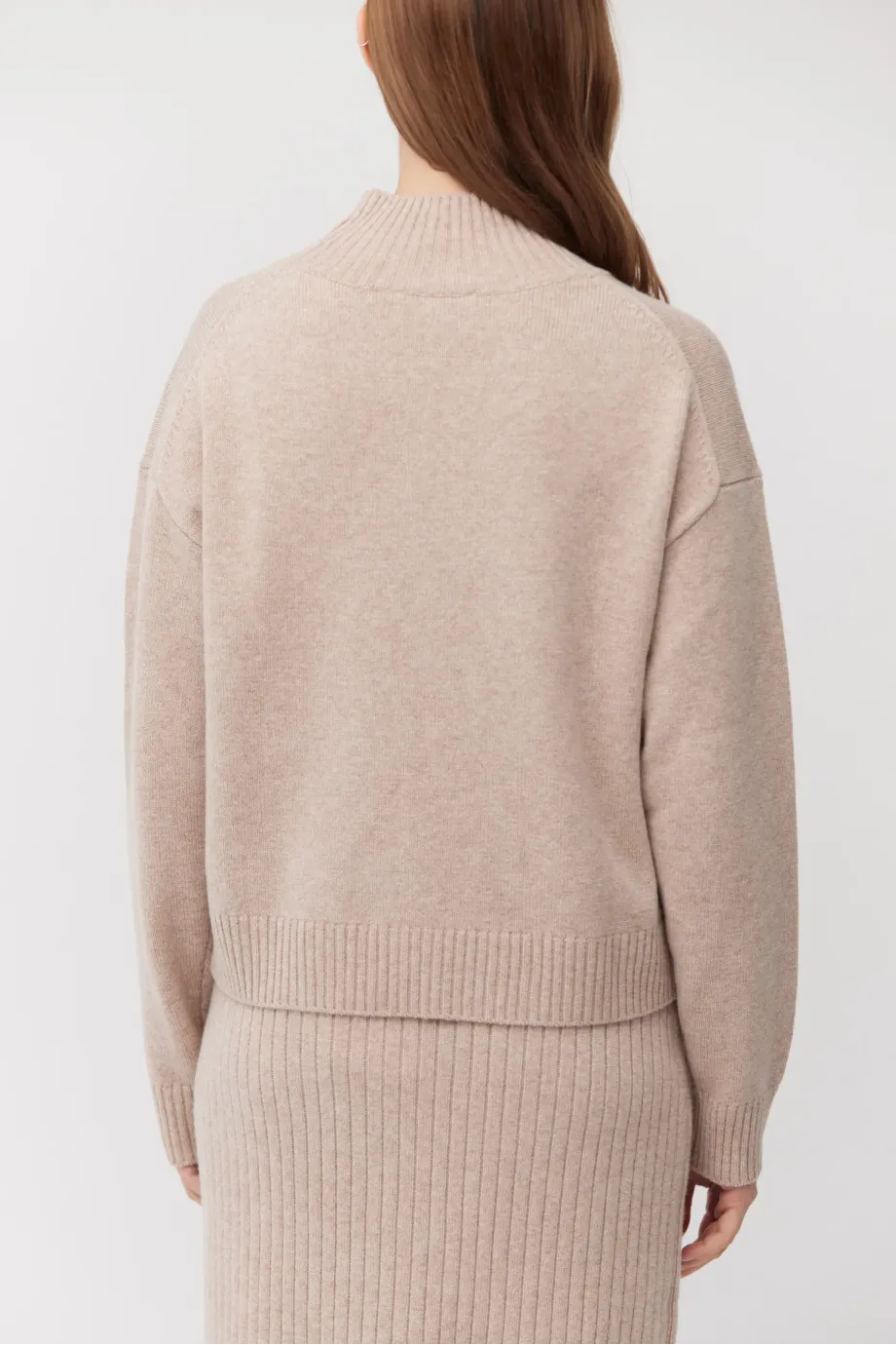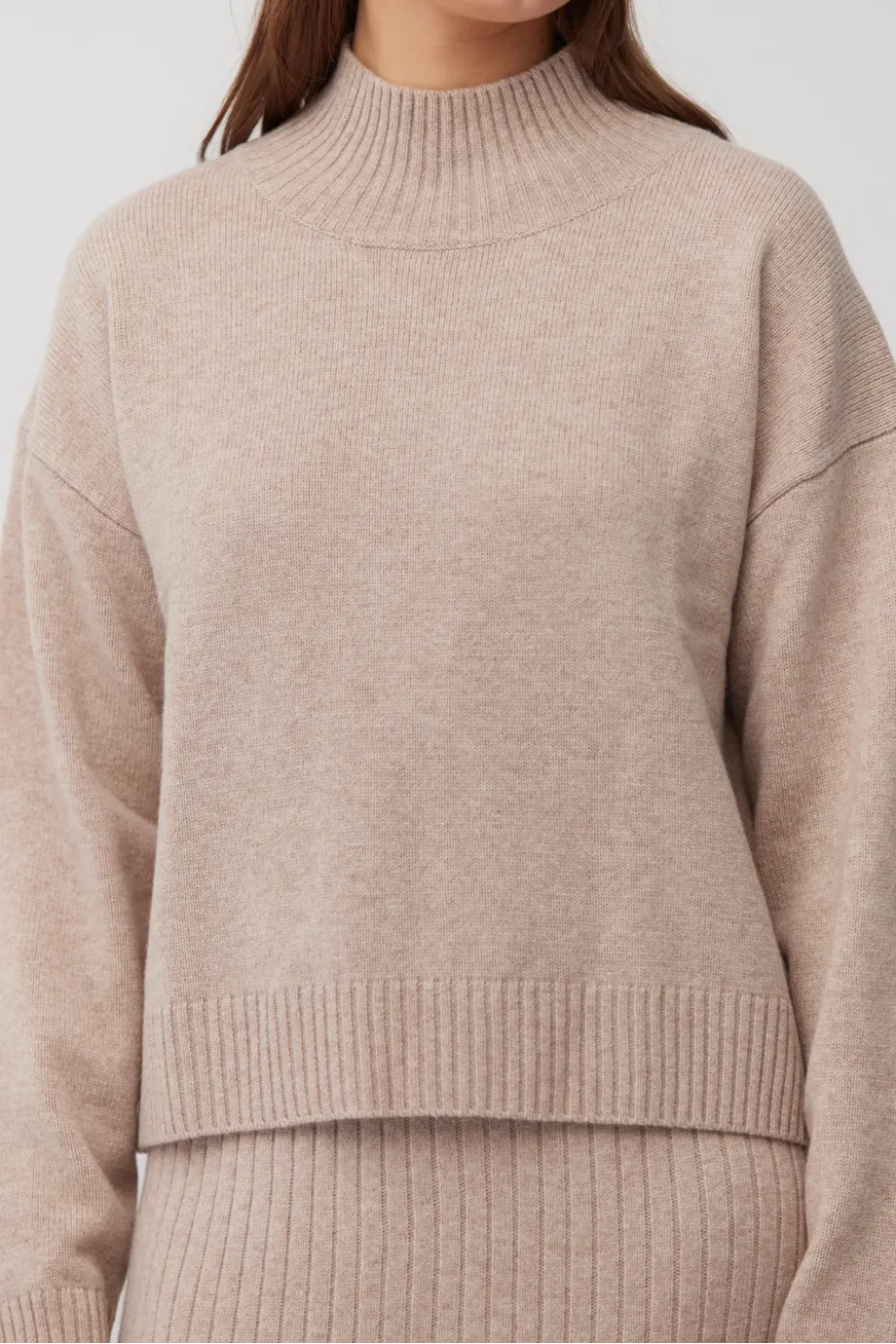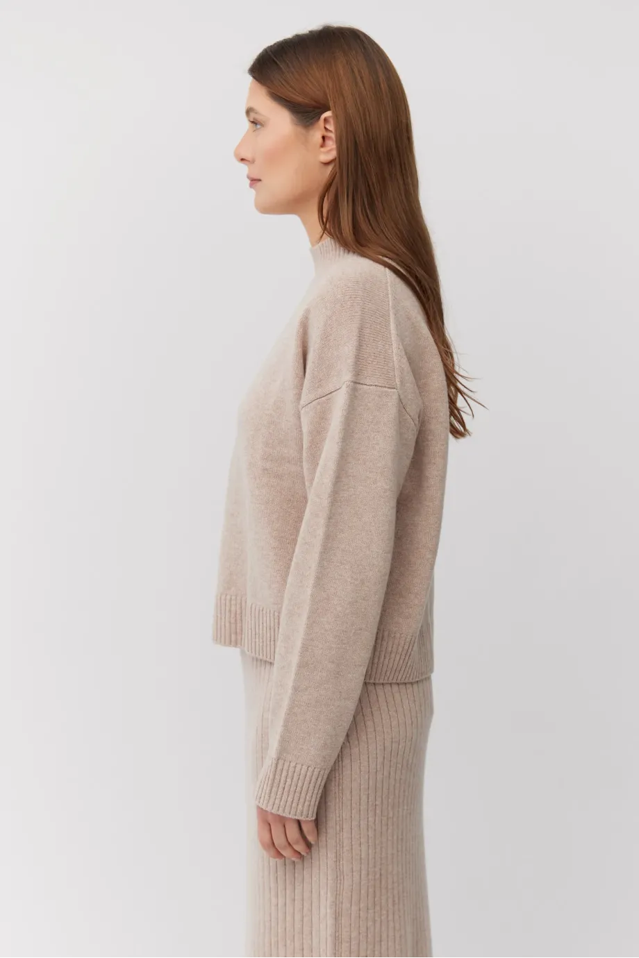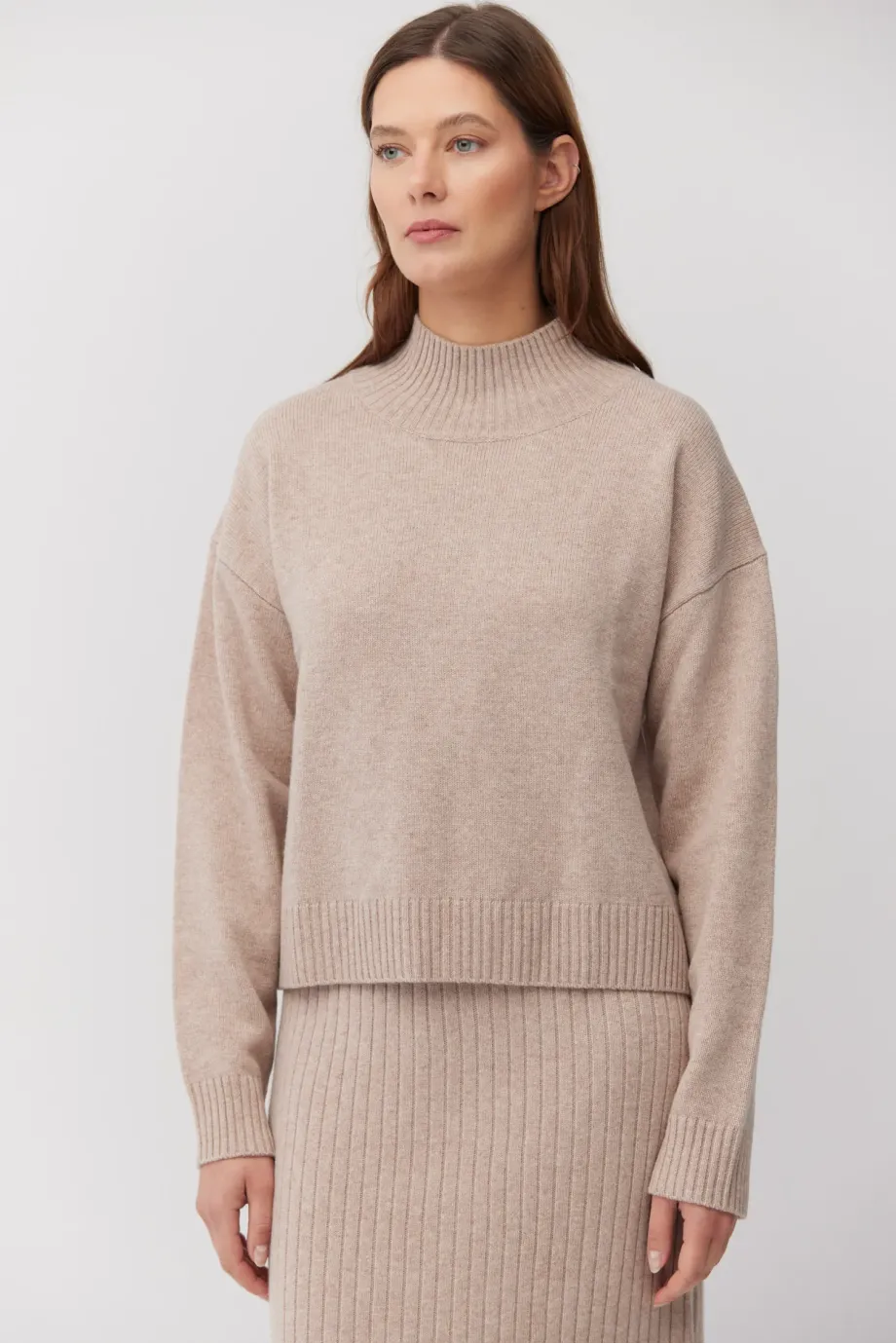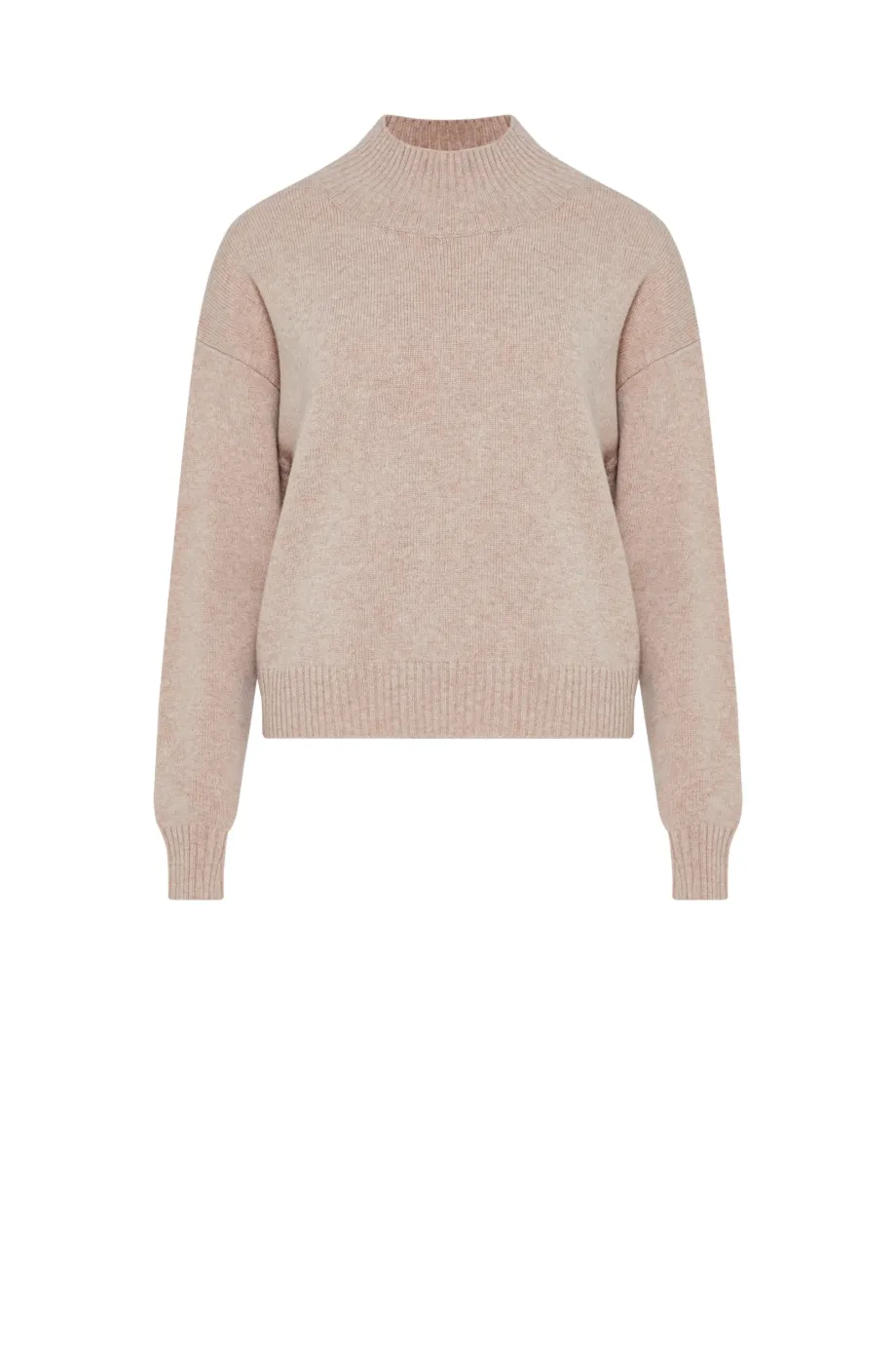 Pullover aus Merinowolle. Stehkragen, lange Ärmel, lockere Passform. Weiches Gestrick im Single-Jersey, gefertigt auf einer Maschine mit 7 GG Feinheit. Farbe Beige. Passend dazu Rock erhältlich.
