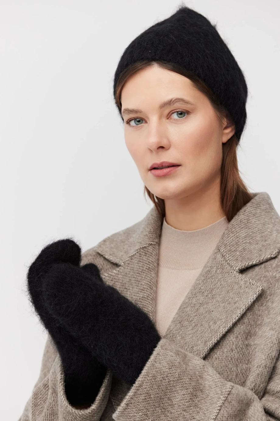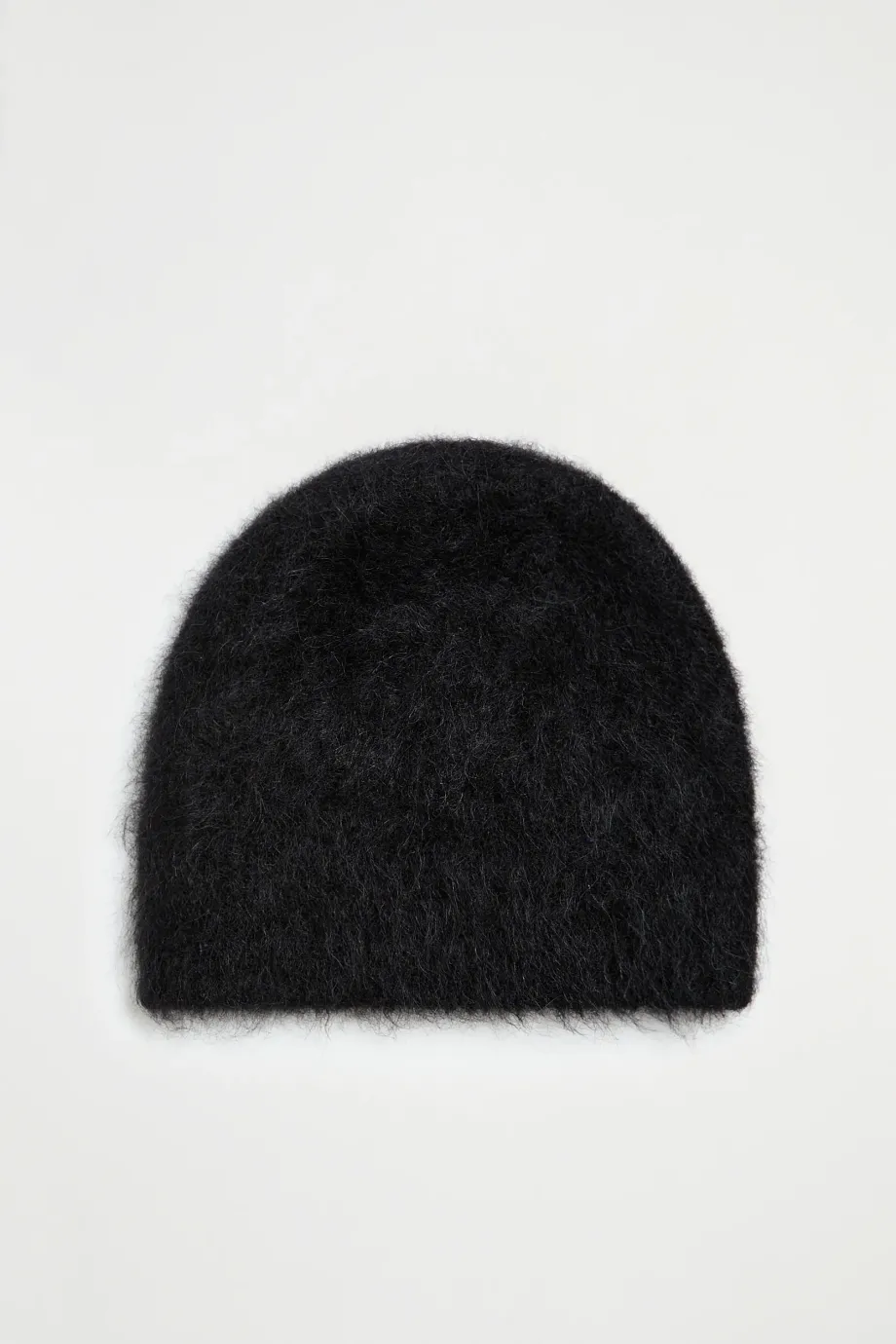 Mütze mit Alpakawolle. Gestrick mit längerem Flor im lockeren Single-Jersey, gefertigt auf einer Maschine mit 3 GG Feinheit. Farbe Schwarz.
