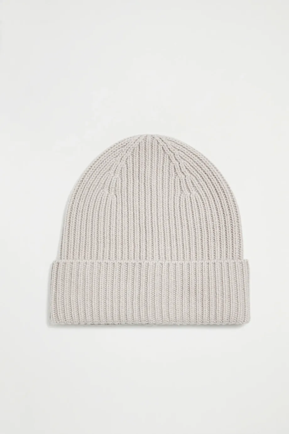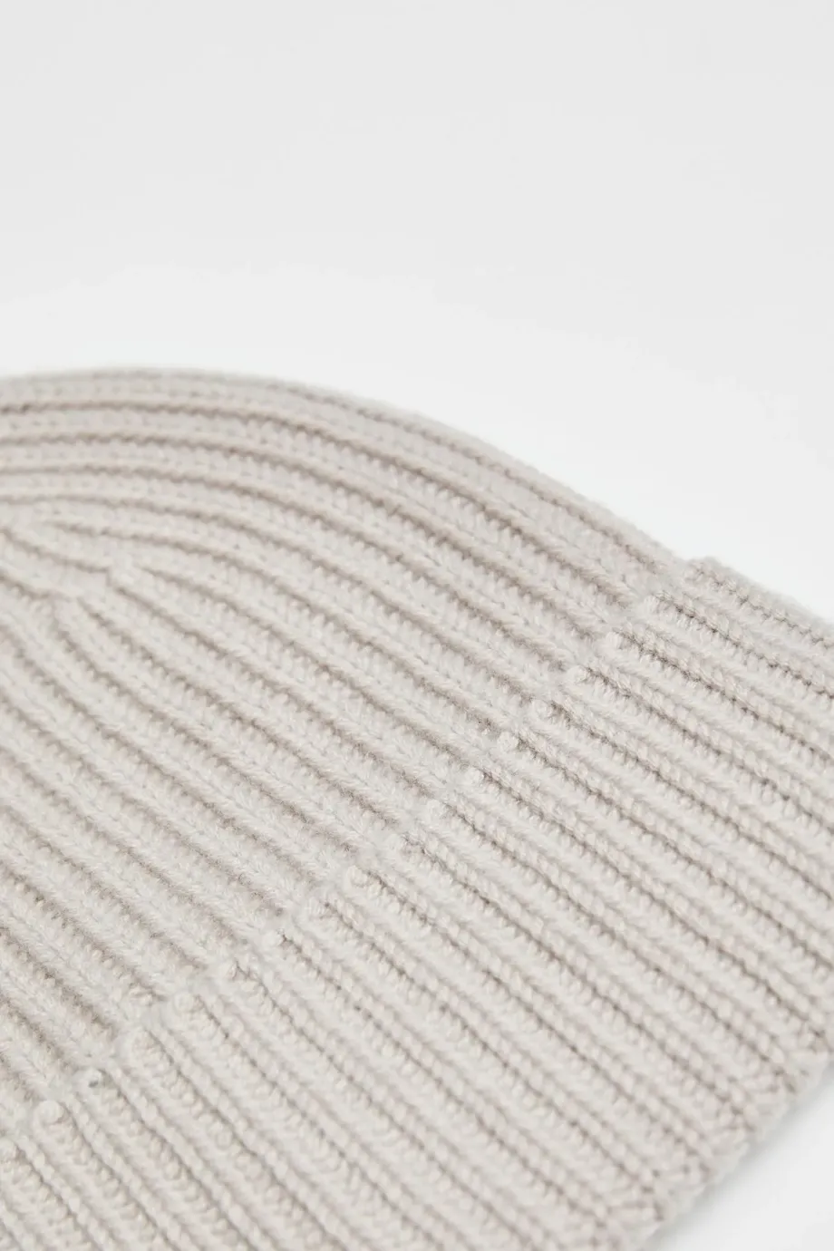 Mütze mit Kaschmiranteil. Weiches Gestrick im Englischen Rippenmuster. Farbe: kühles Beige.