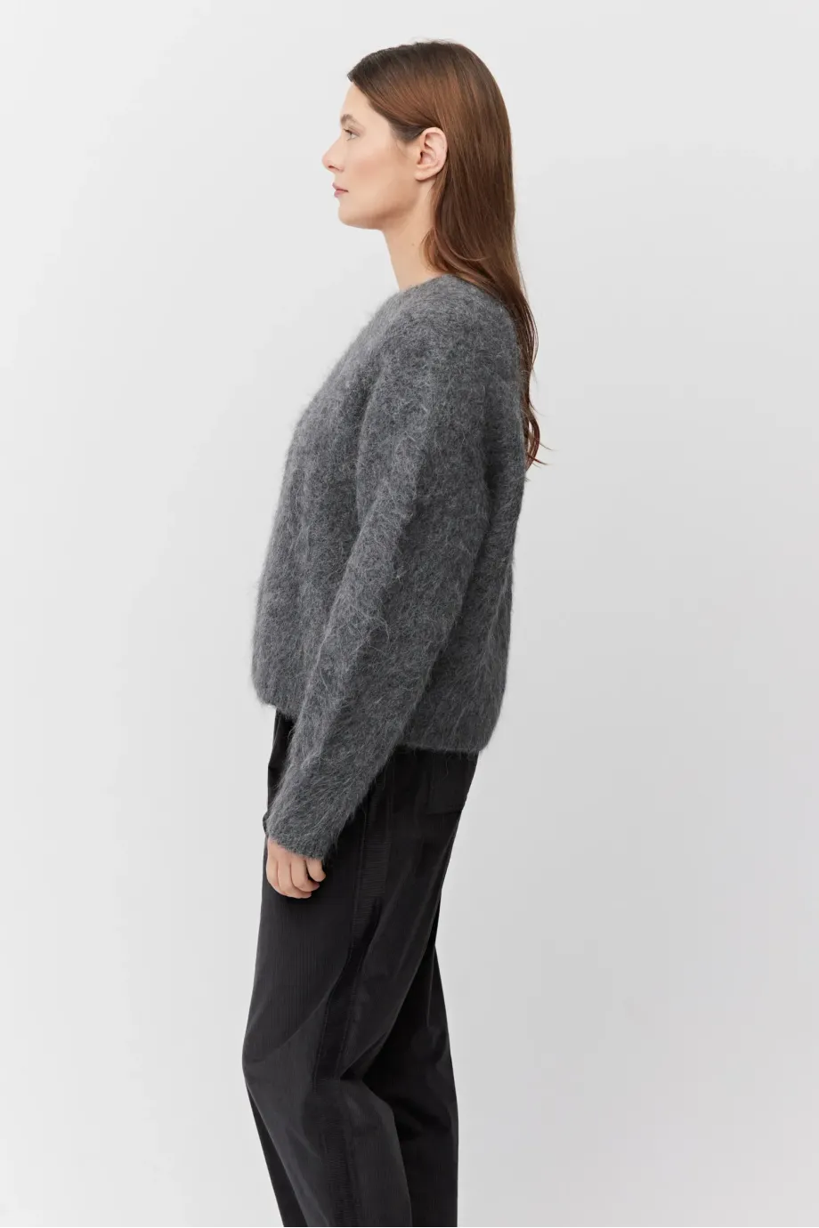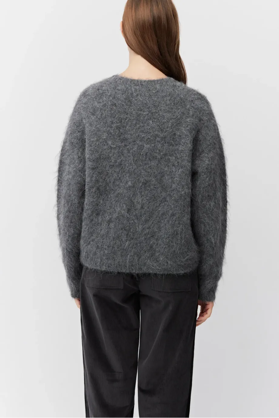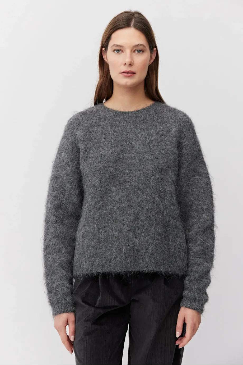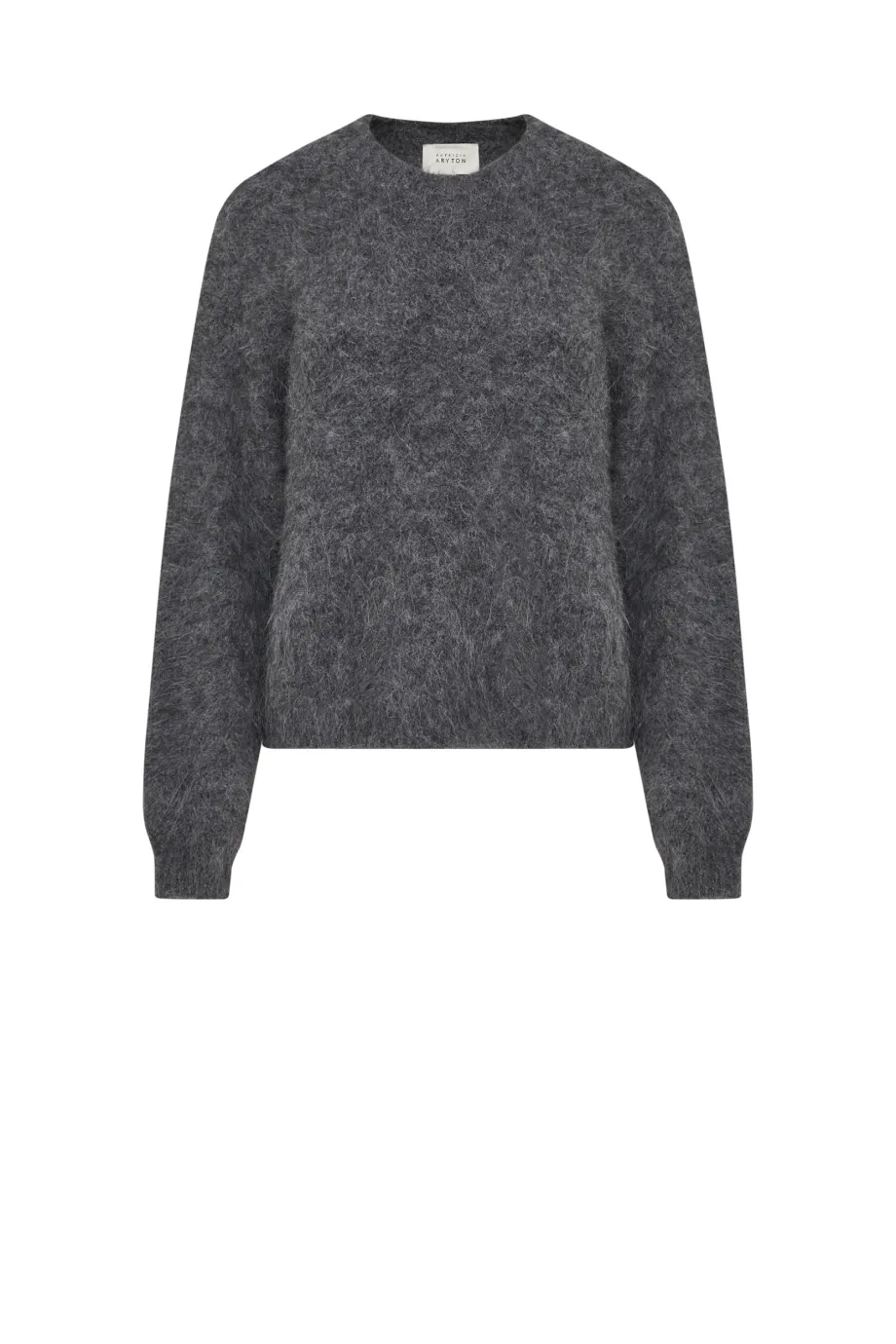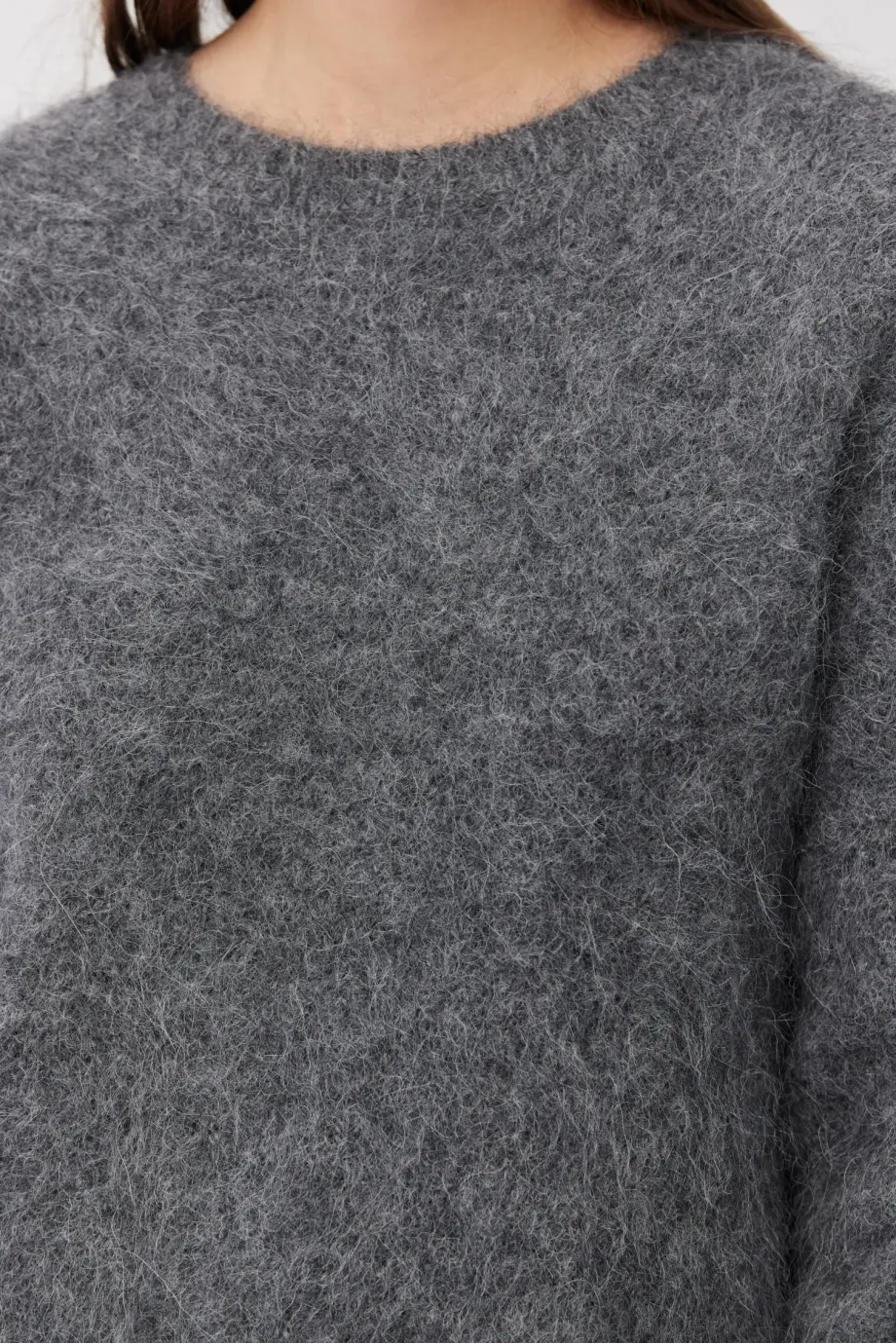 Grauer Pullover aus Alpakawolle. Rundhalsausschnitt, lange Ärmel. Weicher, warmer Strickstoff mit längerem Flor. Lockere Single-Jersey-Webart, hergestellt auf einer Maschine mit einer Nadelstärke von 3 GG.