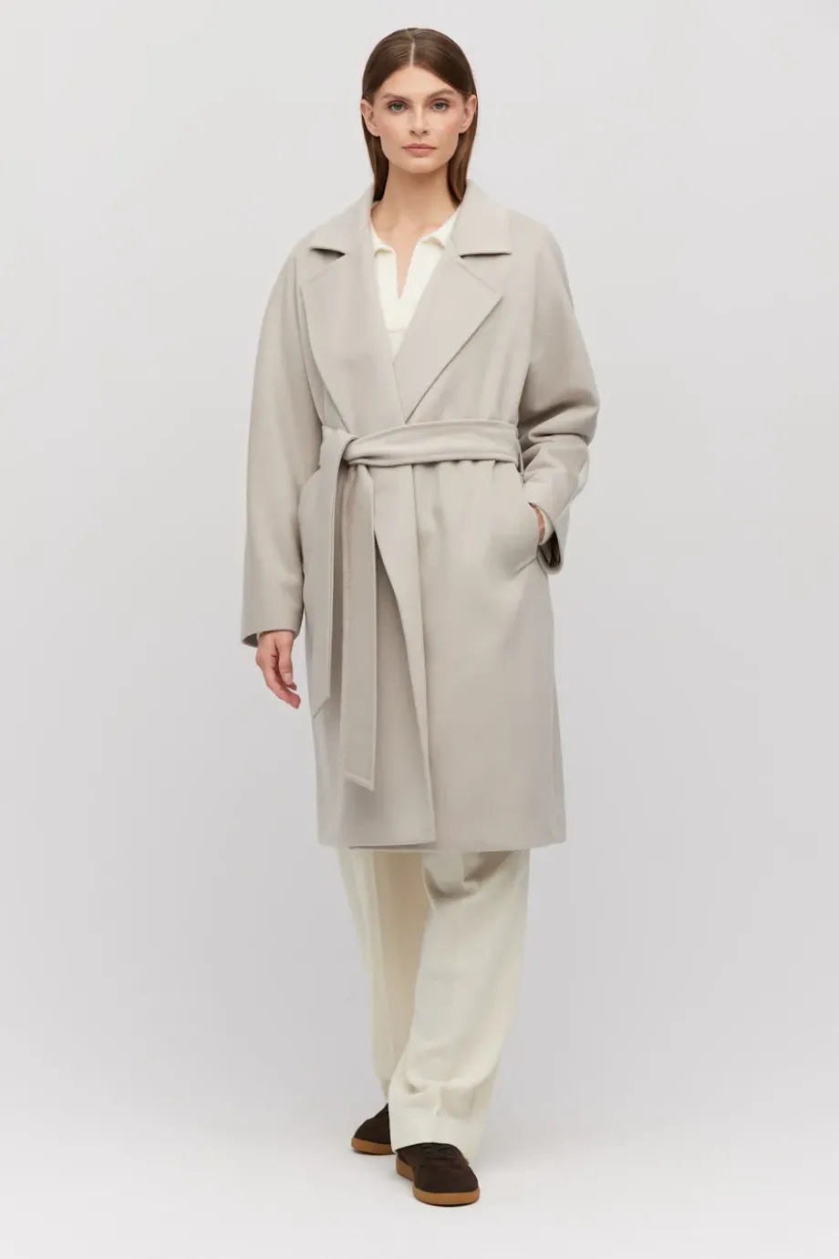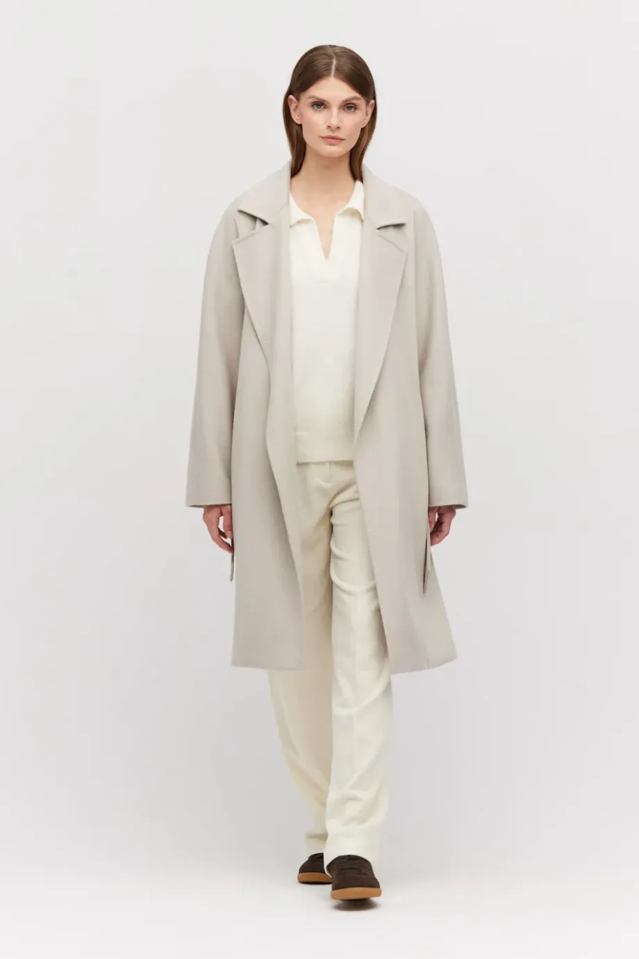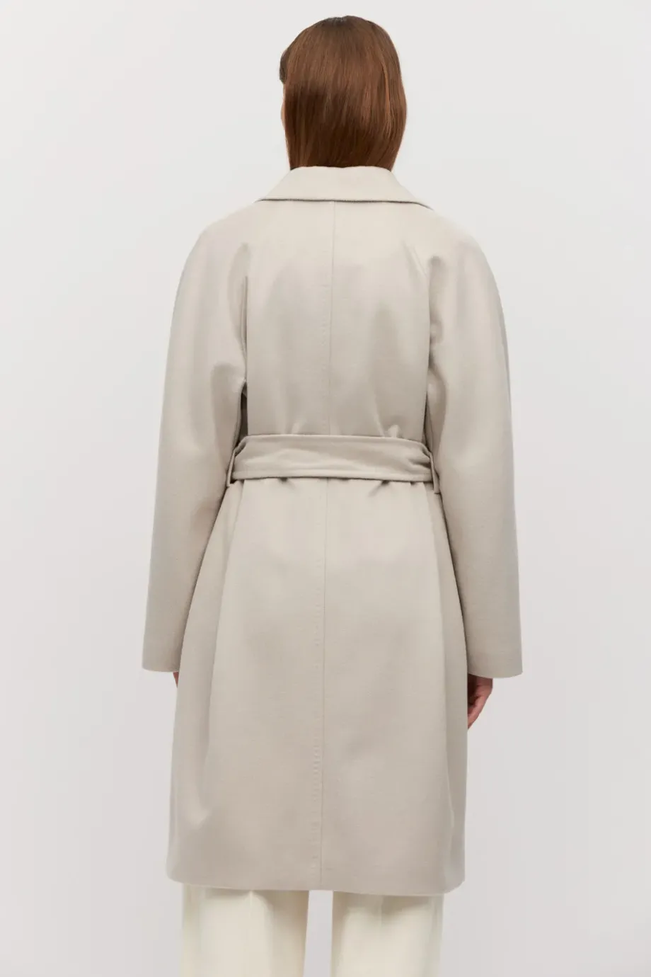 Wollmantel mit Gürtel, ohne Verschluss. Schlichte Form, körpernah, mit Kimonoärmeln vorne und Raglanärmeln hinten. Futter mit dekorativer Paspelierung. Länge knapp über dem Knie.