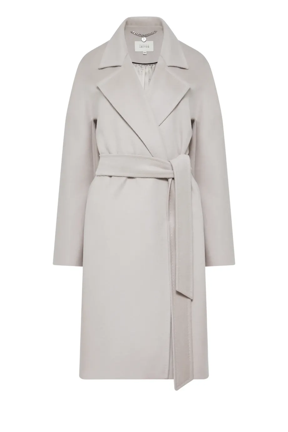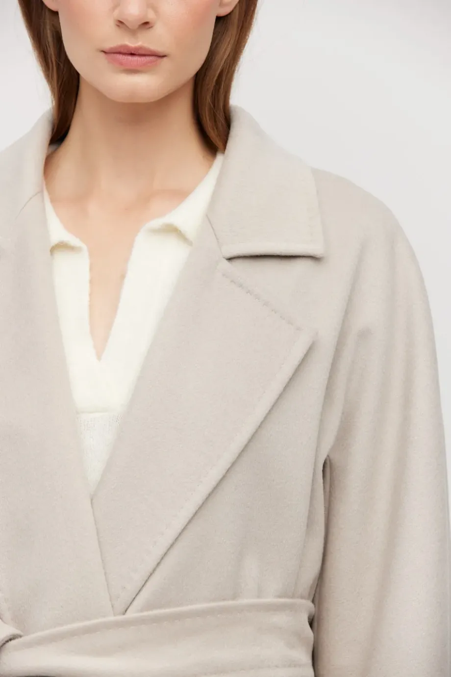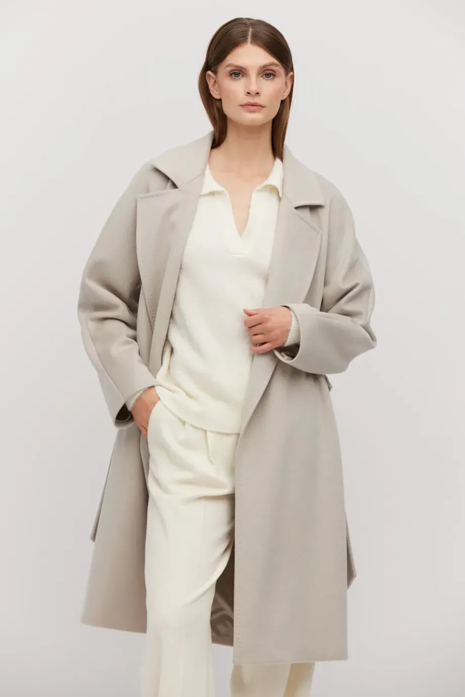 Wollmantel mit Gürtel, ohne Verschluss. Schlichte Form, körpernah, mit Kimonoärmeln vorne und Raglanärmeln hinten. Futter mit dekorativer Paspelierung. Länge knapp über dem Knie.