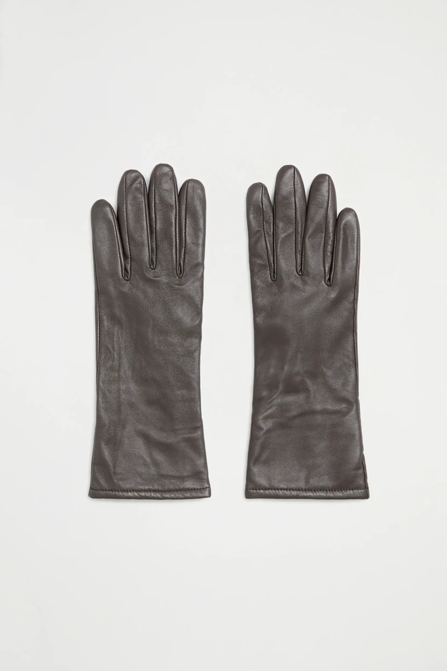 Braune, lange Handschuhe aus weichem Naturleder, gefüttert mit einer Mischung aus Wolle und Kaschmir.