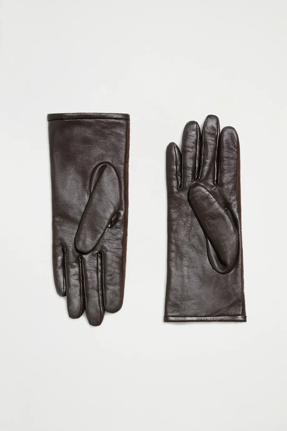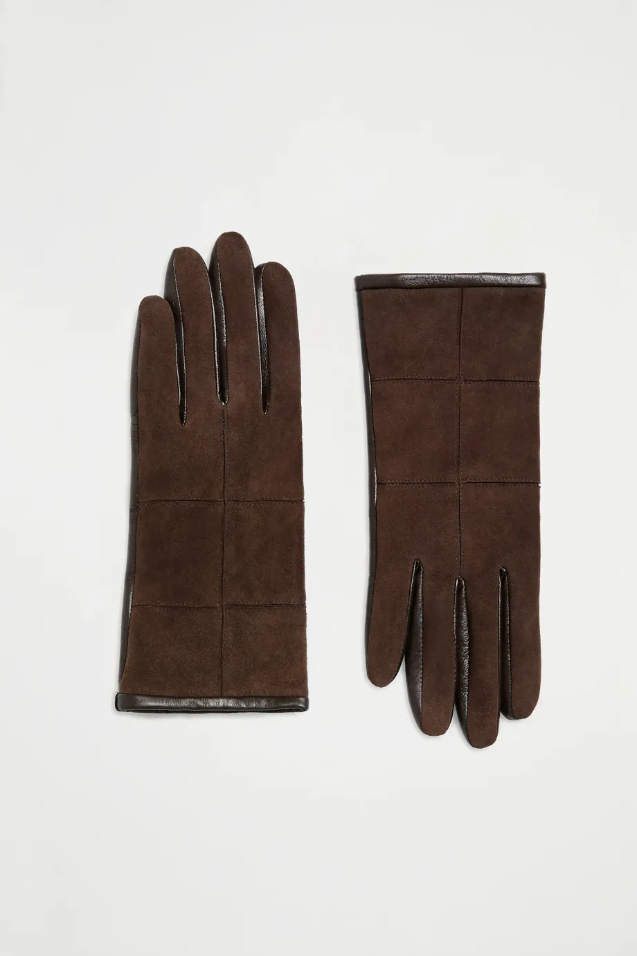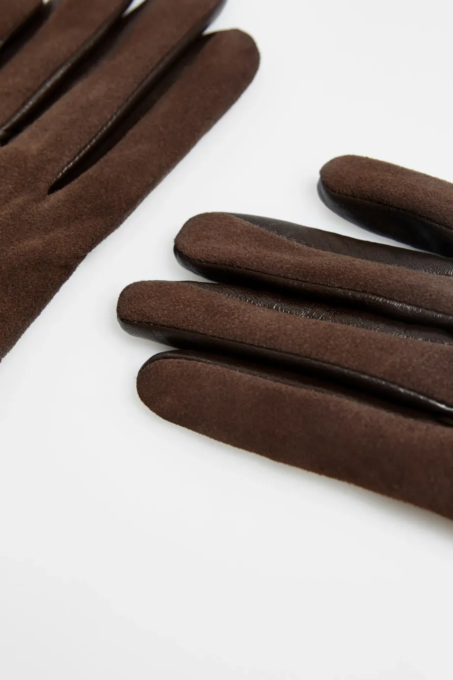 Handschuhe aus einer Kombination aus Veloursleder und Nappaleder. Kaschmirfutter. Farbe: Braun.
