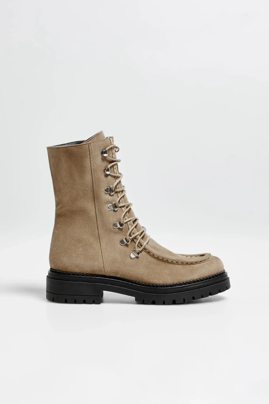 Beigefarbene Stiefeletten aus weichem Wildleder. Schnürbar, mit massiver Sohle und runder Spitze. Handgefertigt in einer spanischen Manufaktur.