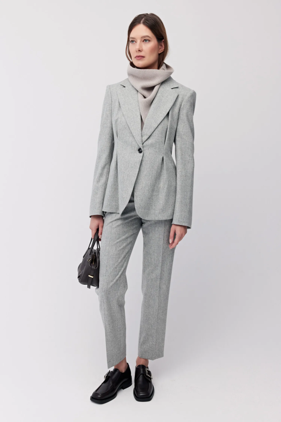 Anzughose mit Kaschmir. Leicht zulaufendes Bein, mit Haken-, Reißverschluss- und innenliegendem Corozo-Knopfverschluss. Innen mit Zierpaspel. Taschen und Gürtelschlaufen. Farbe: Grau. Passend dazu ein Sakko aus dem gleichen Stoff.