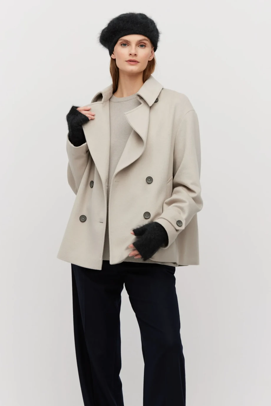 Beige Jacke aus Wolle mit lockerem Schnitt. Zweireihig, hochgeschlossen zu knöpfen. Mit Futter, leicht überschnittenen Schultern, Kellerfalte im Rücken und Schulterriegeln an den Ärmeln.