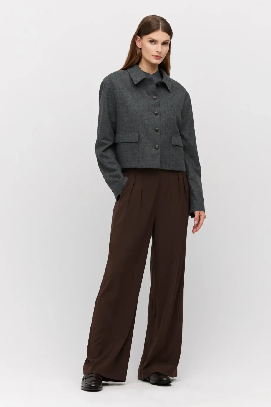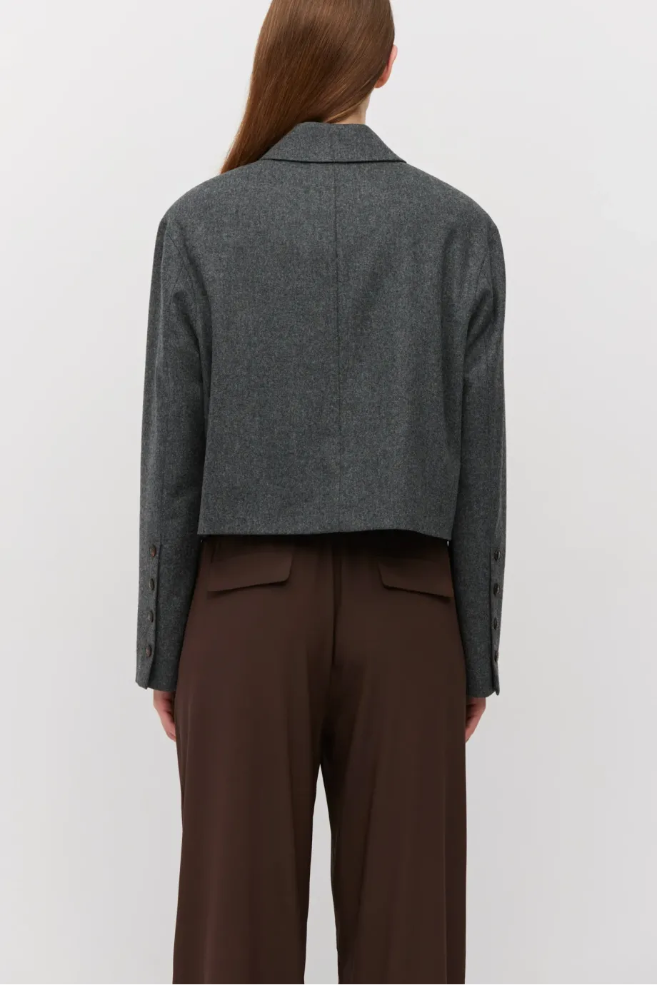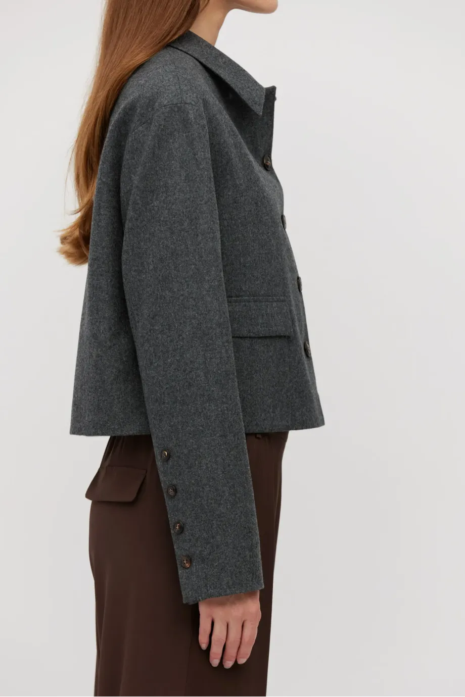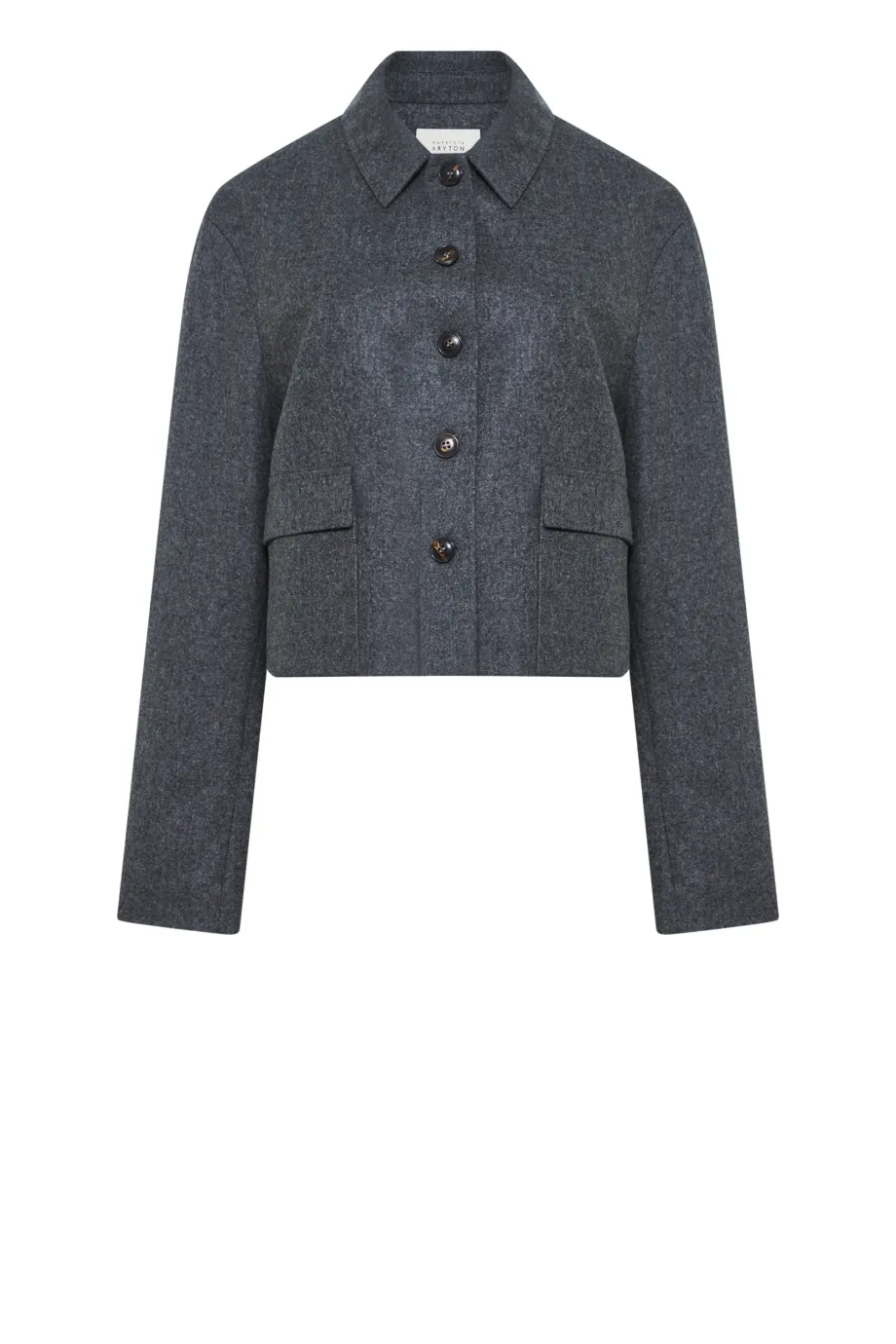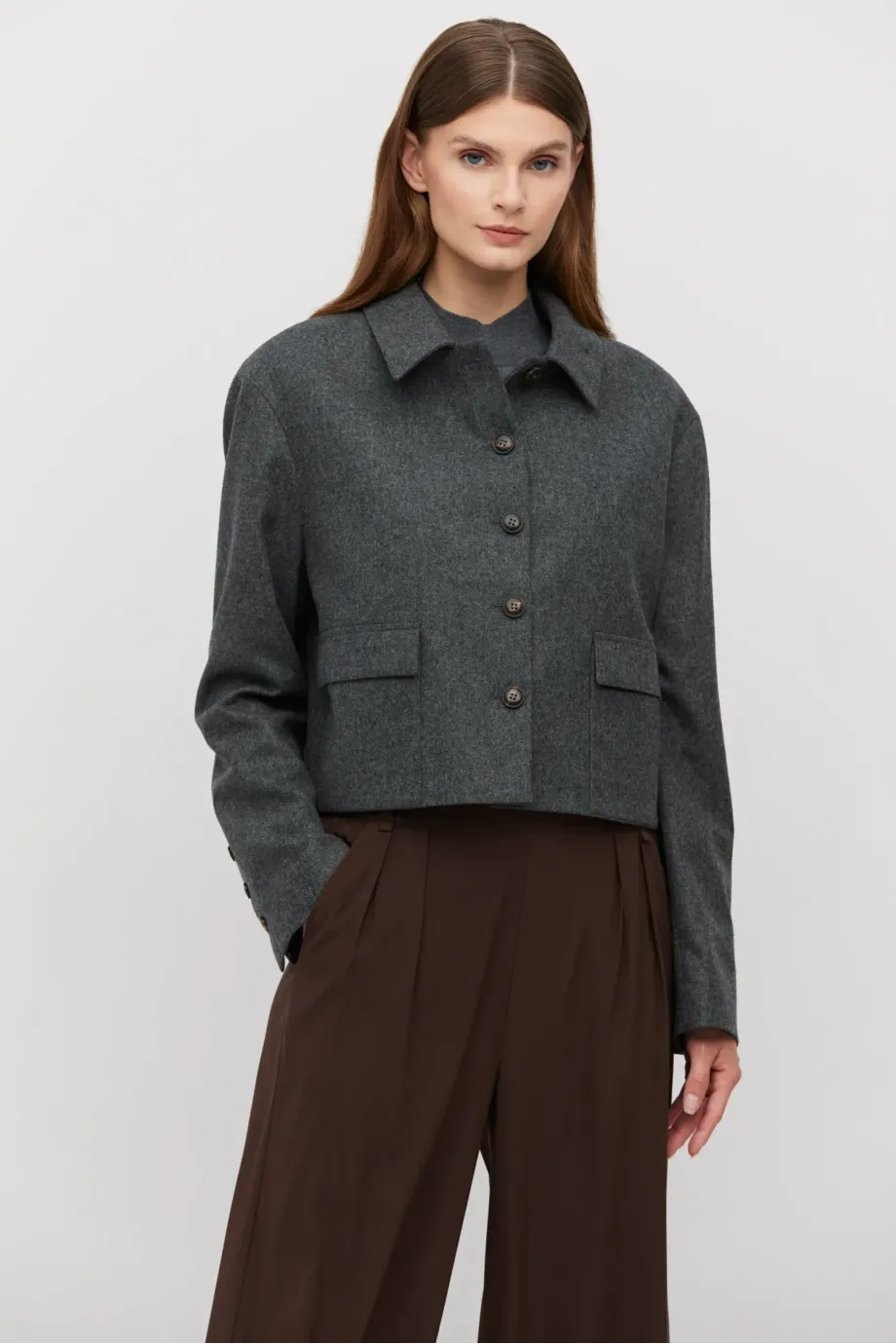 Grauer Blazer mit Kaschmiranteil. Boxy-Schnitt. Knopfverschluss. Komplett gefüttert mit dekorativer Paspelierung. Mit Taschen.
