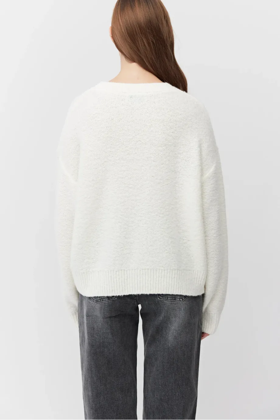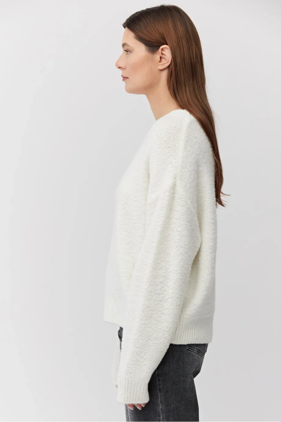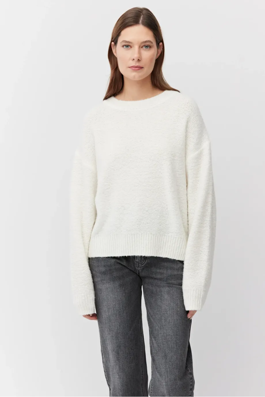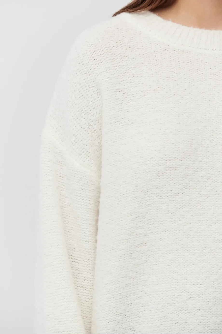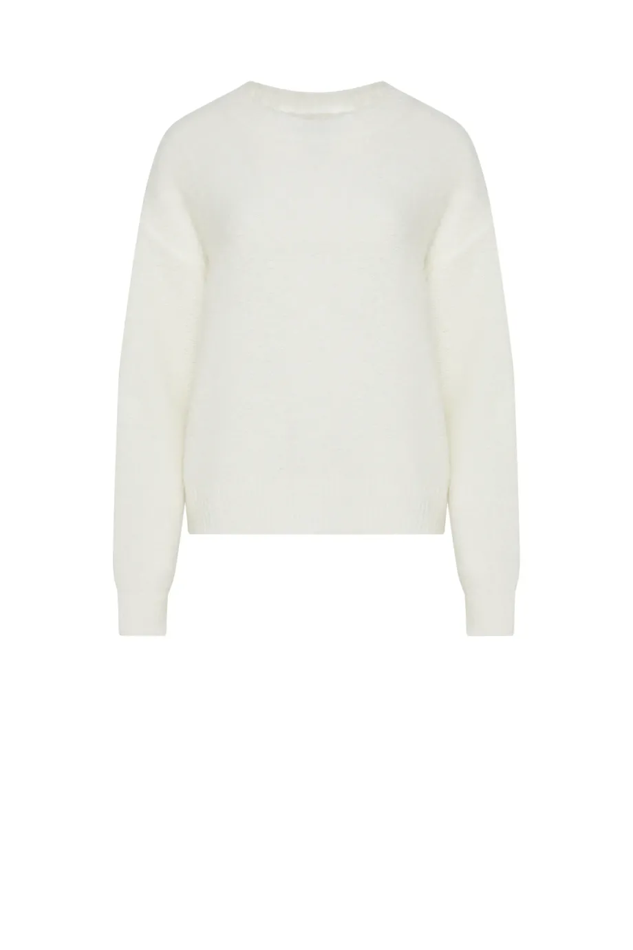 Pullover aus Merinowolle. Rundhalsausschnitt, lange Ärmel. Weicher Stoff mit lockerer Single-Jersey-Strickart, hergestellt auf einer Maschine mit einer Nadelstärke von 7 GG. Farbe: cremefarben. Lockerer Schnitt.