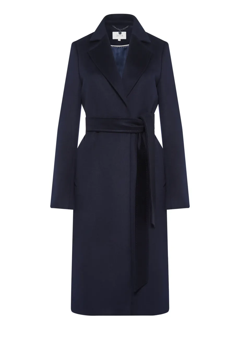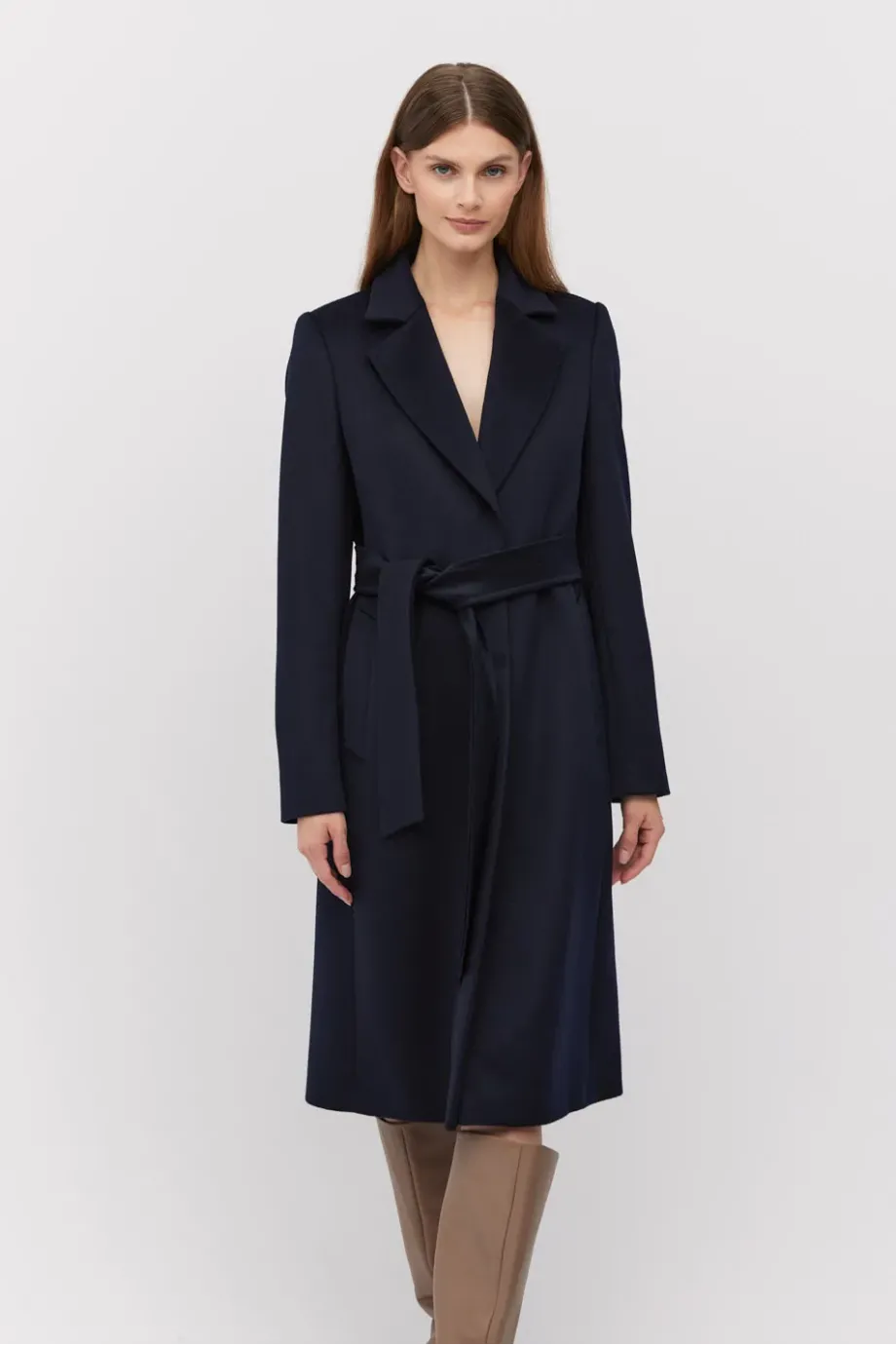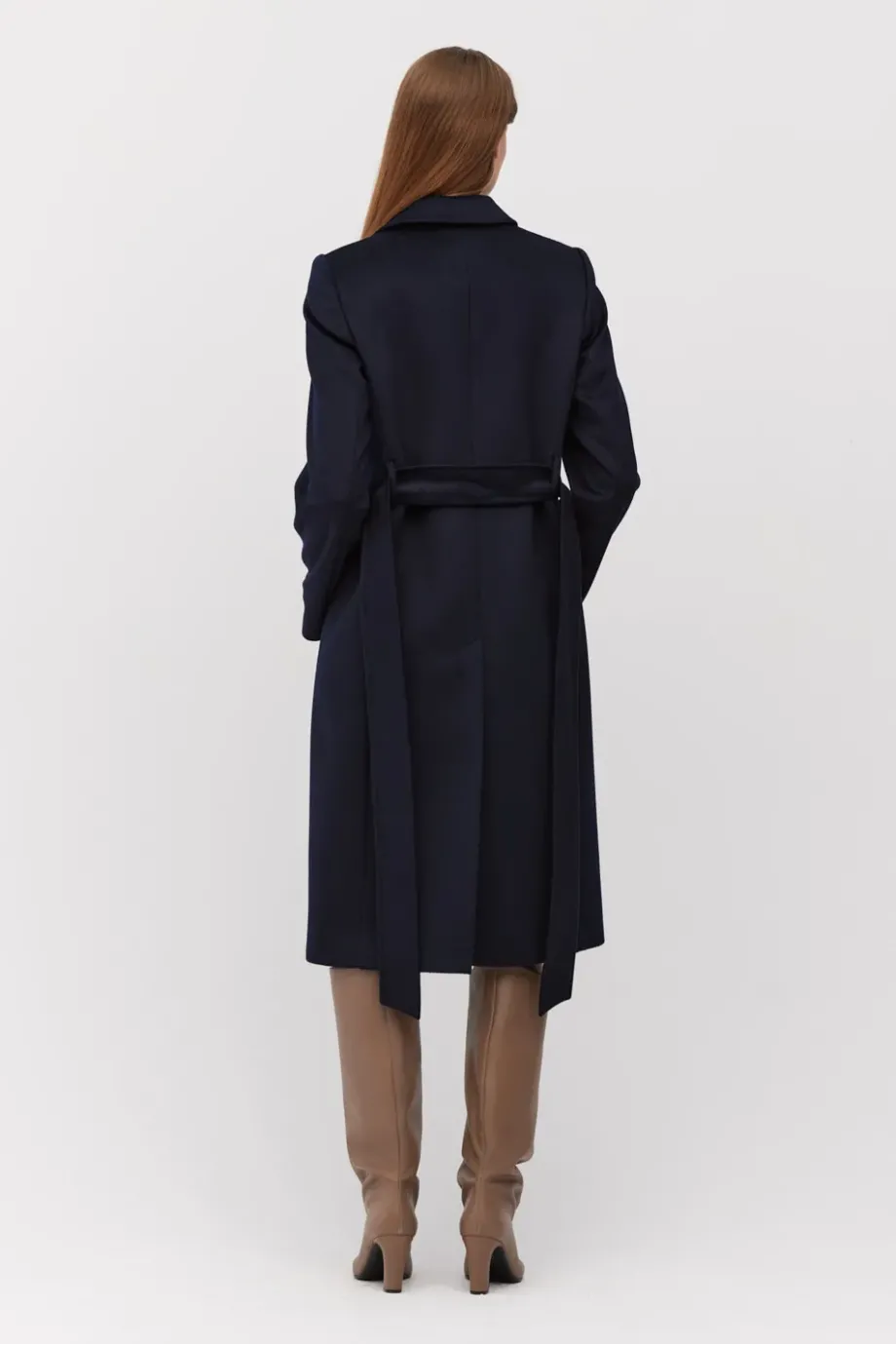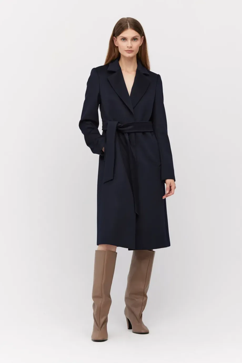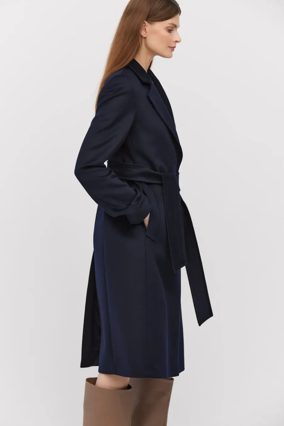 Dunkelblauer Mantel mit Gürtel. Körpernahe Passform, gefüttert mit dekorativer Paspelierung. Eingesetzte Ärmel, mit Taschen.