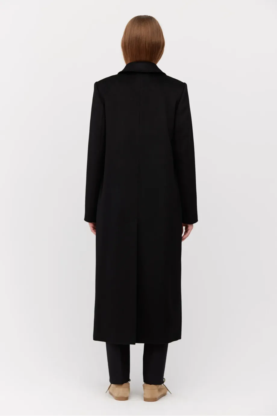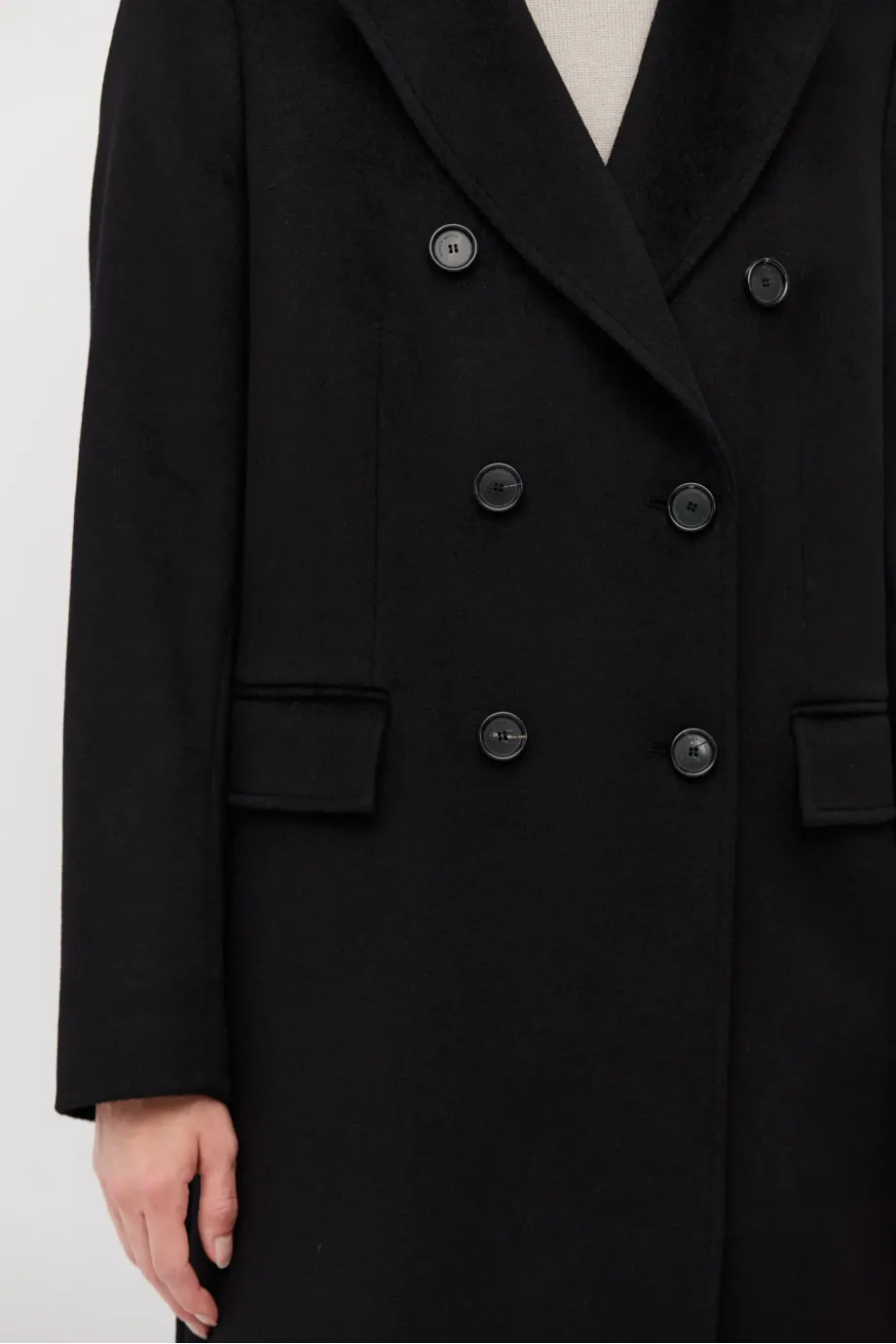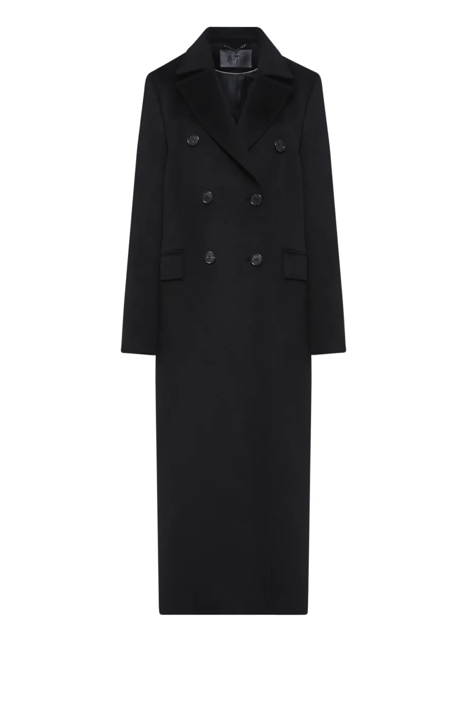 Schwarzer, zweireihiger Mantel mit Seiden- und Kaschmiranteil. Gefüttert, mit dekorativen Steppnähten. Klassischer Kragen und Schlitz im Rücken. Zweireihiger Verschluss mit Knöpfen aus Naturhorn außen und Corozo-Knopf innen. Mit Taschen.