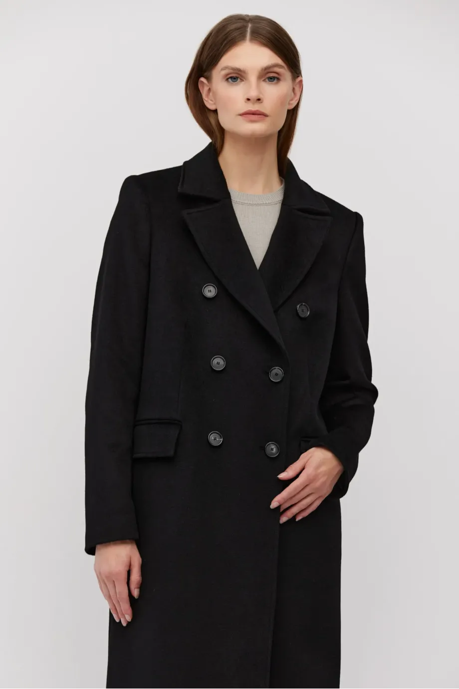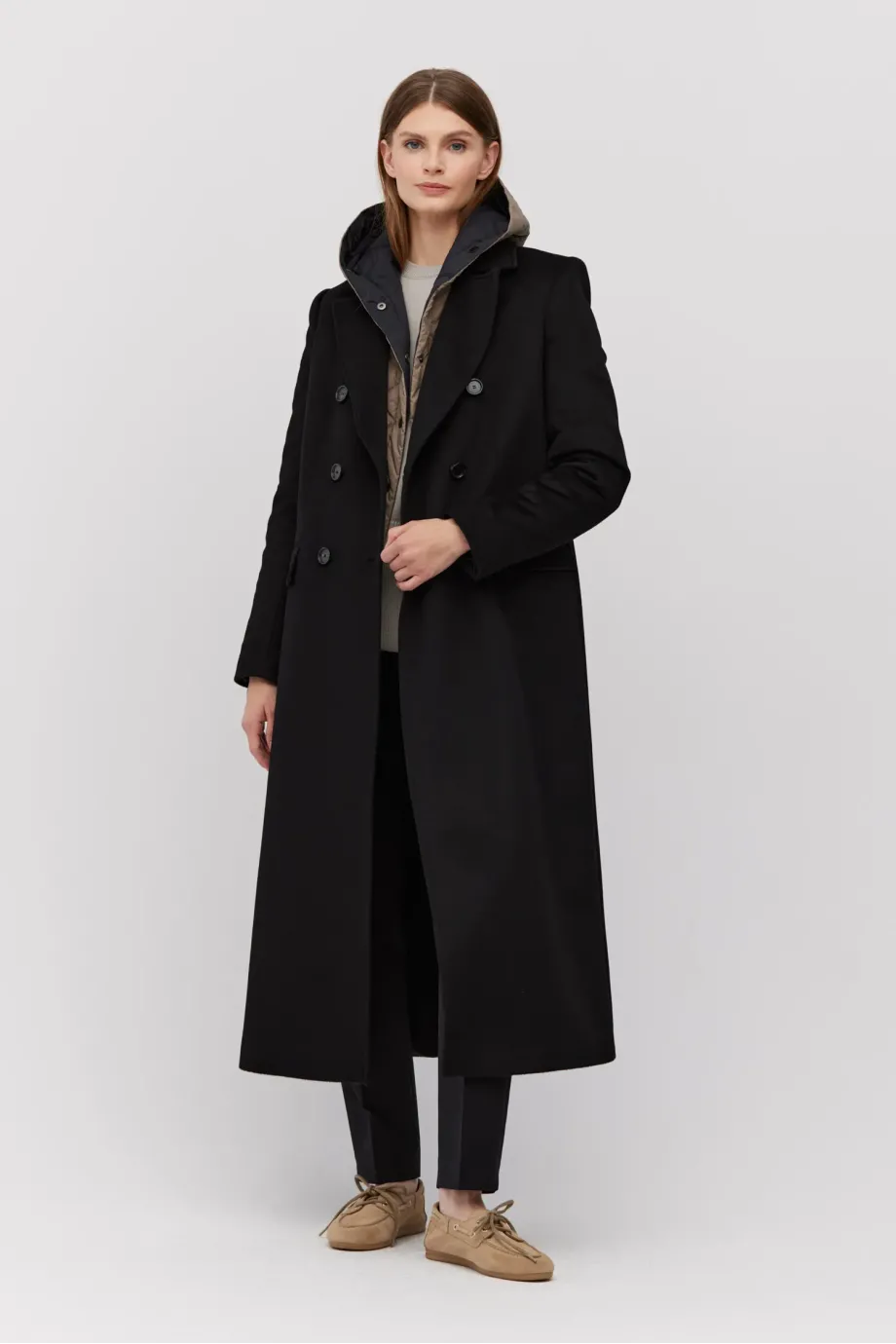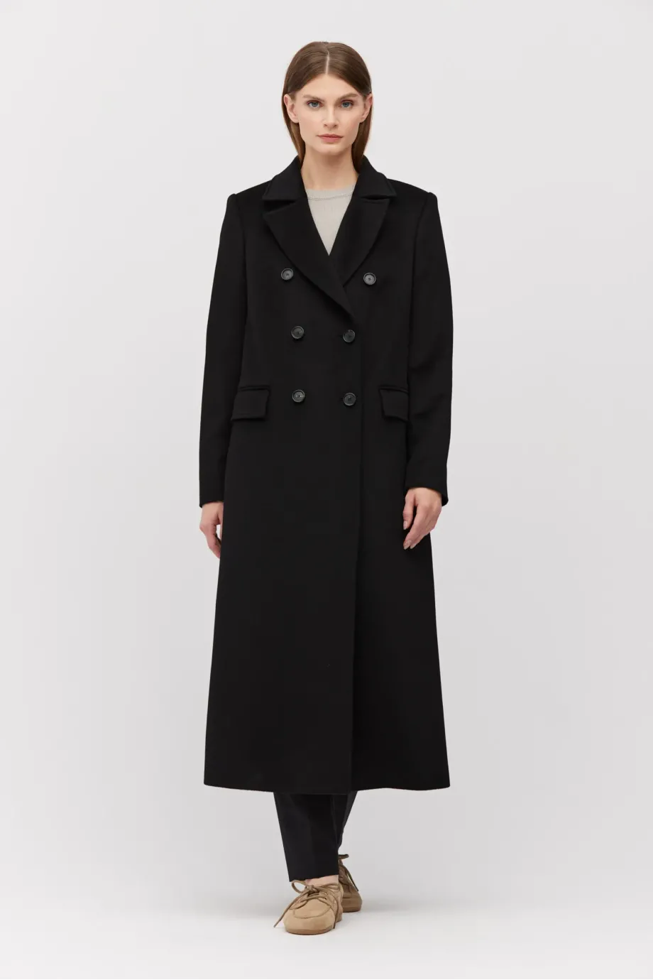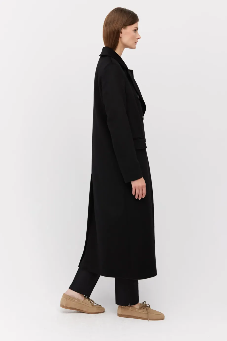 Schwarzer, zweireihiger Mantel mit Seiden- und Kaschmiranteil. Gefüttert, mit dekorativen Steppnähten. Klassischer Kragen und Schlitz im Rücken. Zweireihiger Verschluss mit Knöpfen aus Naturhorn außen und Corozo-Knopf innen. Mit Taschen.