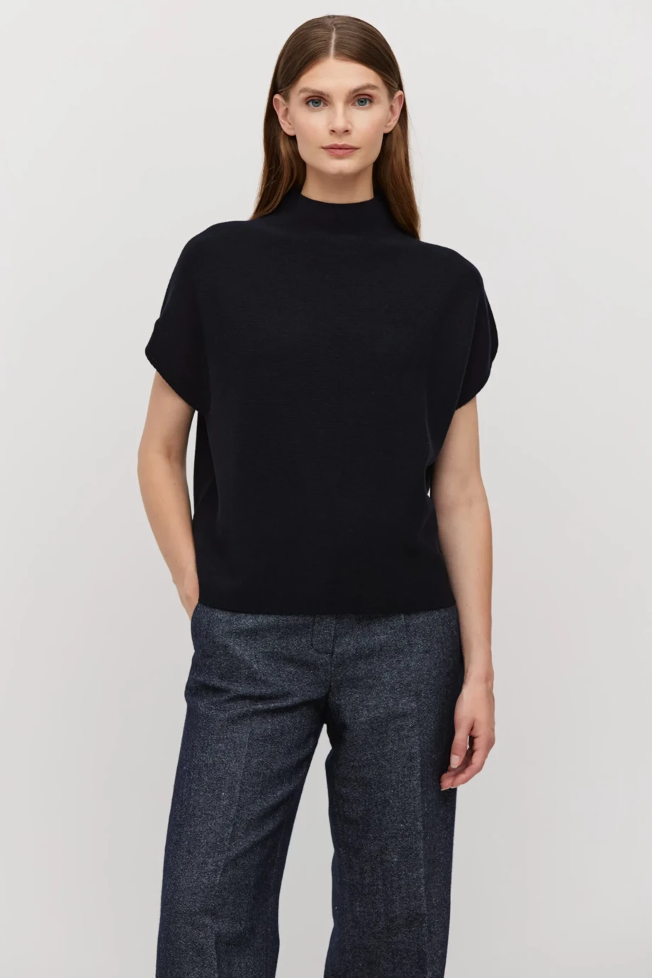 Lockere Wollbluse in schlichter Form. Leicht überschnittener Ärmel. Kräftiges Strickmaterial im Link-Links-Stich, gestrickt auf einer Maschine mit 15 GG. Farbe Dunkelblau.