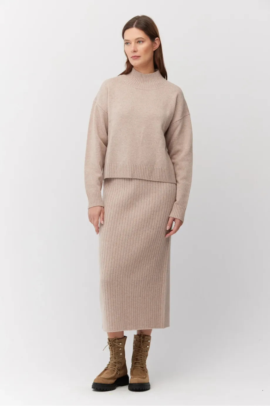 Rock aus Merinowolle. Weiches Gestrick im Rippenmuster, gefertigt auf einer Maschine mit 7 GG Feinheit. Körpernahe Passform, Midi-Länge. Farbe Beige. Passend dazu Pullover erhältlich.