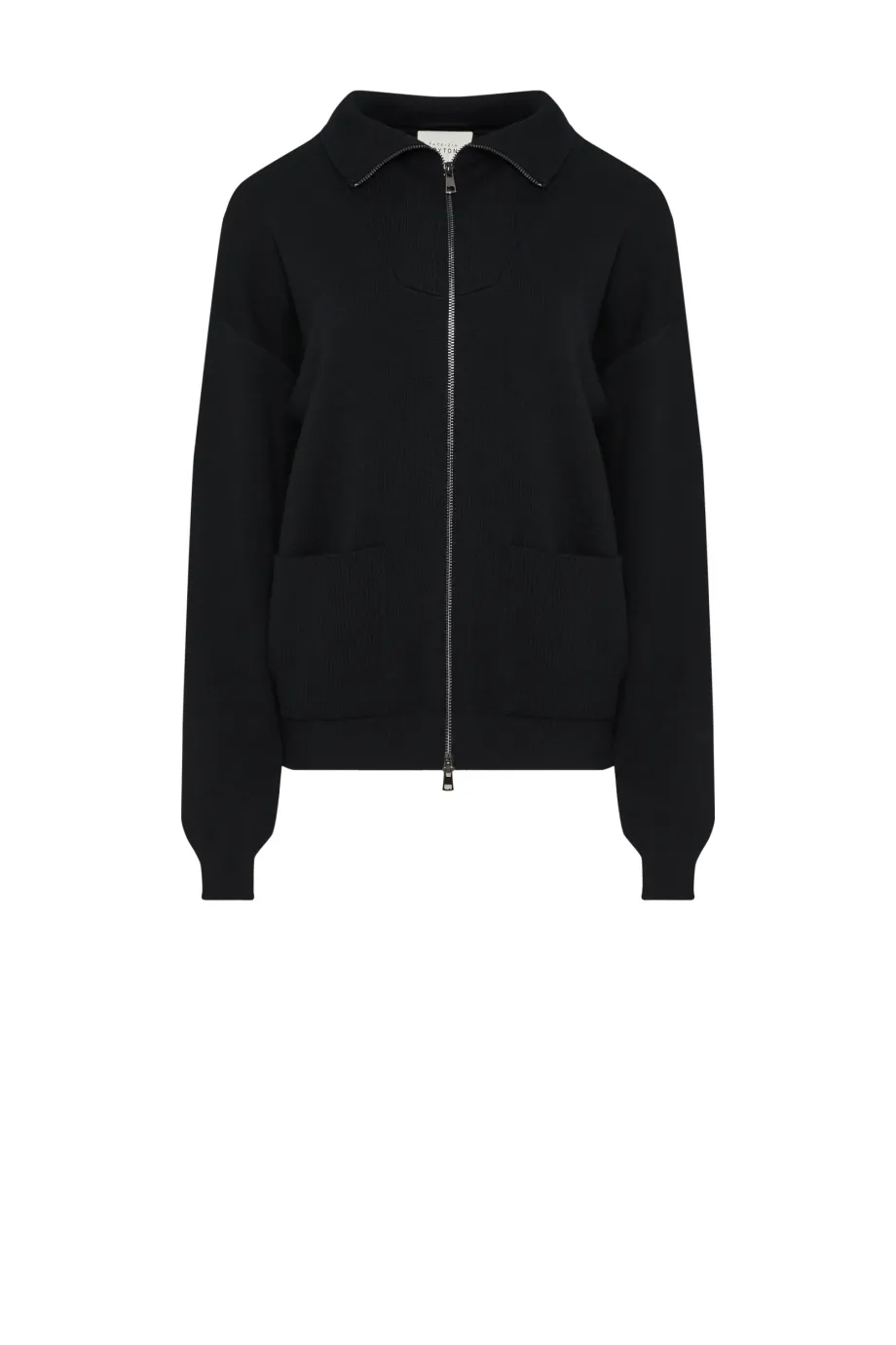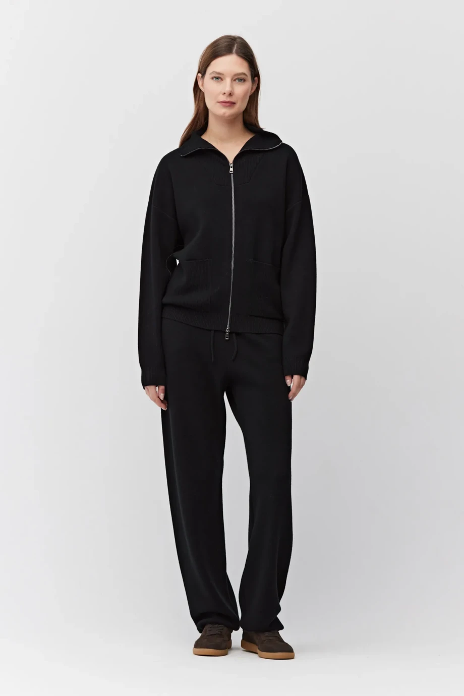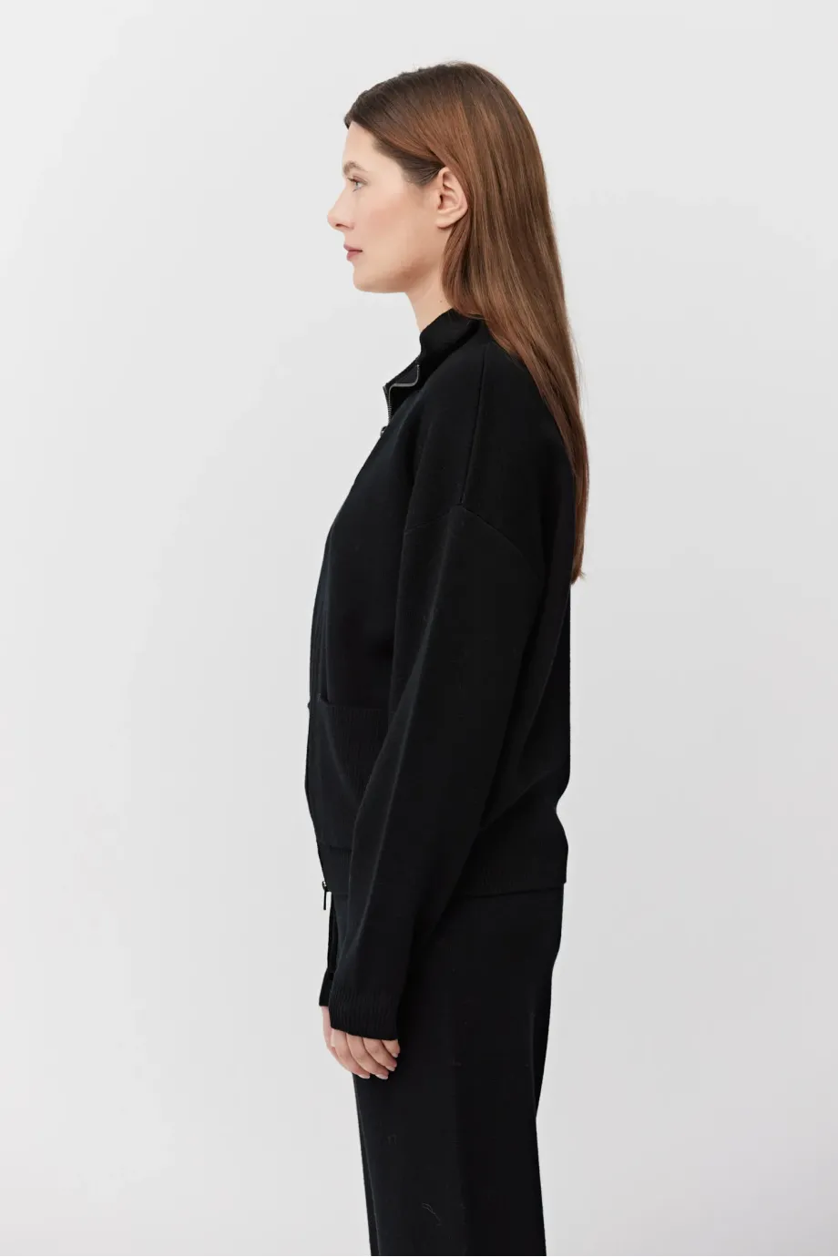Jacke aus Merinowolle. Verschluss mit silberfarbenem Zwei-Wege-Reißverschluss. Lange Ärmel, Stehkragen, Taschen. Gerader, lockerer Schnitt. Weiches Gestrick im Milano-Stich, gefertigt auf einer Maschine mit 12 GG Feinheit. Farbe Schwarz. Passend dazu Hose erhältlich.