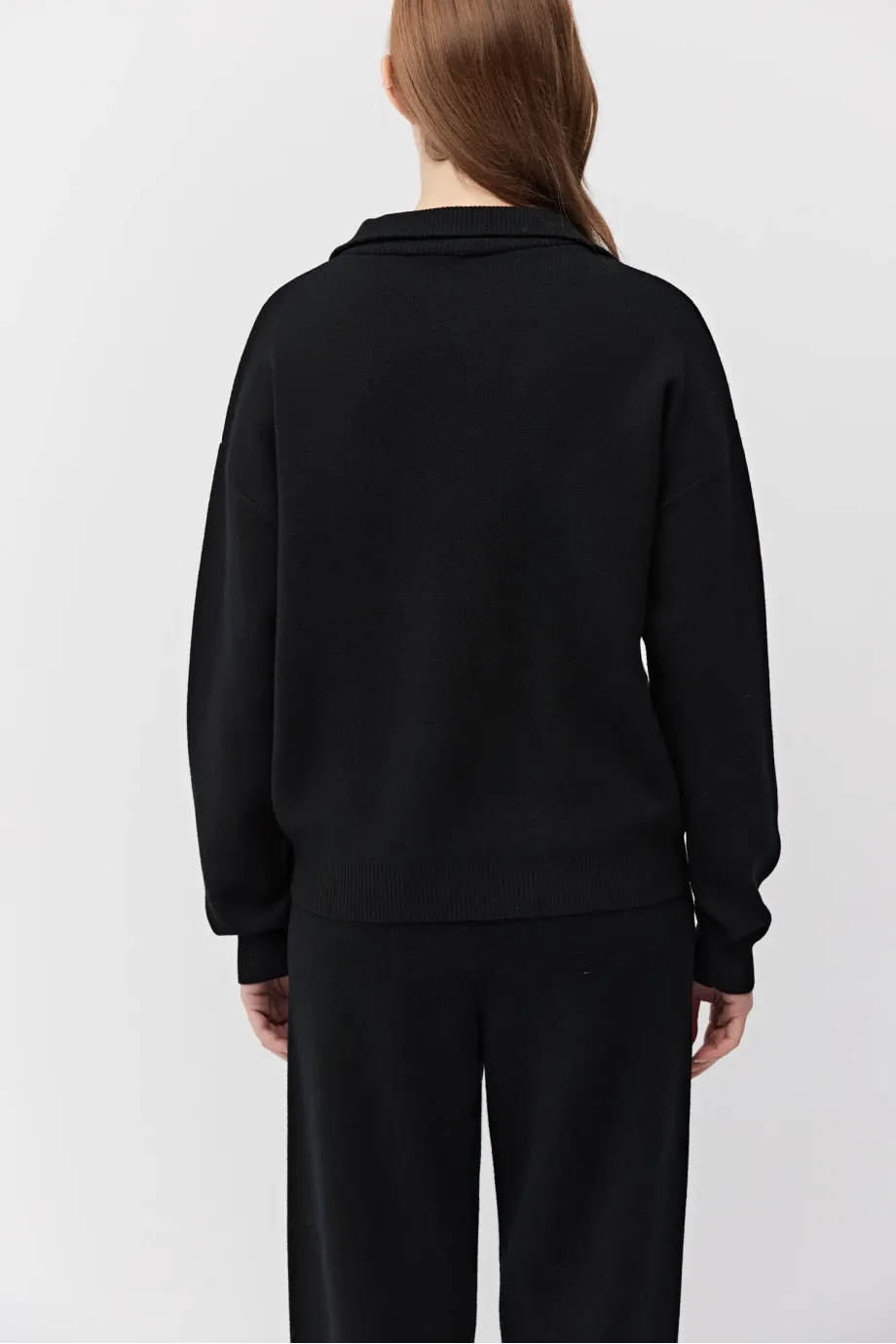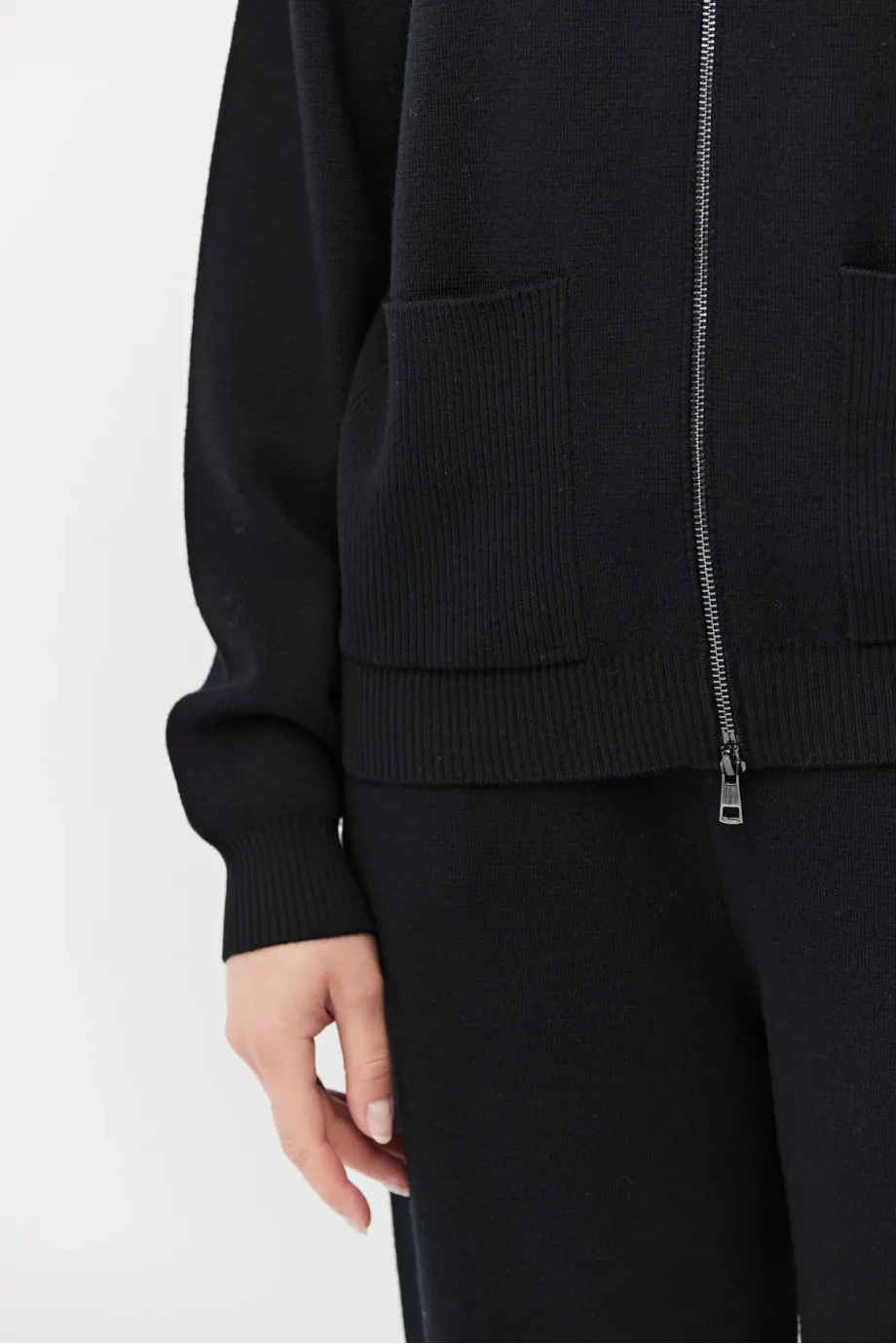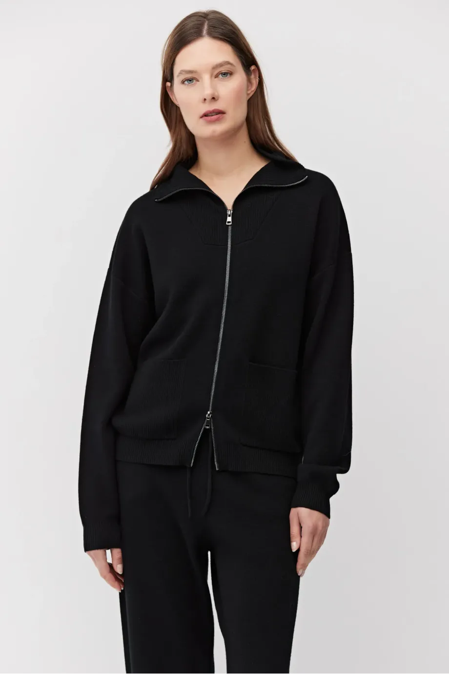 Jacke aus Merinowolle. Verschluss mit silberfarbenem Zwei-Wege-Reißverschluss. Lange Ärmel, Stehkragen, Taschen. Gerader, lockerer Schnitt. Weiches Gestrick im Milano-Stich, gefertigt auf einer Maschine mit 12 GG Feinheit. Farbe Schwarz. Passend dazu Hose erhältlich.
