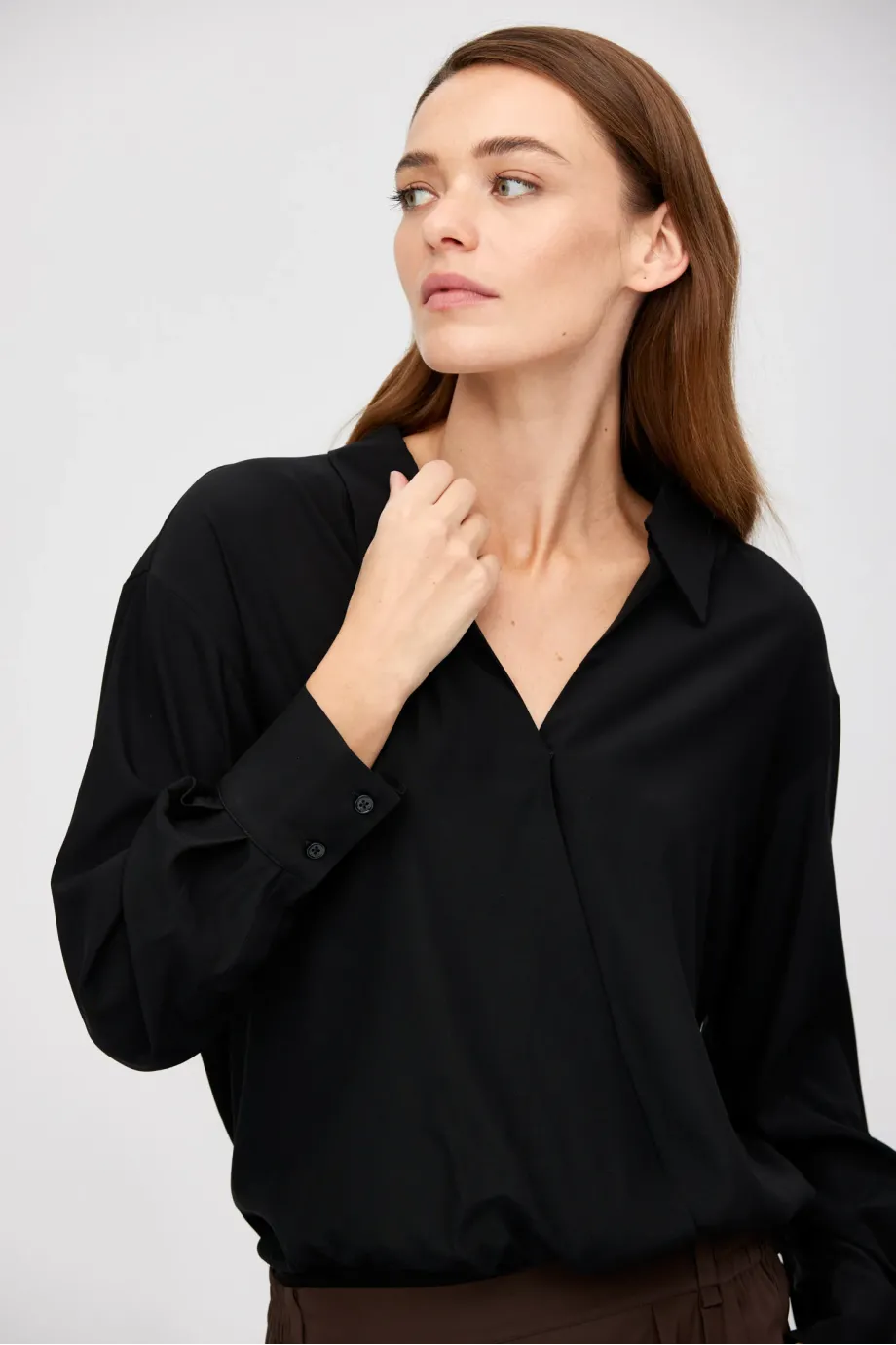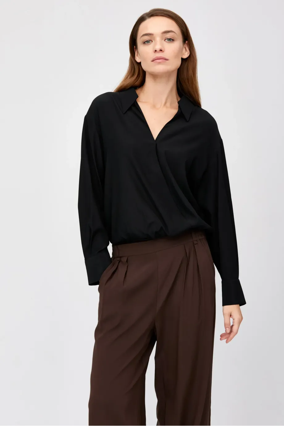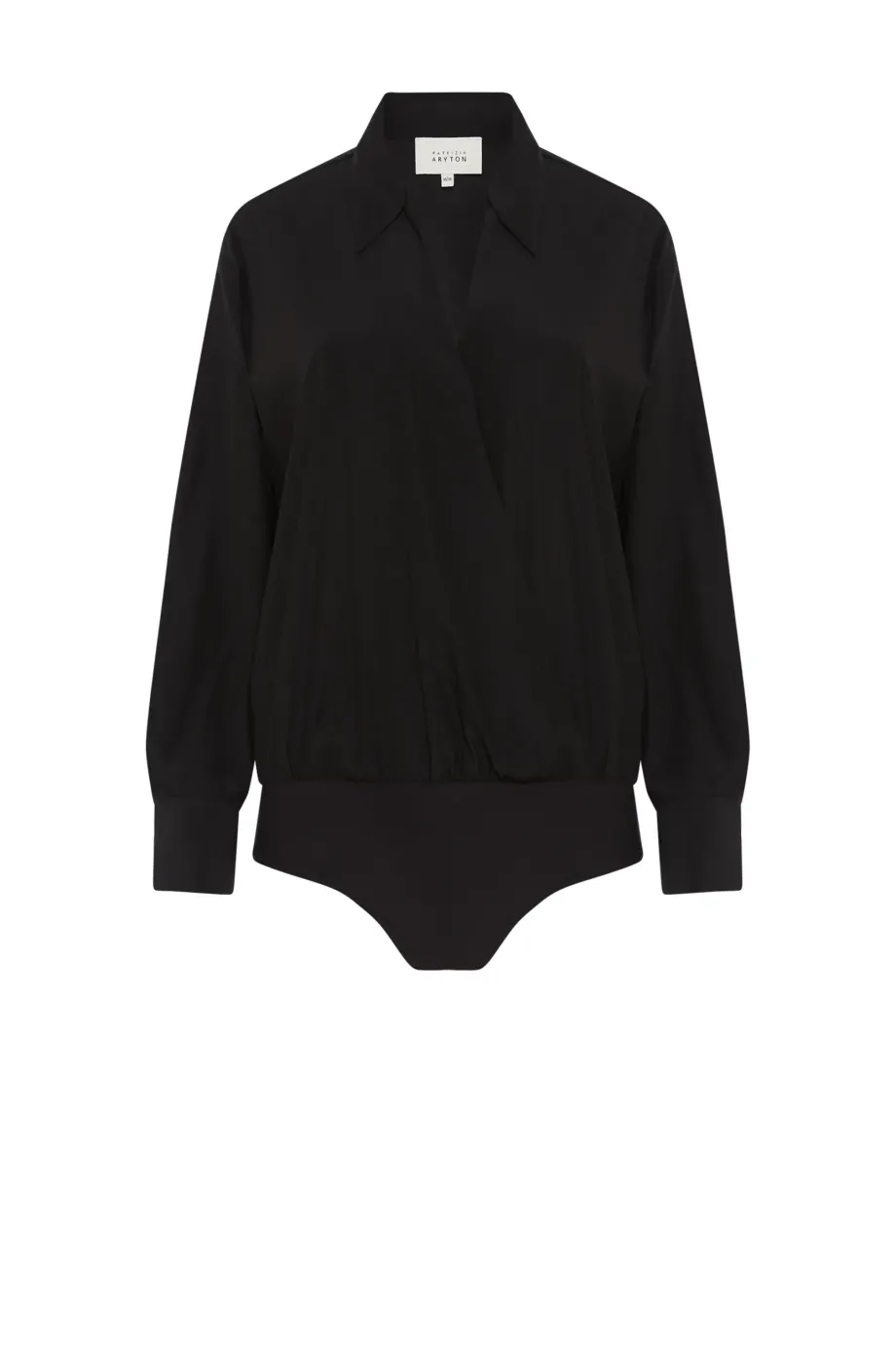 Schwarzer Seidenbody. Langer Ärmel mit Manschette, Kragen. Oben locker, Wickelstil.