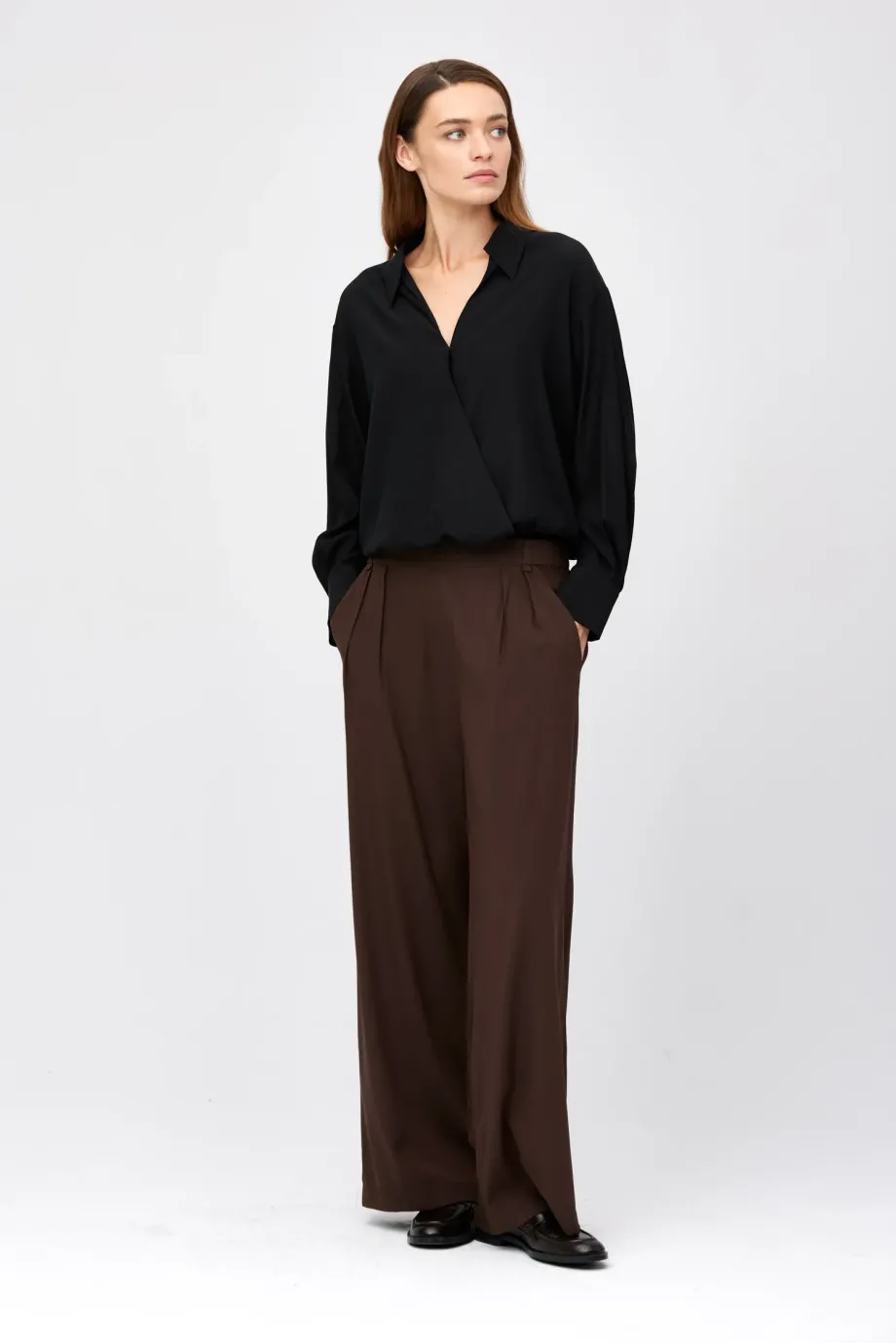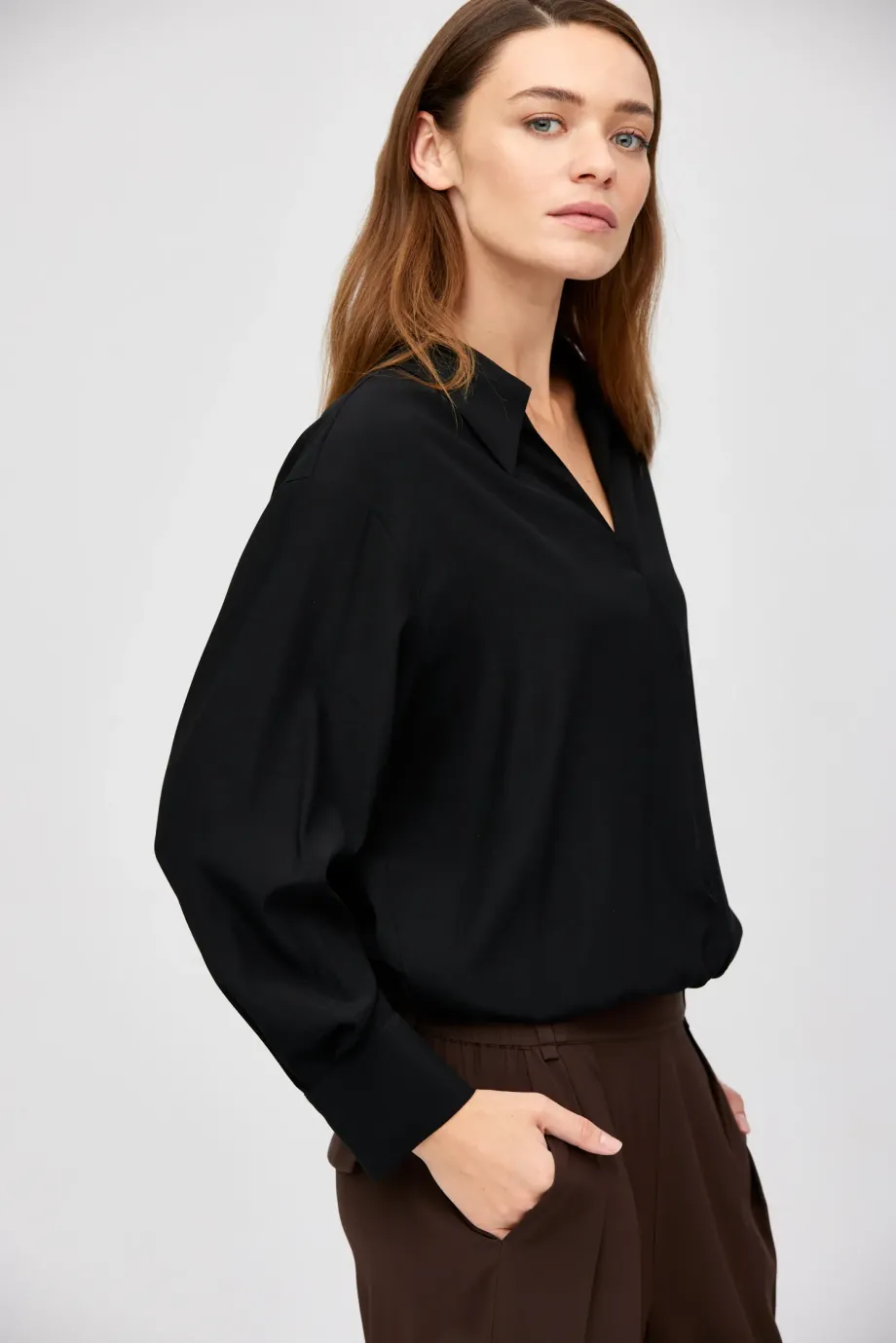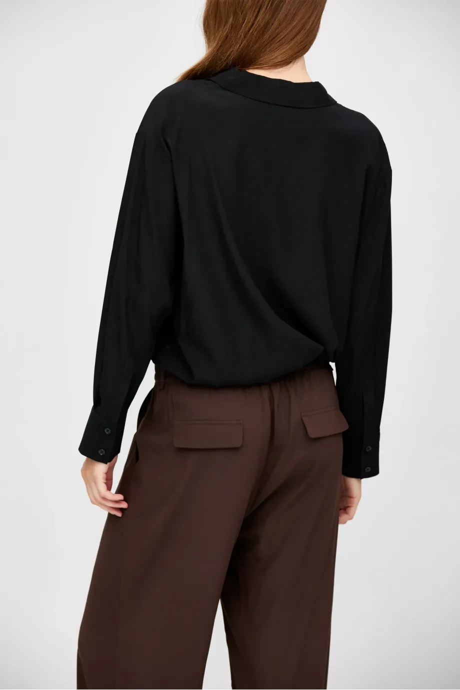 Schwarzer Seidenbody. Langer Ärmel mit Manschette, Kragen. Oben locker, Wickelstil.