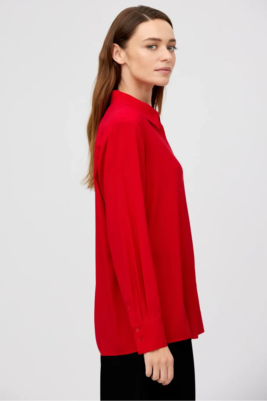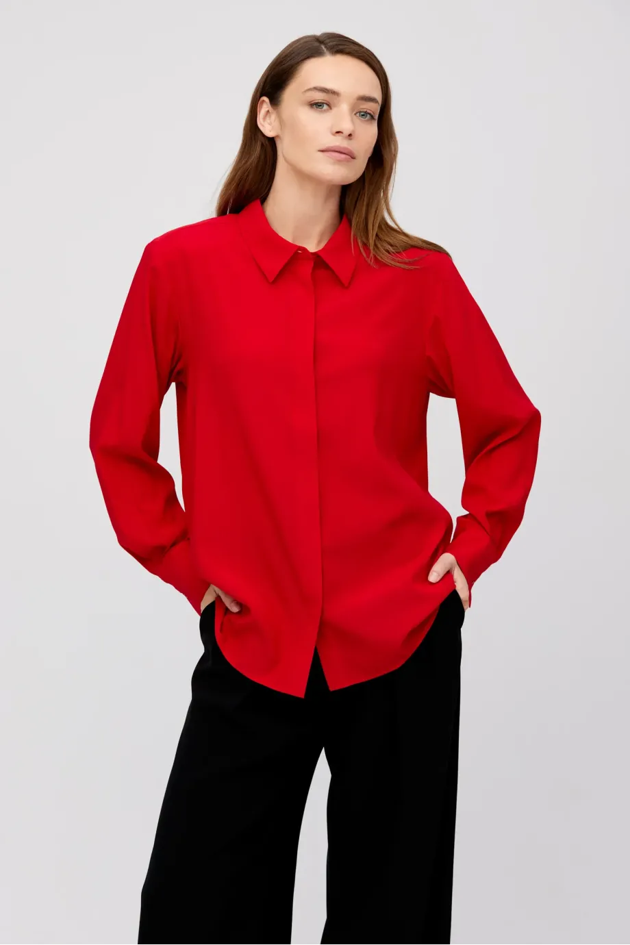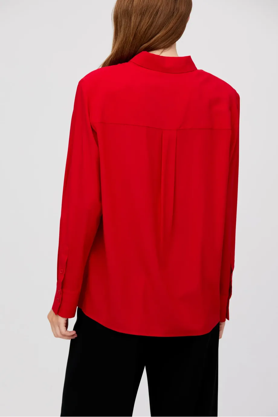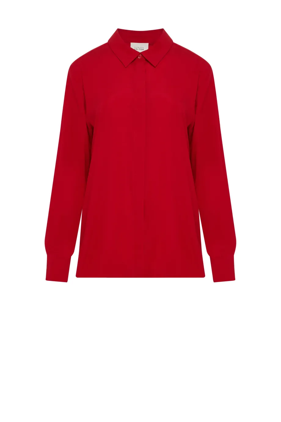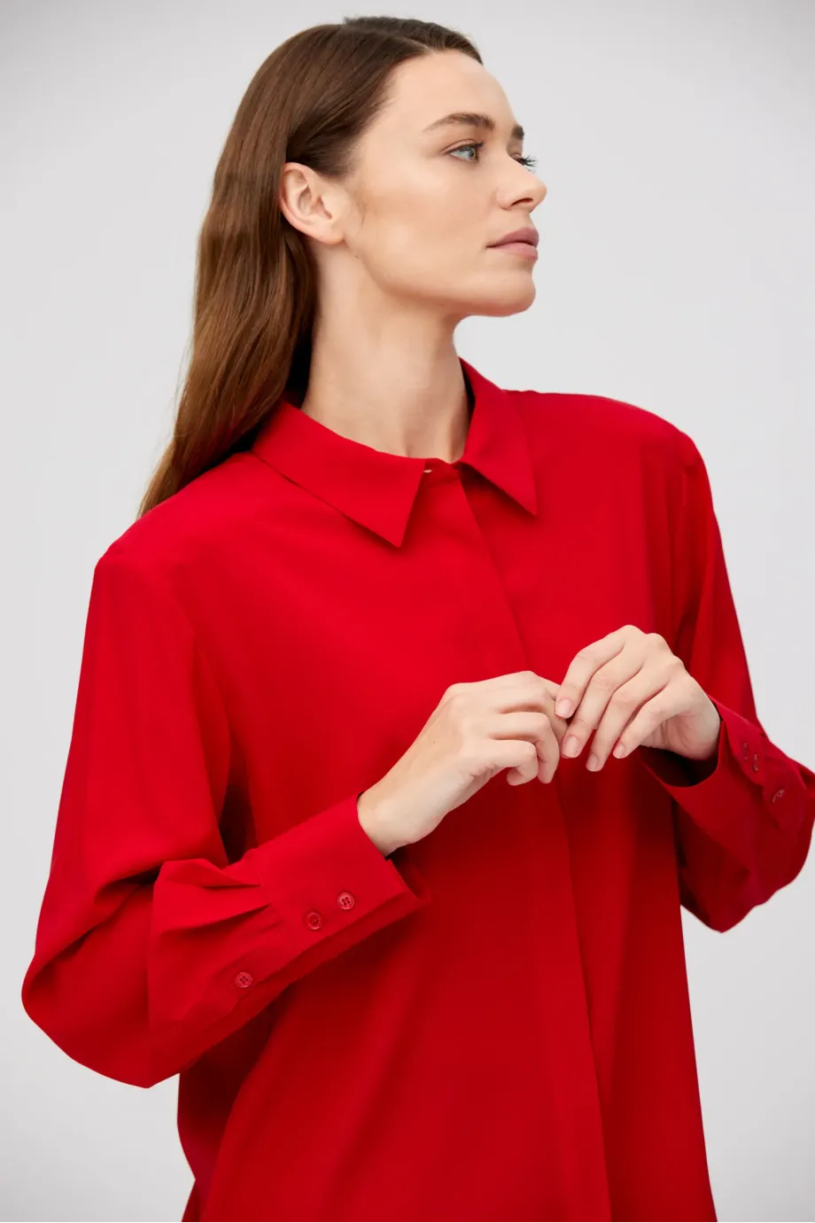 Seidenbluse. Lange Ärmel, Knopfverschluss aus Perlmutt. Schlichte Passform, mit einer Kellerfalte hinten. Farbe rot.