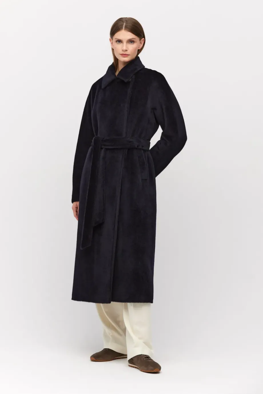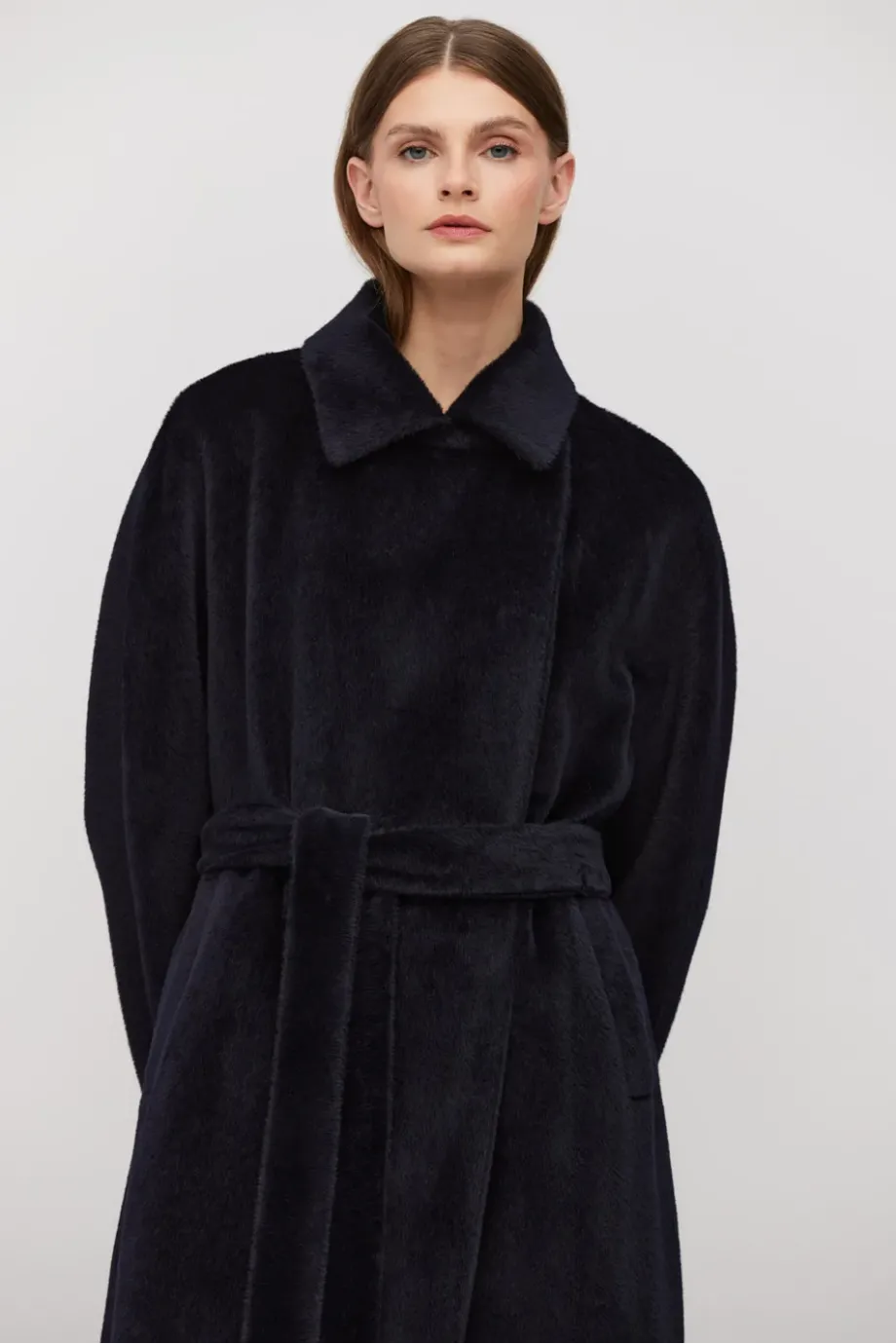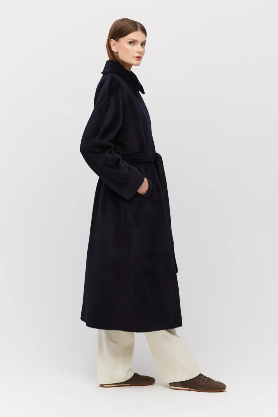 Dunkelblauer Mantel mit Gürtel aus Baby-Suri-Alpaka