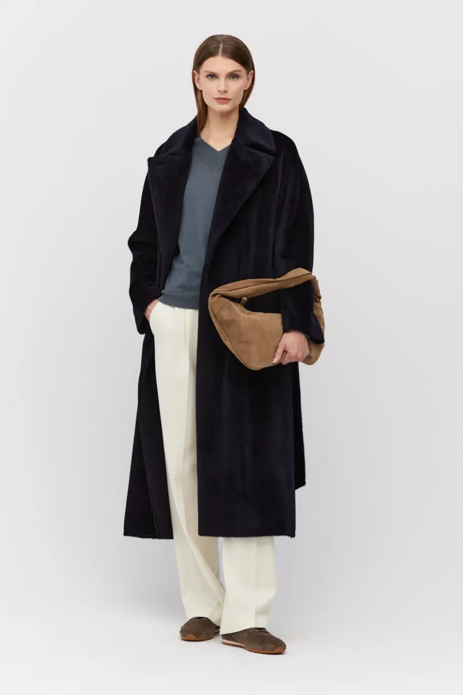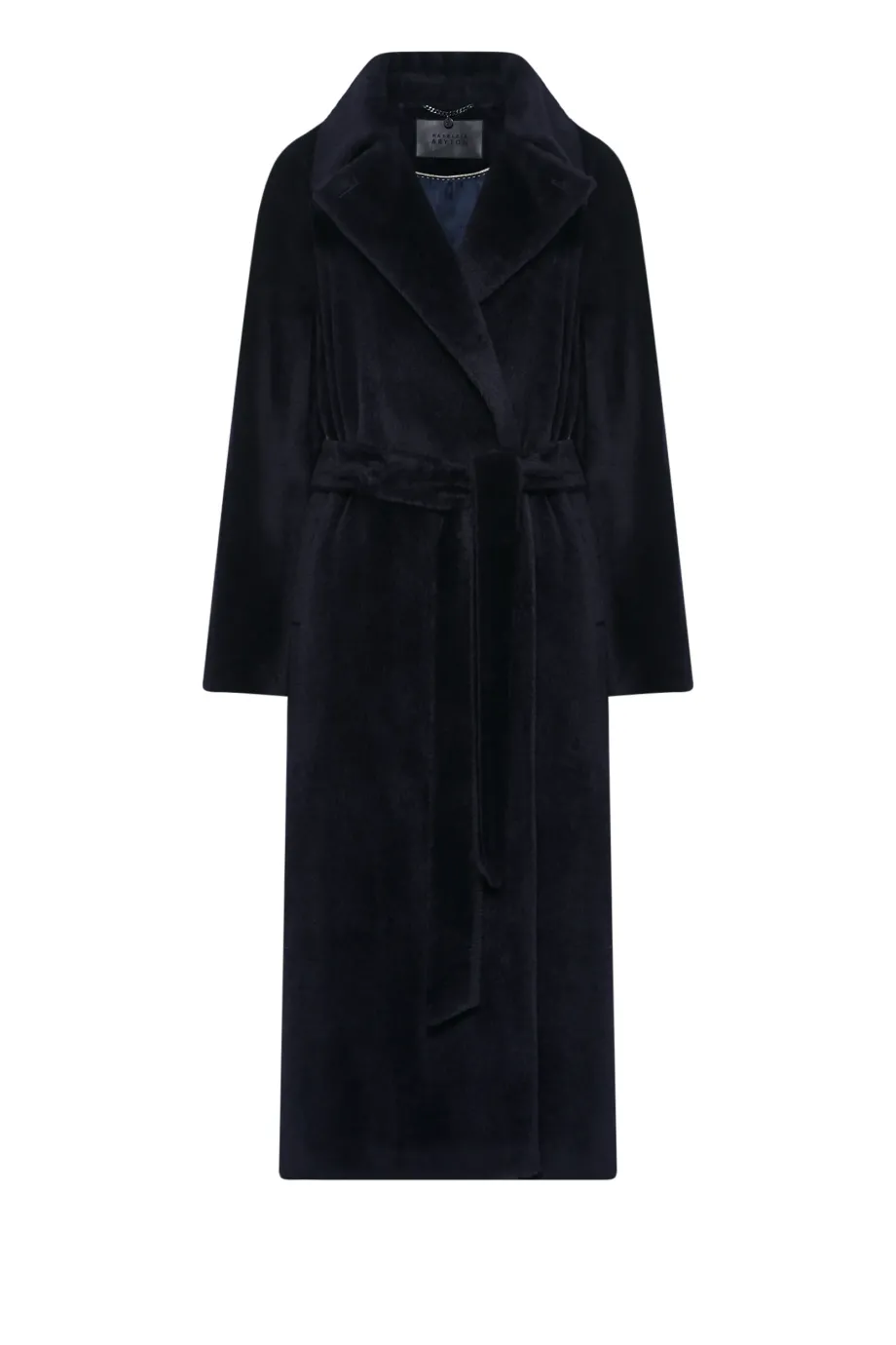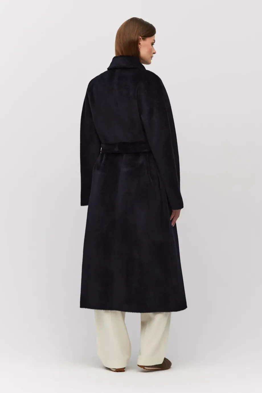 Dunkelblauer Mantel mit Gürtel aus Baby-Suri-Alpaka