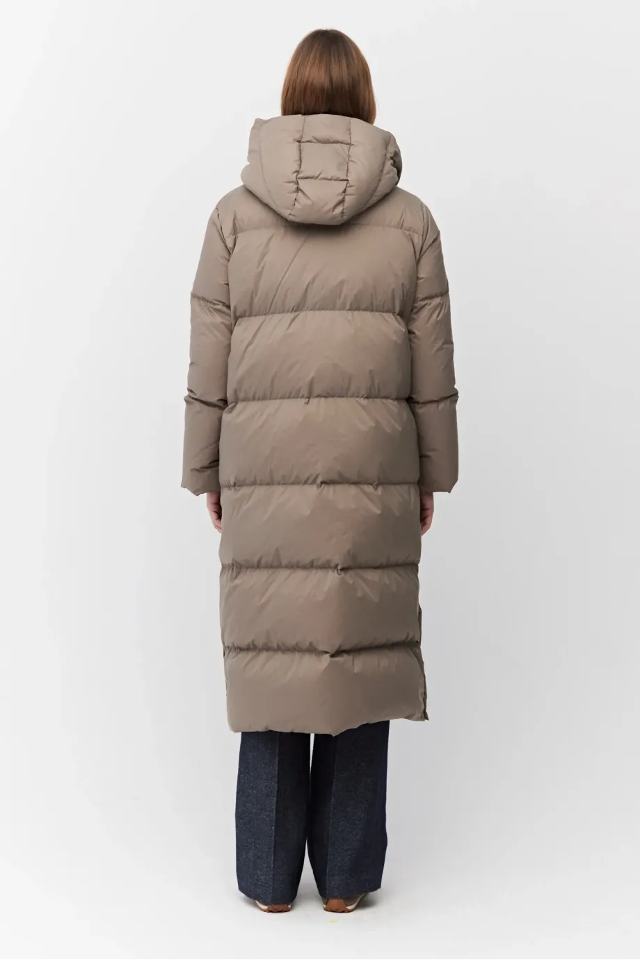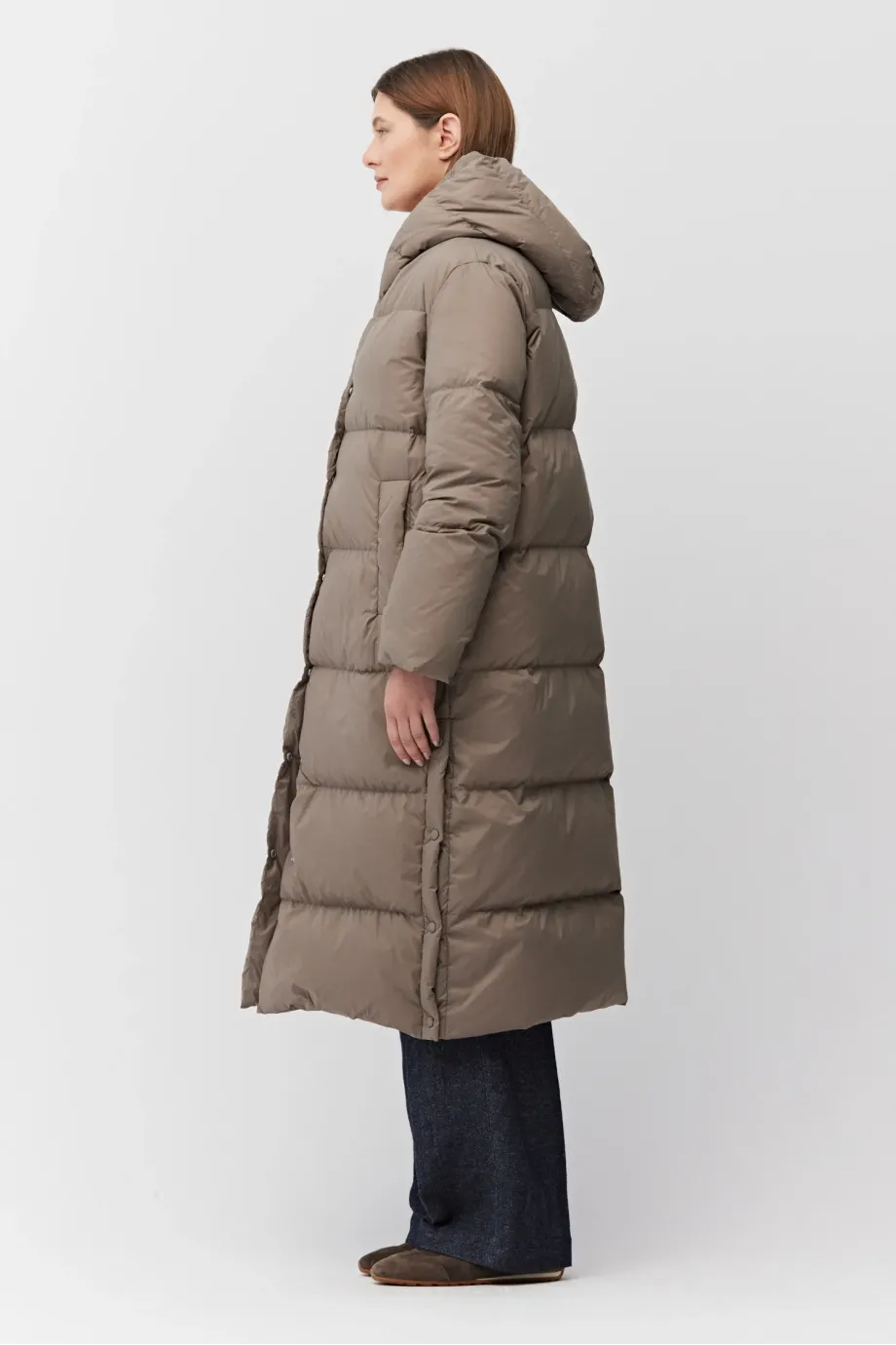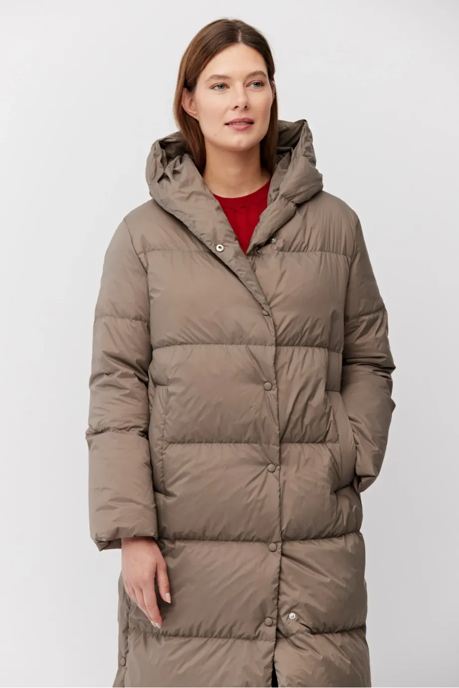 Langer Mantel mit Kapuze, gefüllt mit natürlicher Daune. Lockere Passform, Druckknopfverschluss, Kapuze, Taschen. Farbe Beige.
