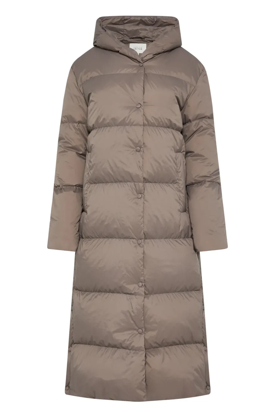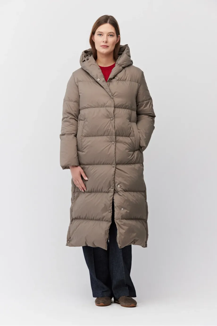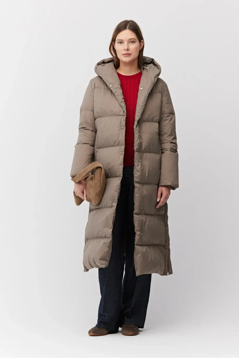 Langer Mantel mit Kapuze, gefüllt mit natürlicher Daune. Lockere Passform, Druckknopfverschluss, Kapuze, Taschen. Farbe Beige.