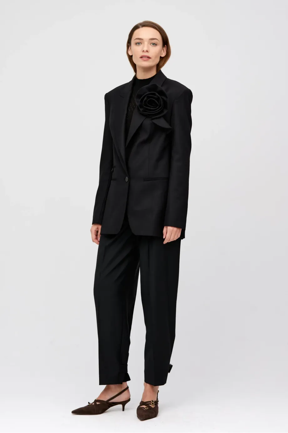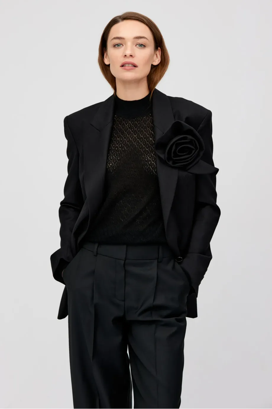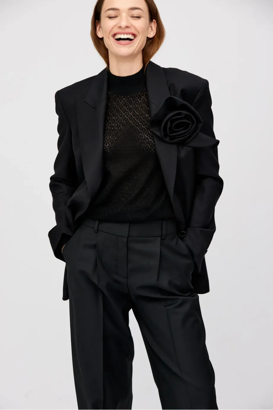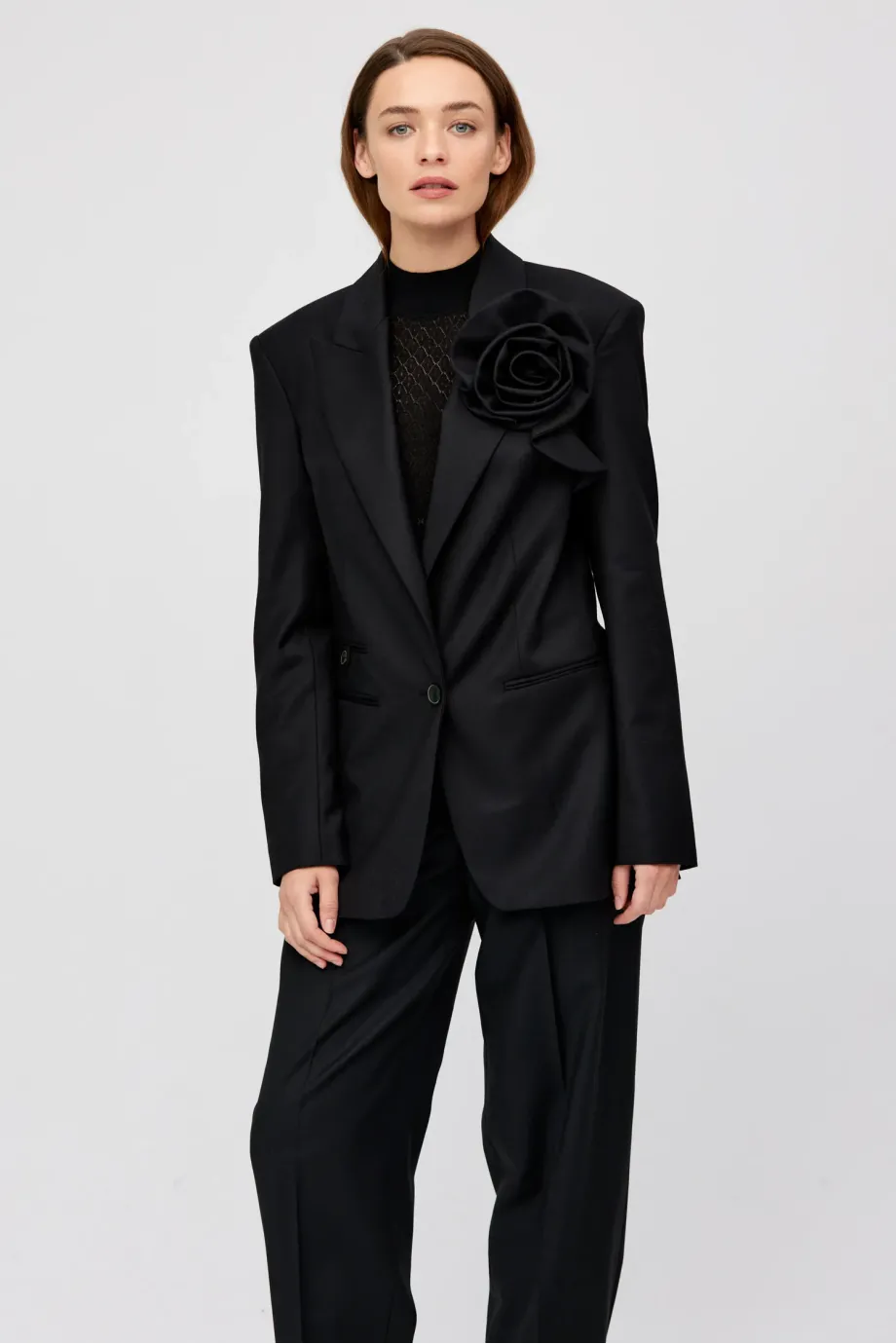 Blazer aus Schafwolle für den Anzug. Mit Knopfverschluss, leicht tailliert, mit betonter Schulterlinie. Lange Ärmel. Modell mit Futter, mit dekorativem Piping. Farbe schwarz. Im Set eine abnehmbare Blume. Zur Ergänzung des Looks passende Hose aus demselben Stoff.