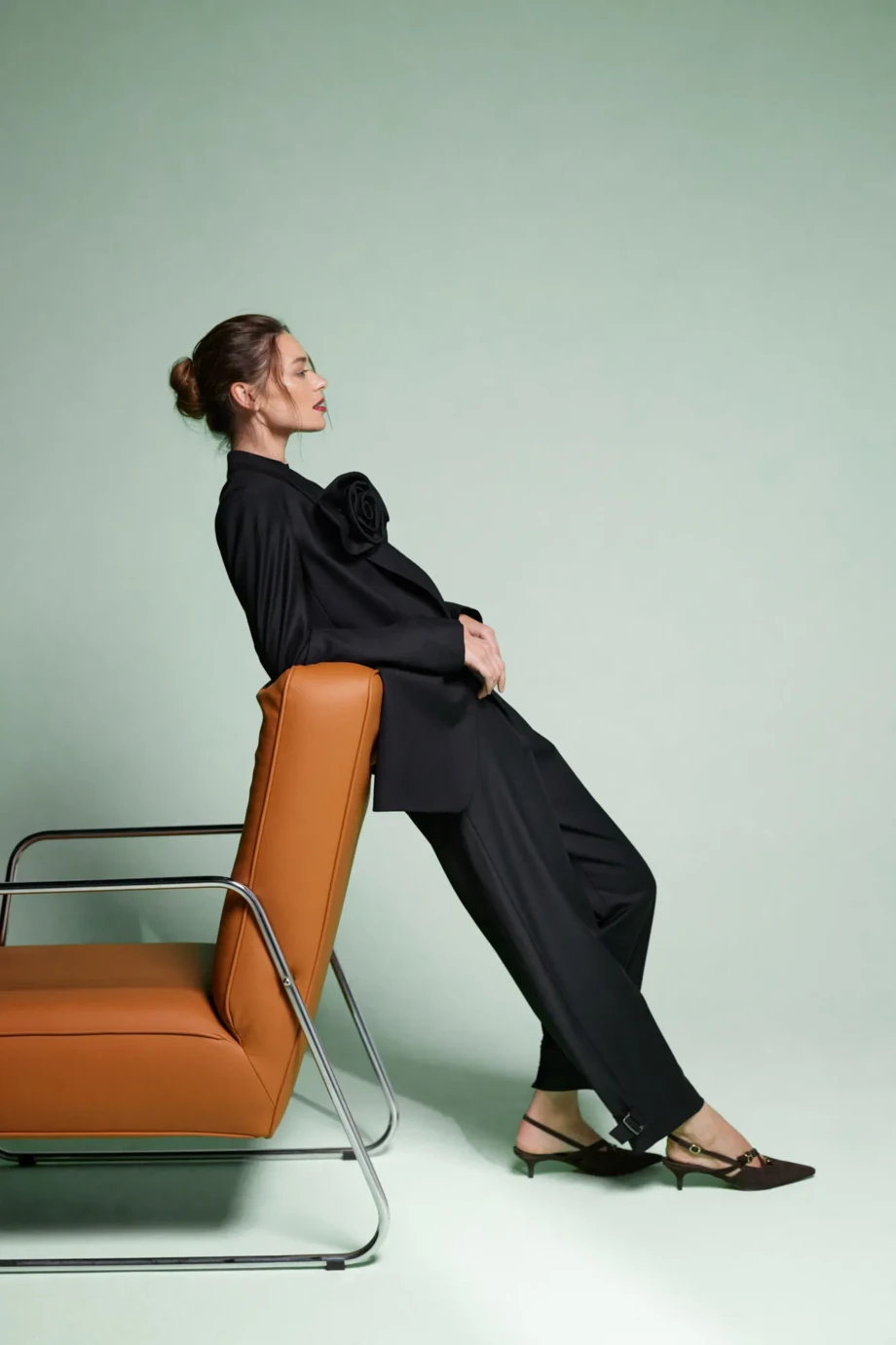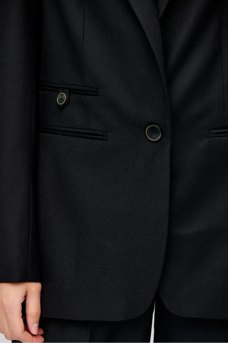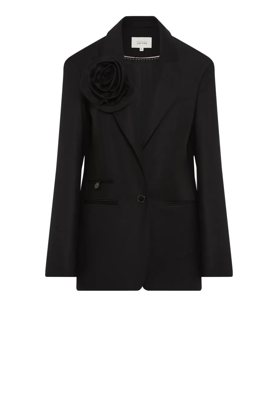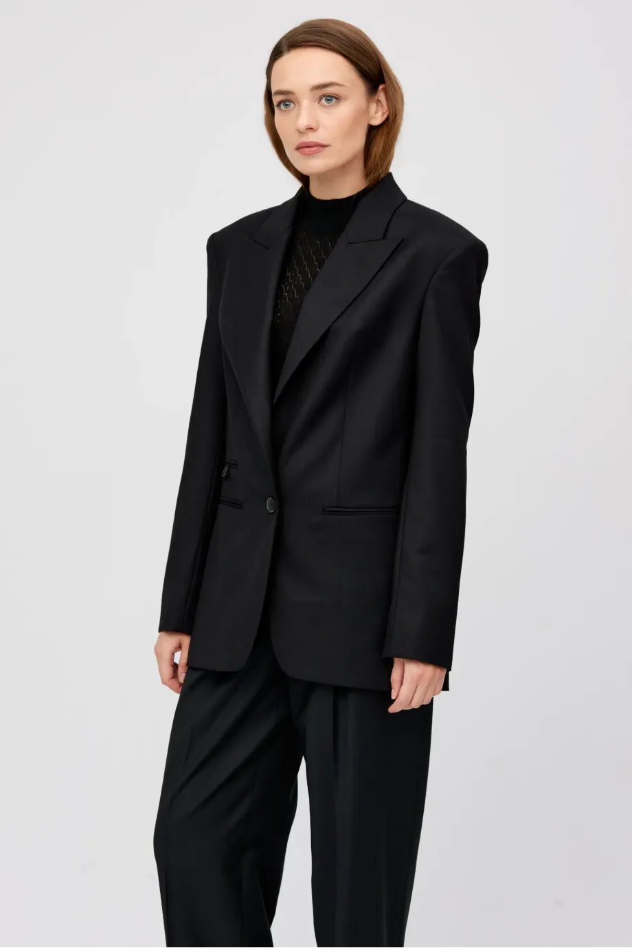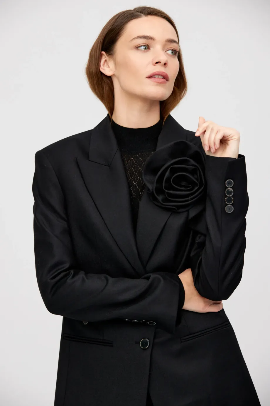 Blazer aus Schafwolle für den Anzug. Mit Knopfverschluss, leicht tailliert, mit betonter Schulterlinie. Lange Ärmel. Modell mit Futter, mit dekorativem Piping. Farbe schwarz. Im Set eine abnehmbare Blume. Zur Ergänzung des Looks passende Hose aus demselben Stoff.