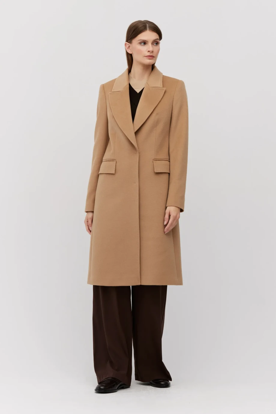 Mantel im Diplomatenstil in Kamelfarbe, gefüttert, figurbetont geschnitten. Einreihig, Midi-Länge, mit großem Kragen, Taschen und eingesetzten Ärmeln. Innenseite mit Zierpaspelierung.