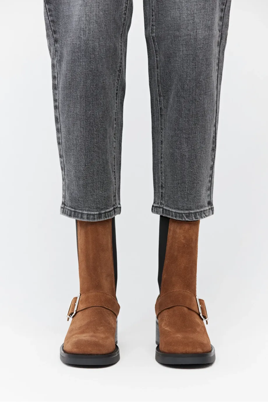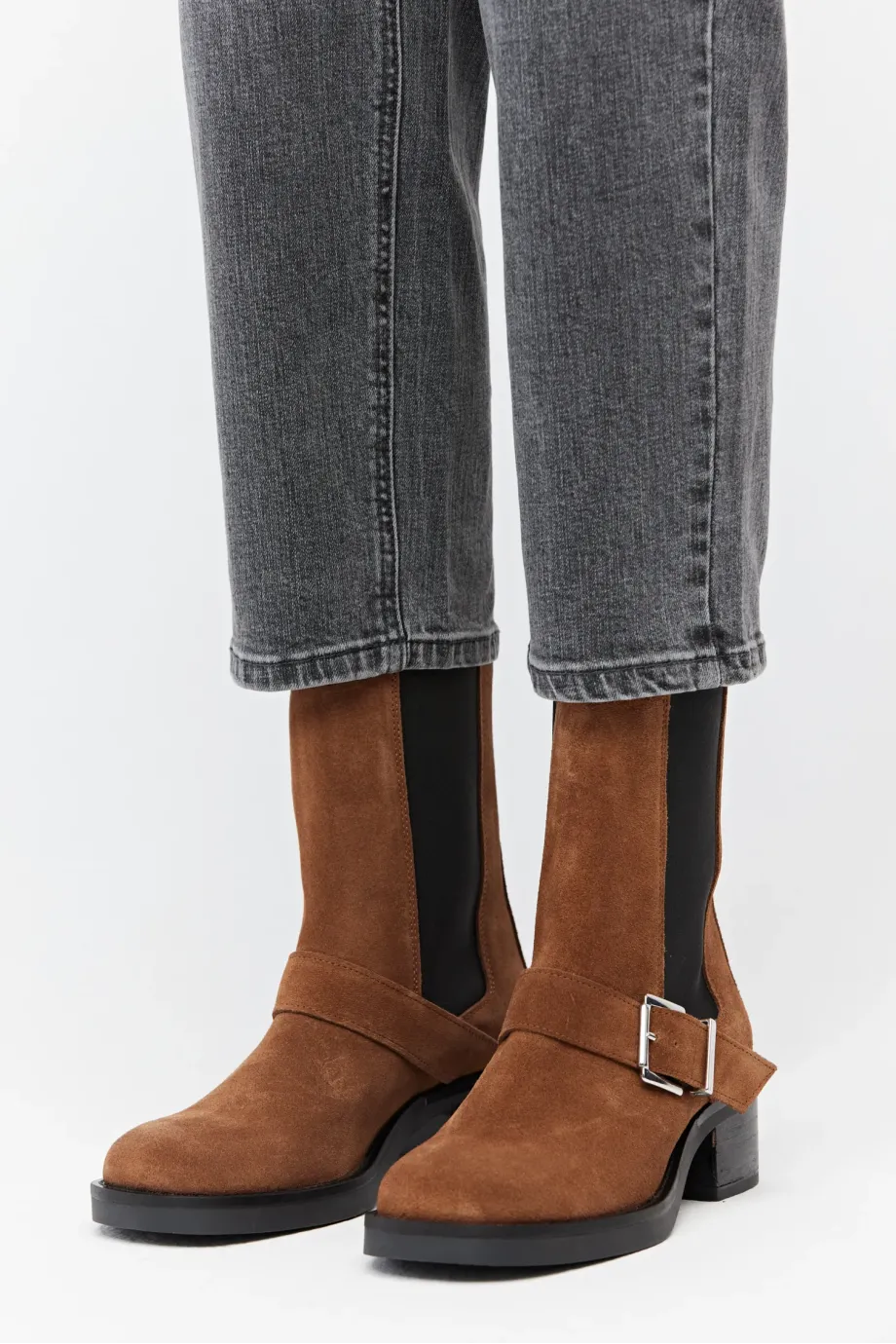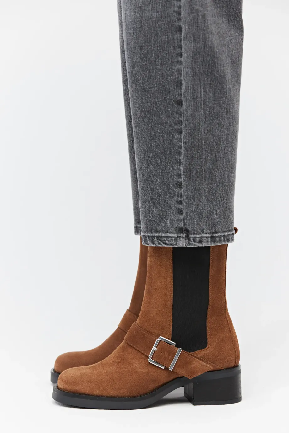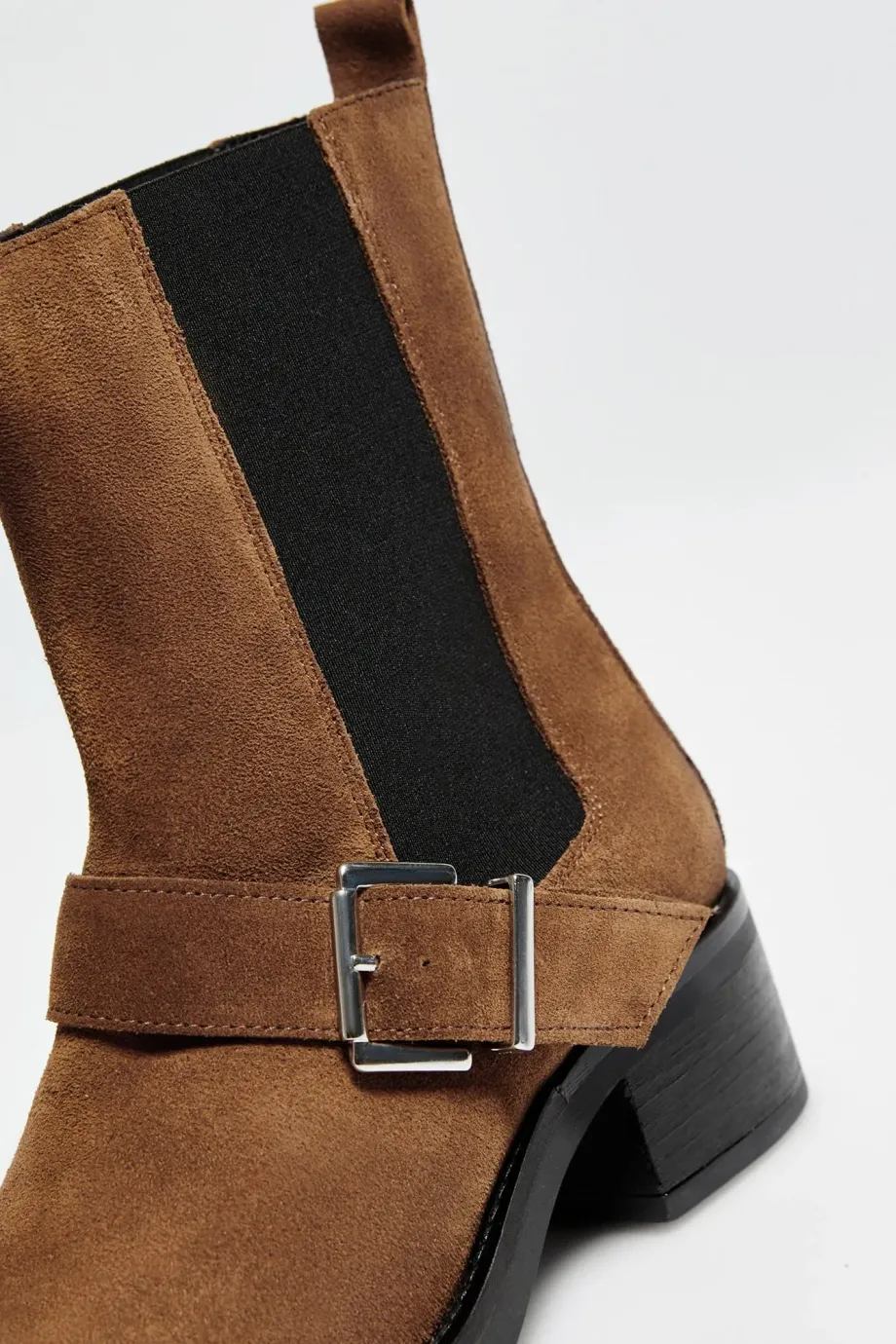 Boots aus Veloursleder. Hoher Schaft, eckige Zehenpartie und Absatz. Farbe: Braun. Elastische Einsätze an den Seiten. Schnalle in Silber. Handgefertigt in einer portugiesischen Manufaktur.