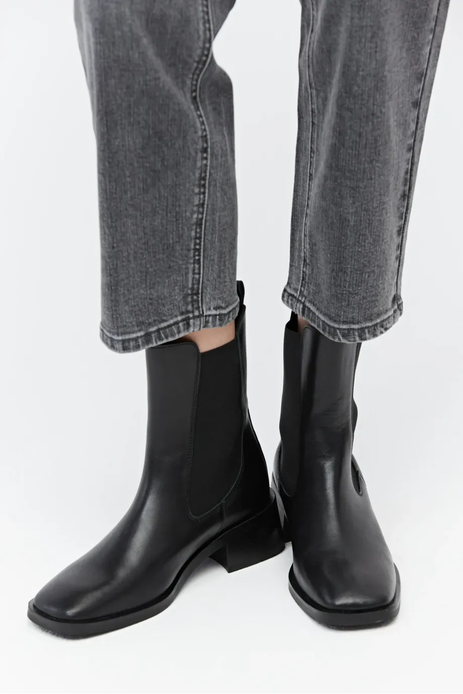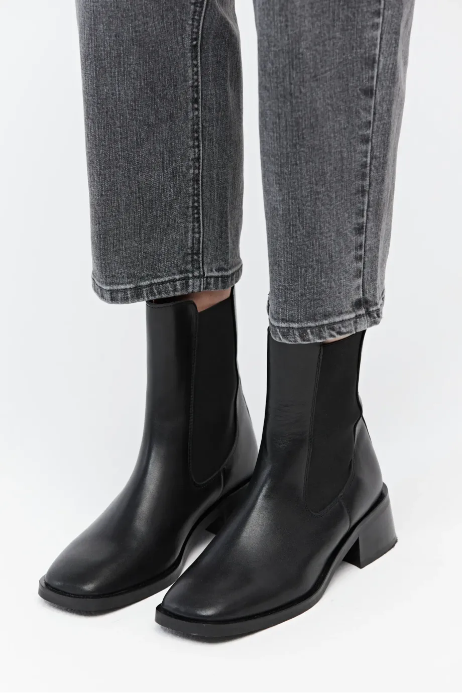 Schwarze Stiefeletten mit quadratischer Spitze. Hoher Schaft aus Glattleder, niedriger Absatz. Elastische Einsätze an den Seiten. Handgefertigt in einer portugiesischen Manufaktur.