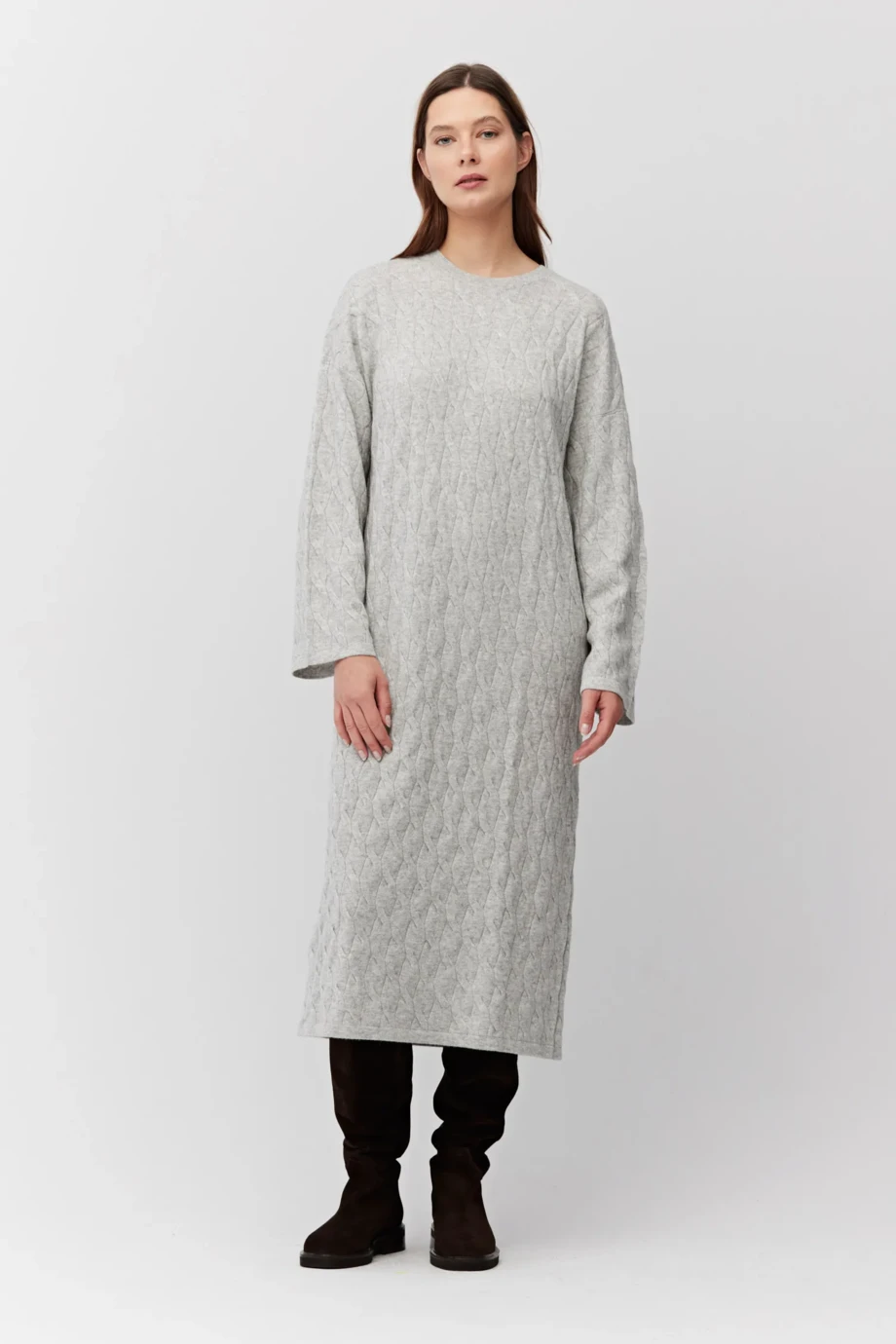 Graues Kleid aus Merinowolle und Kaschmir. Lange Ärmel, Rundhalsausschnitt. Midi-Länge. Weiches Gestrick im feinen Cable-Knit, gefertigt auf einer Maschine mit 12 GG Feinheit.