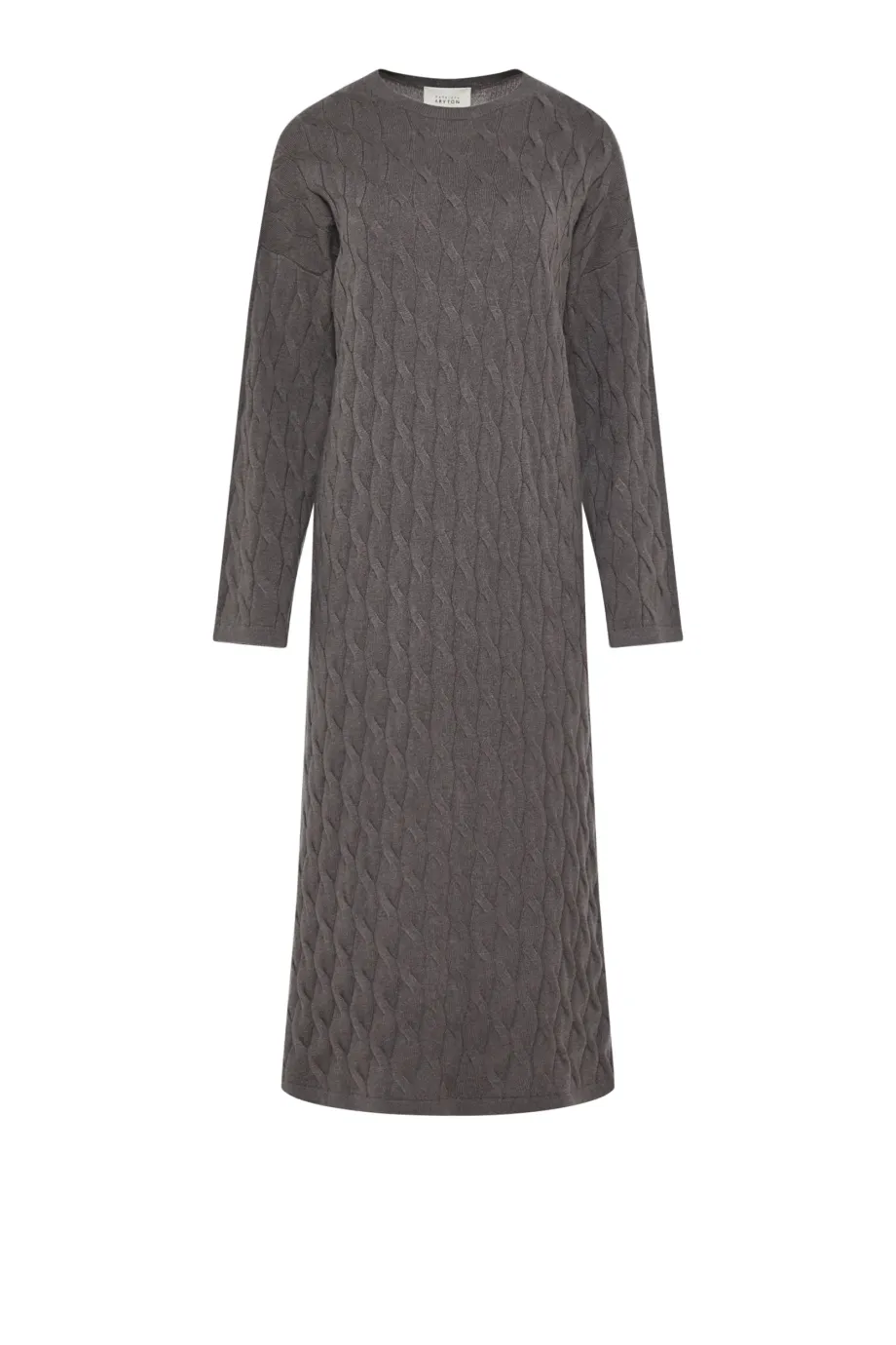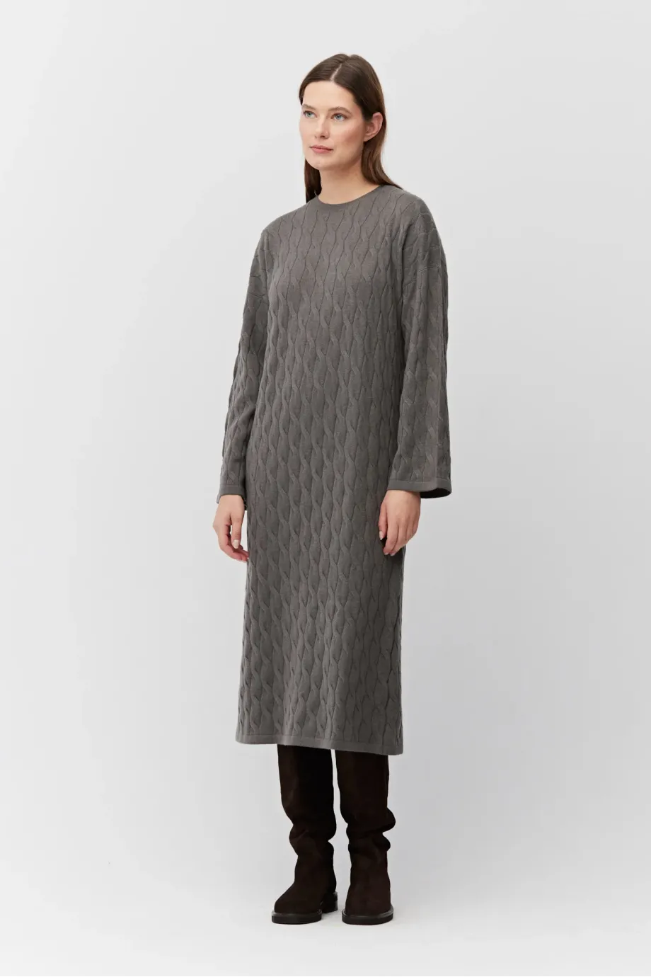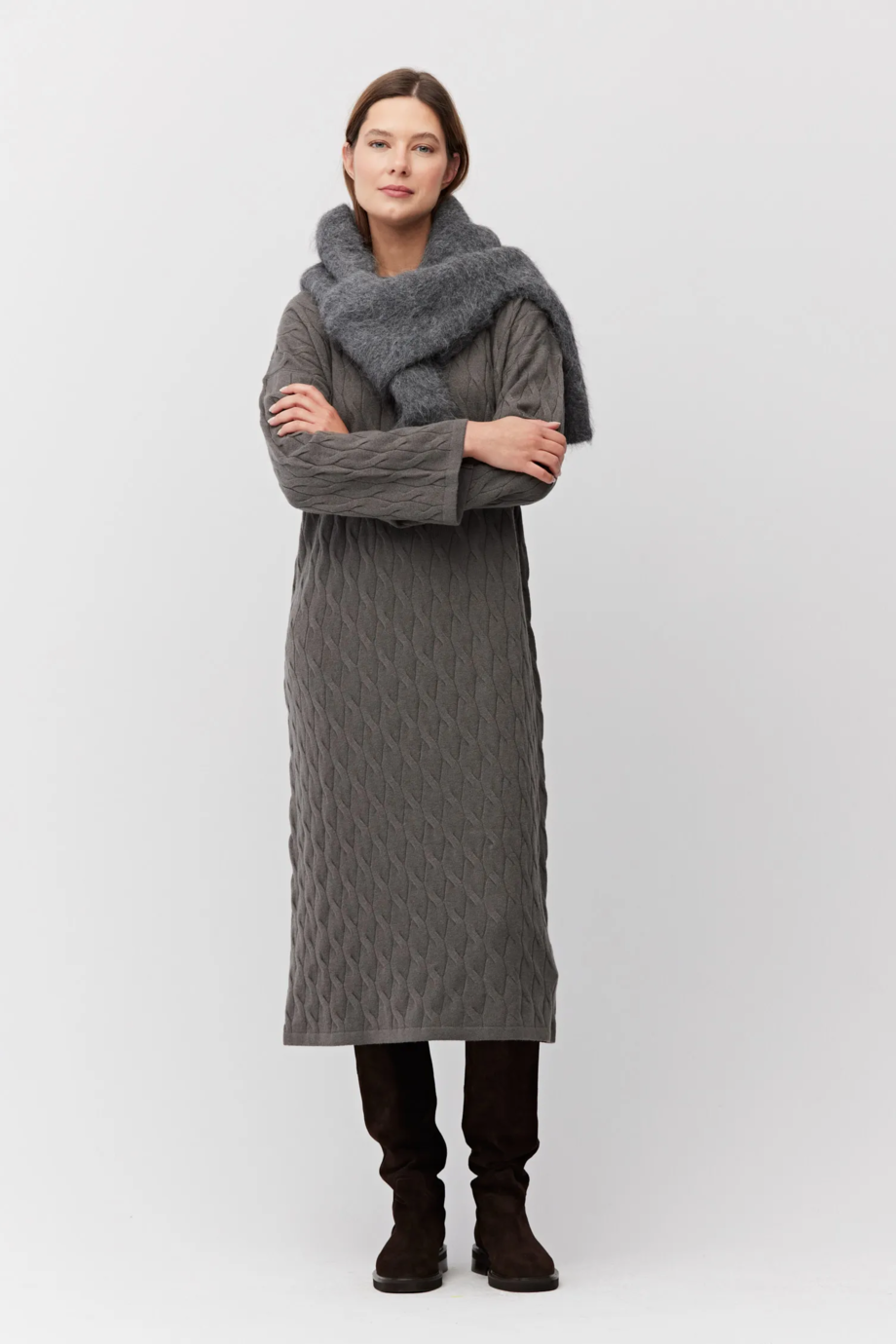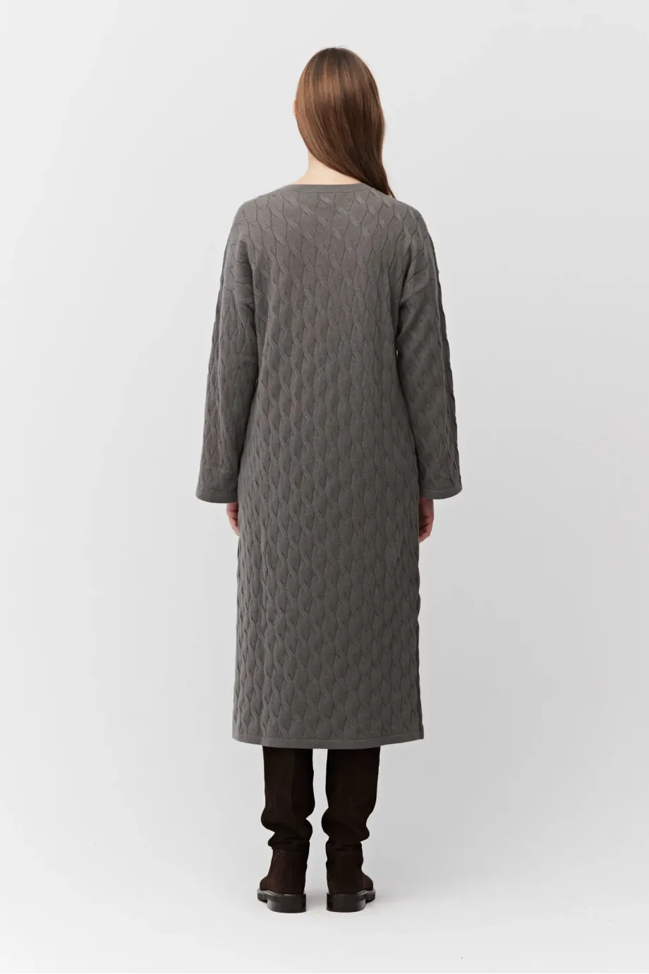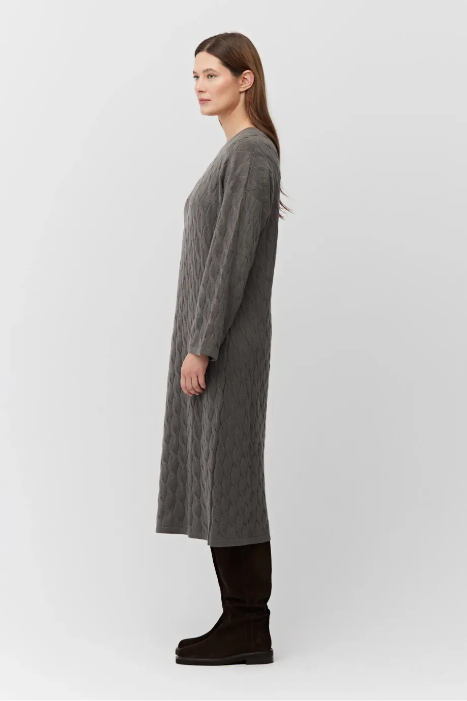 Braunes Kleid aus Merinowolle und Kaschmir. Lange Ärmel, Rundhalsausschnitt. Midi-Länge. Weiches Gestrick im feinen Cable-Knit, gefertigt auf einer Maschine mit 12 GG Feinheit.