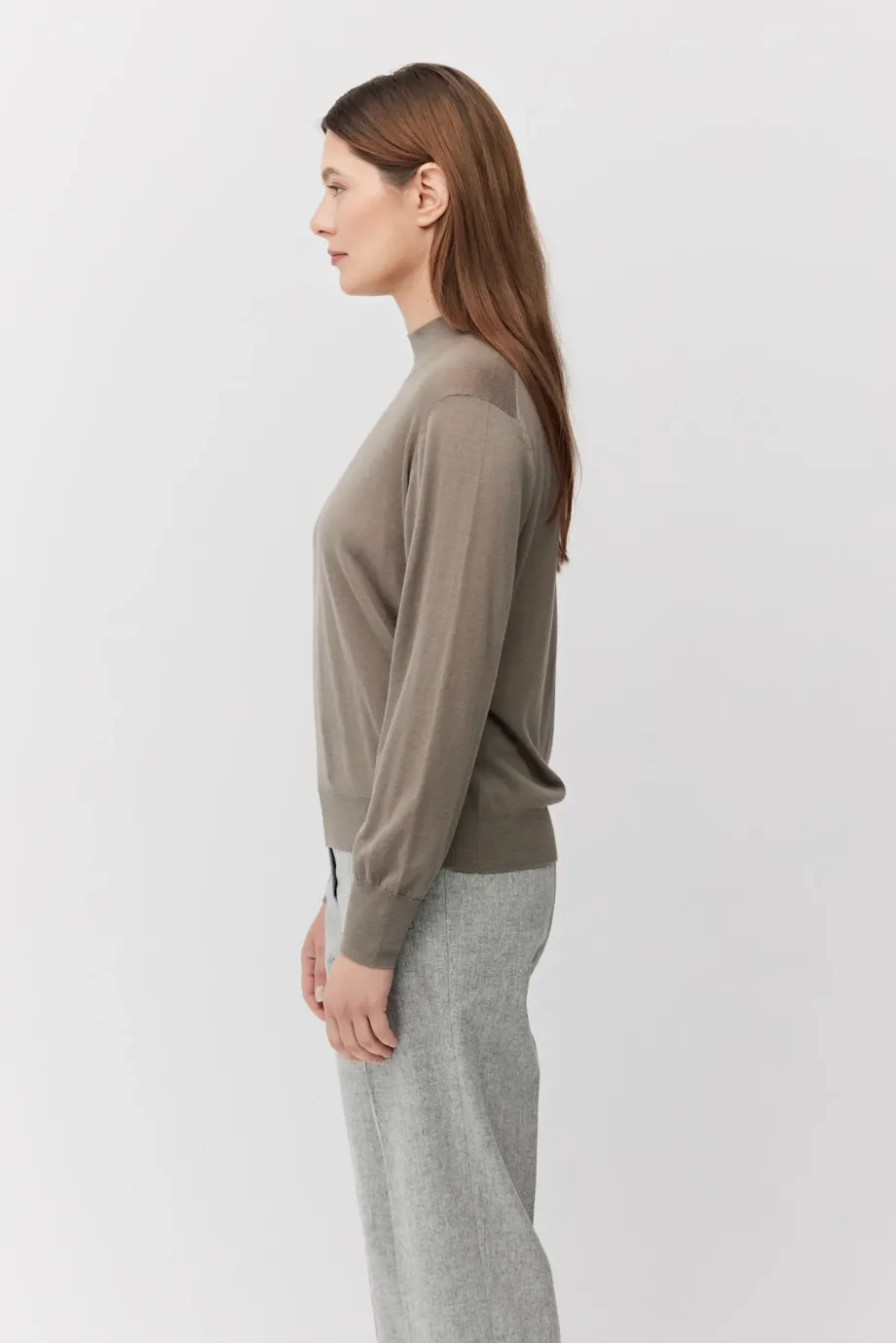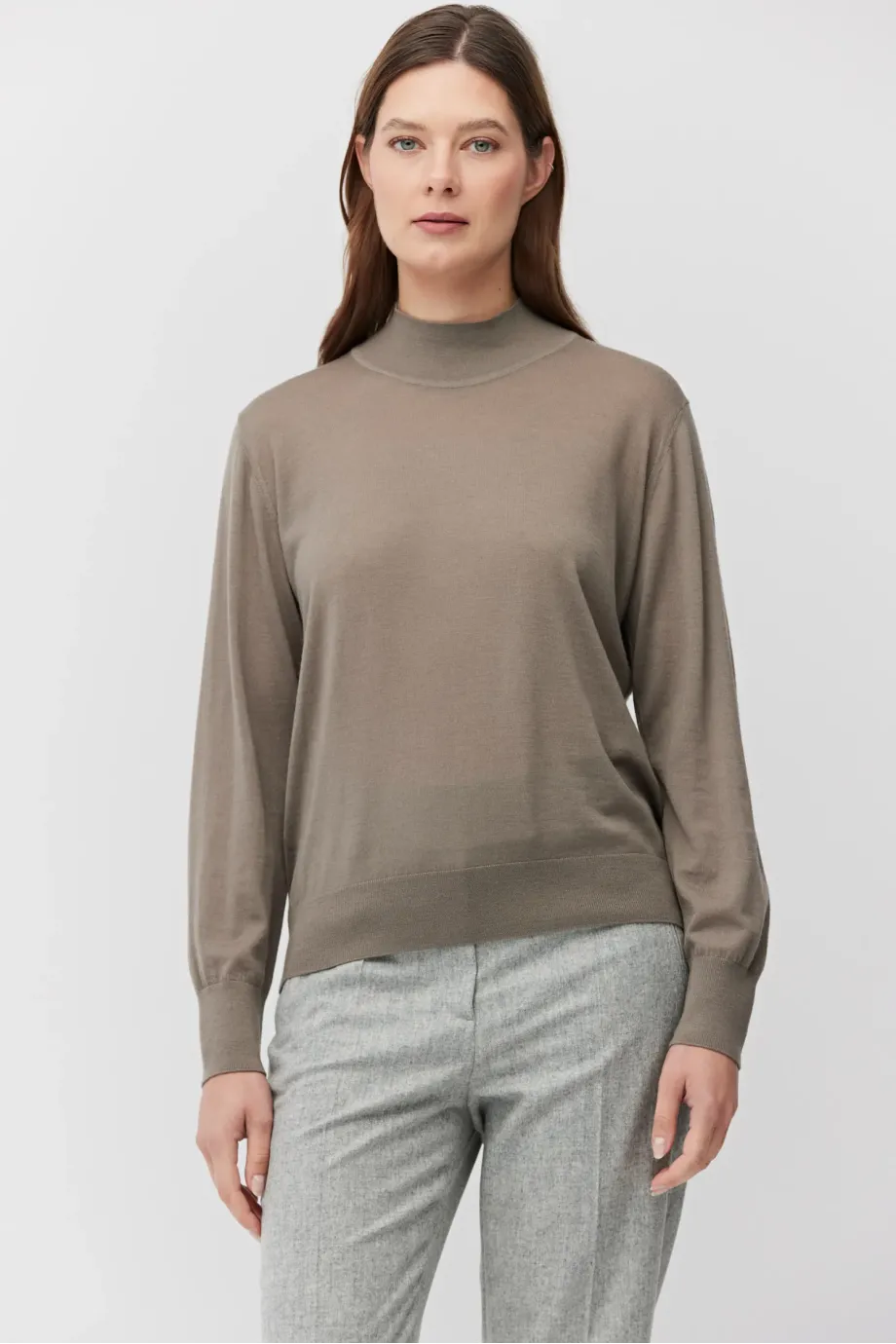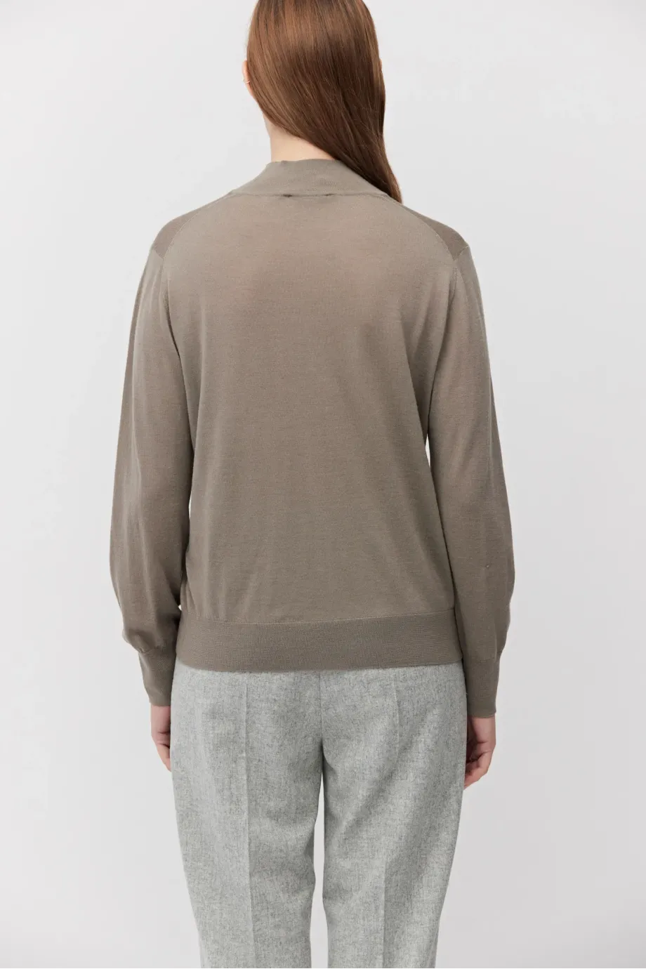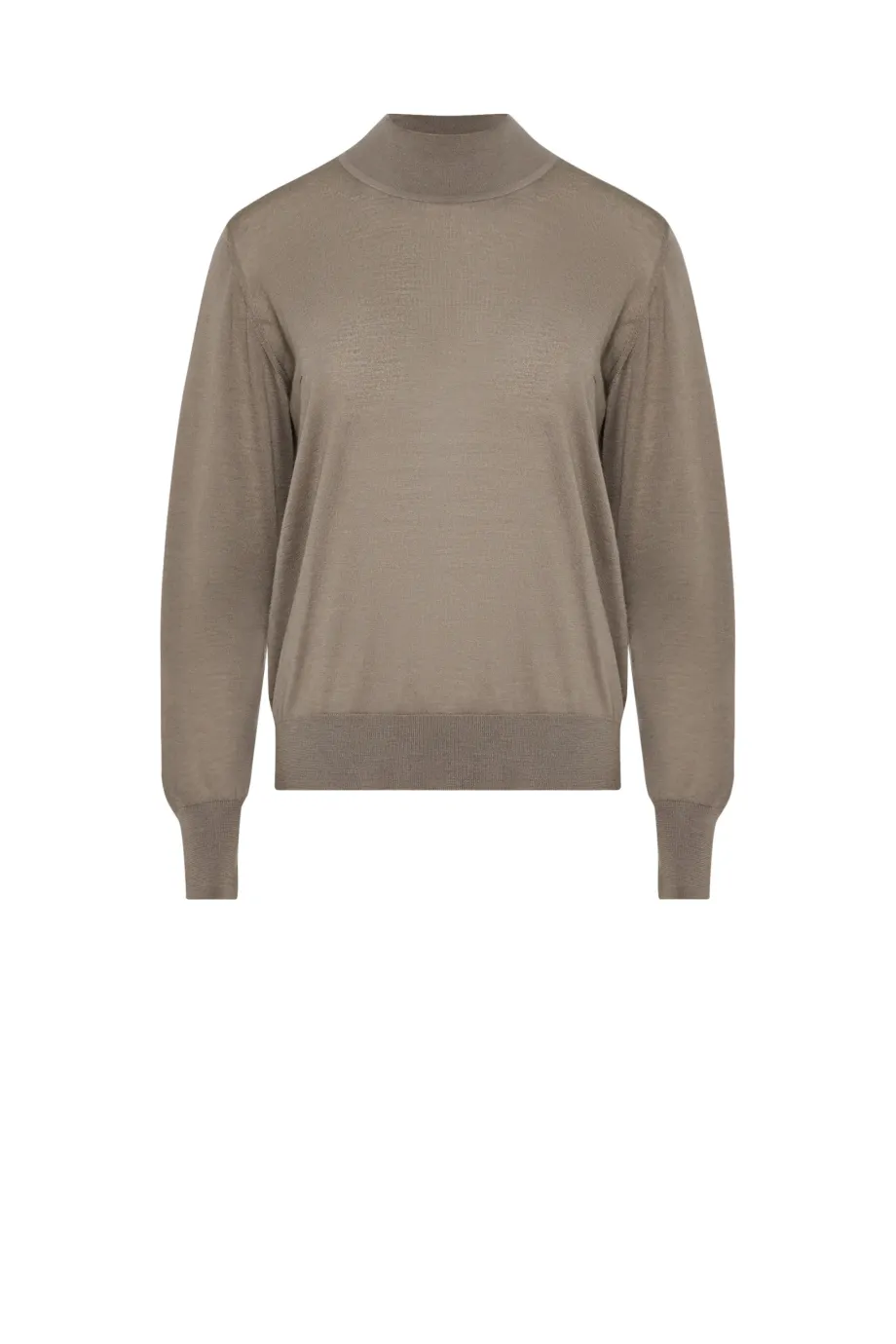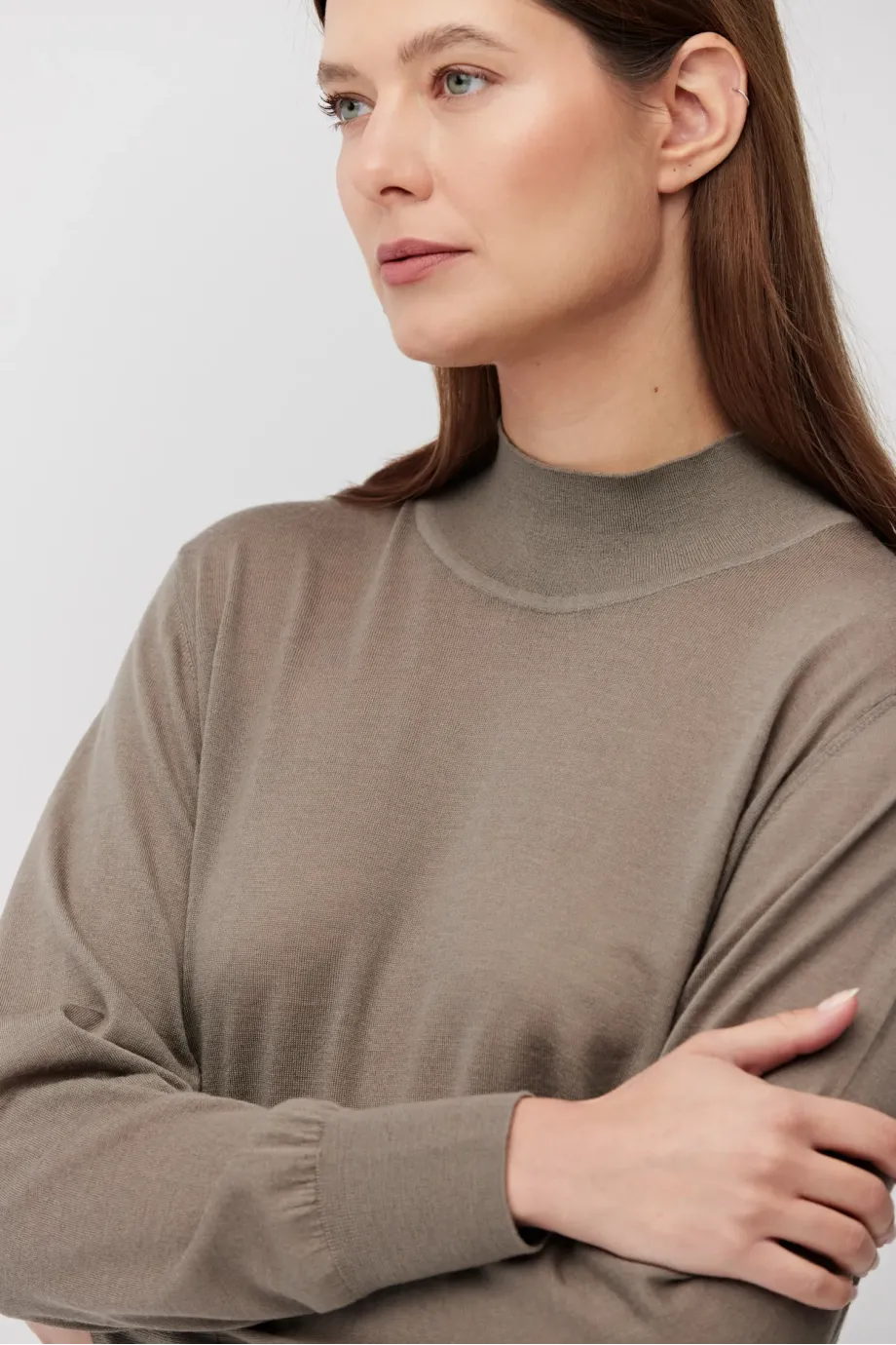 Pullover aus Merinowolle. Stehkragen, lange Ärmel. Weiches Gestrick im feinen Single-Jersey, gefertigt auf einer Maschine mit 16 GG Feinheit. Farbe Beige.