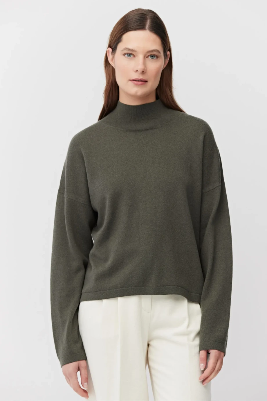 Grüner Pullover mit Merinowolle und Kaschmir. Rollkragen, lange Ärmel, lockere Passform. Weiches Gestrick im Jersey-Knit, gefertigt auf einer Maschine mit 12 GG Feinheit.