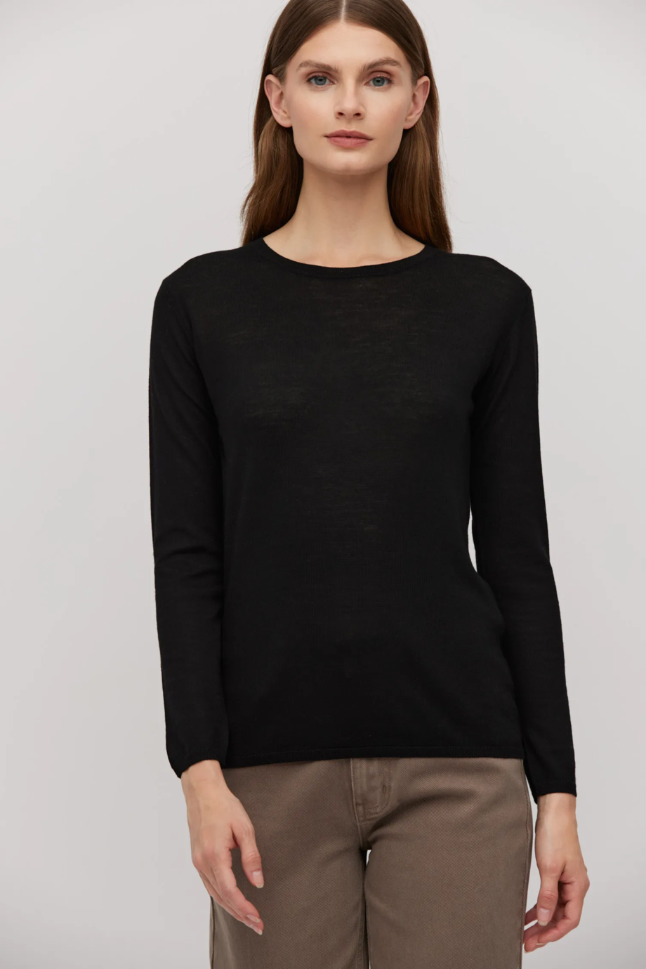 Top aus Merinowolle. Rundhalsausschnitt, lange Ärmel, körpernahe Passform. Feines Single-Jersey-Gestrick mit 18 GG Maschinendichte. Farbe: Schwarz.