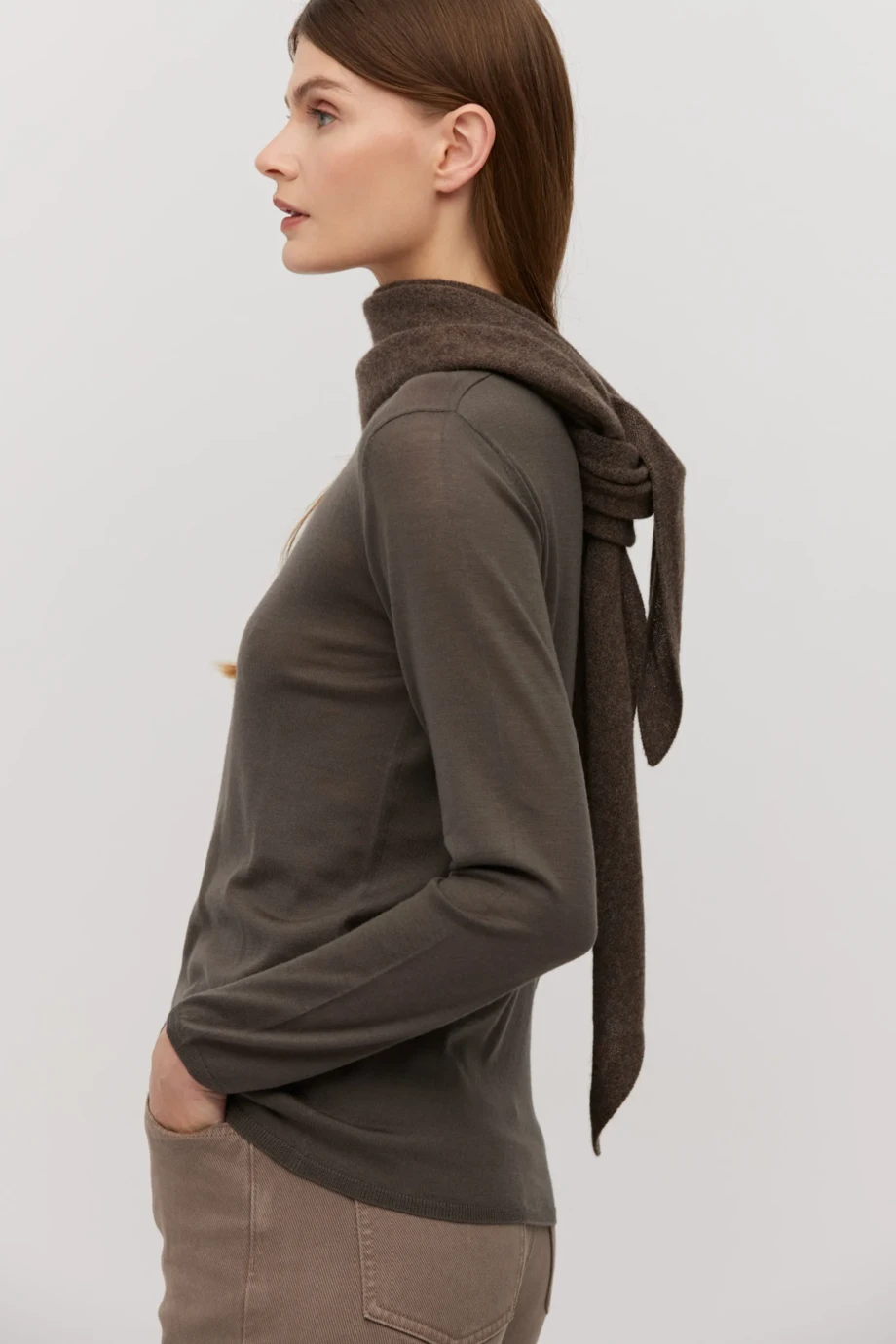 Top aus Merinowolle. Rundhalsausschnitt, lange Ärmel, körpernahe Passform. Feinstrick im sehr feinen Single-Jersey, gefertigt auf einer Maschine mit 18 GG Feinheit. Farbe Braun.