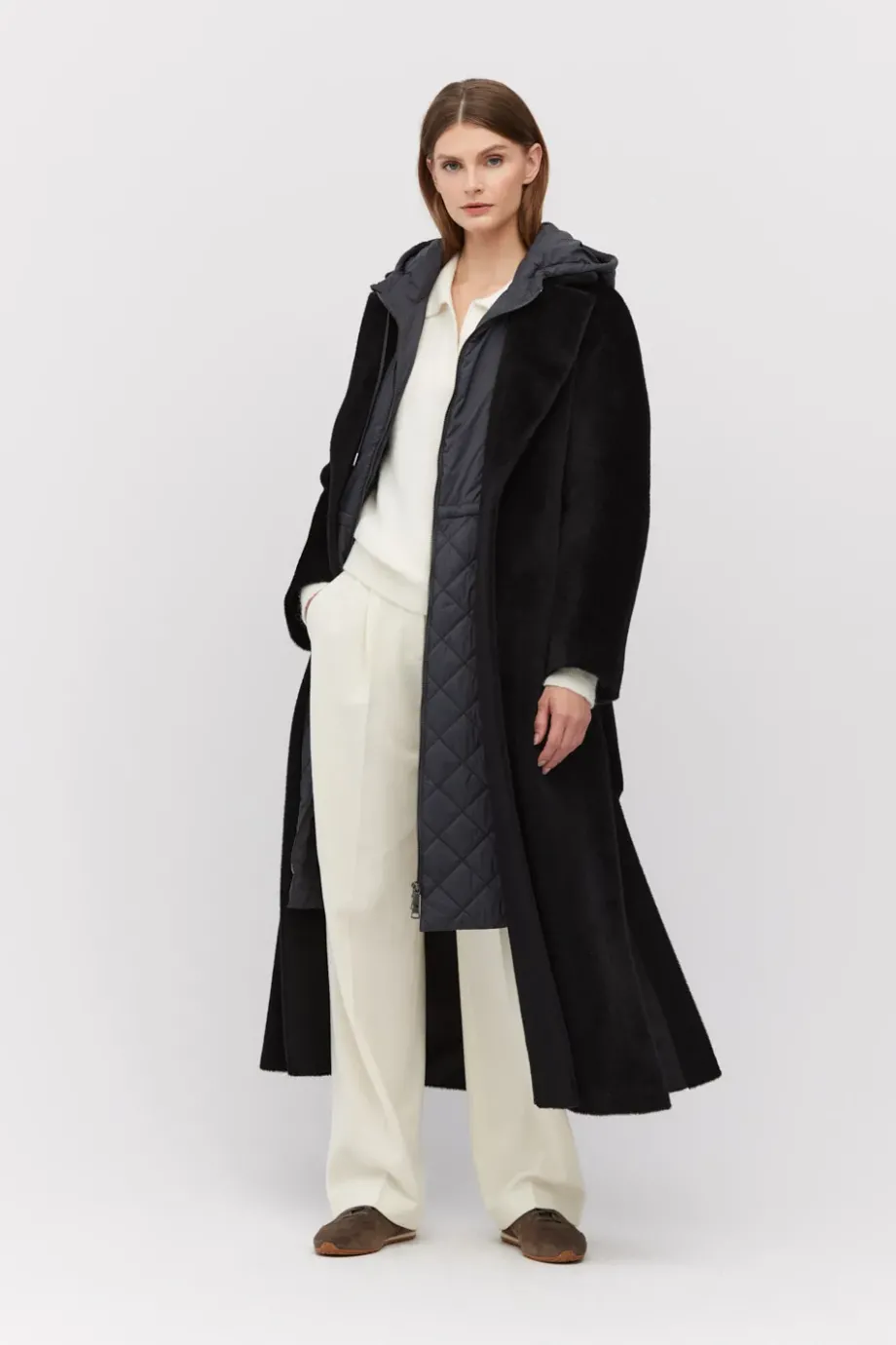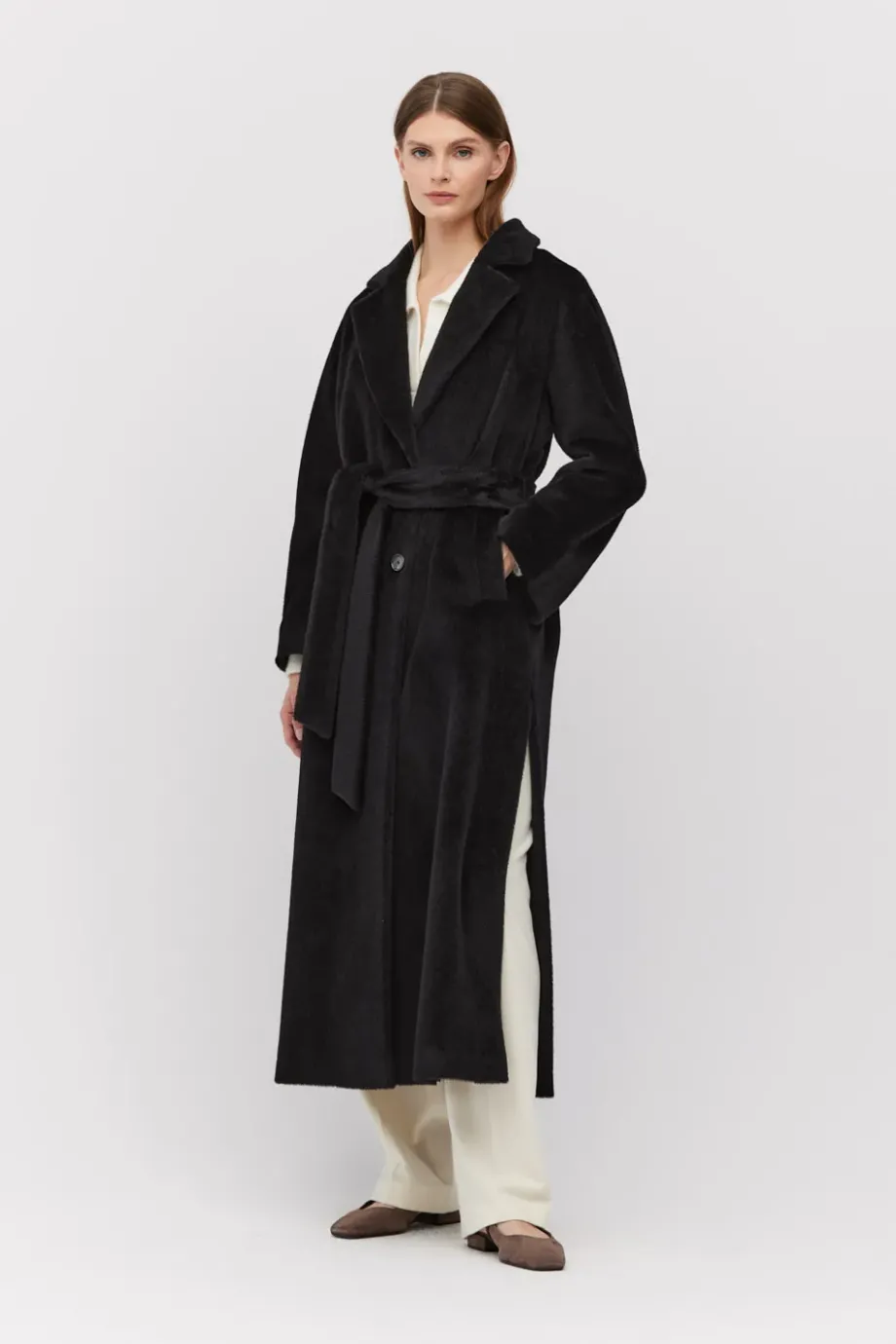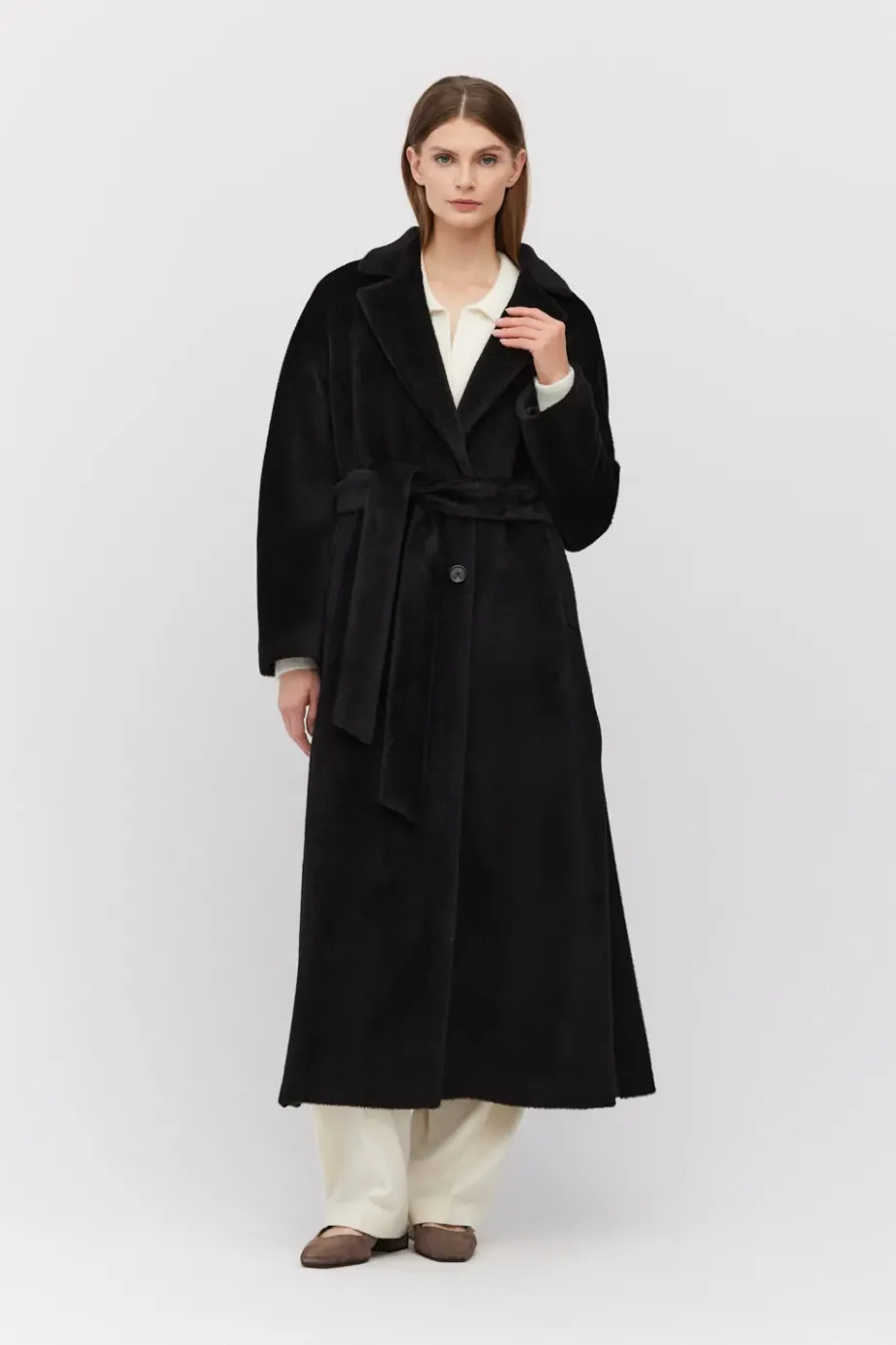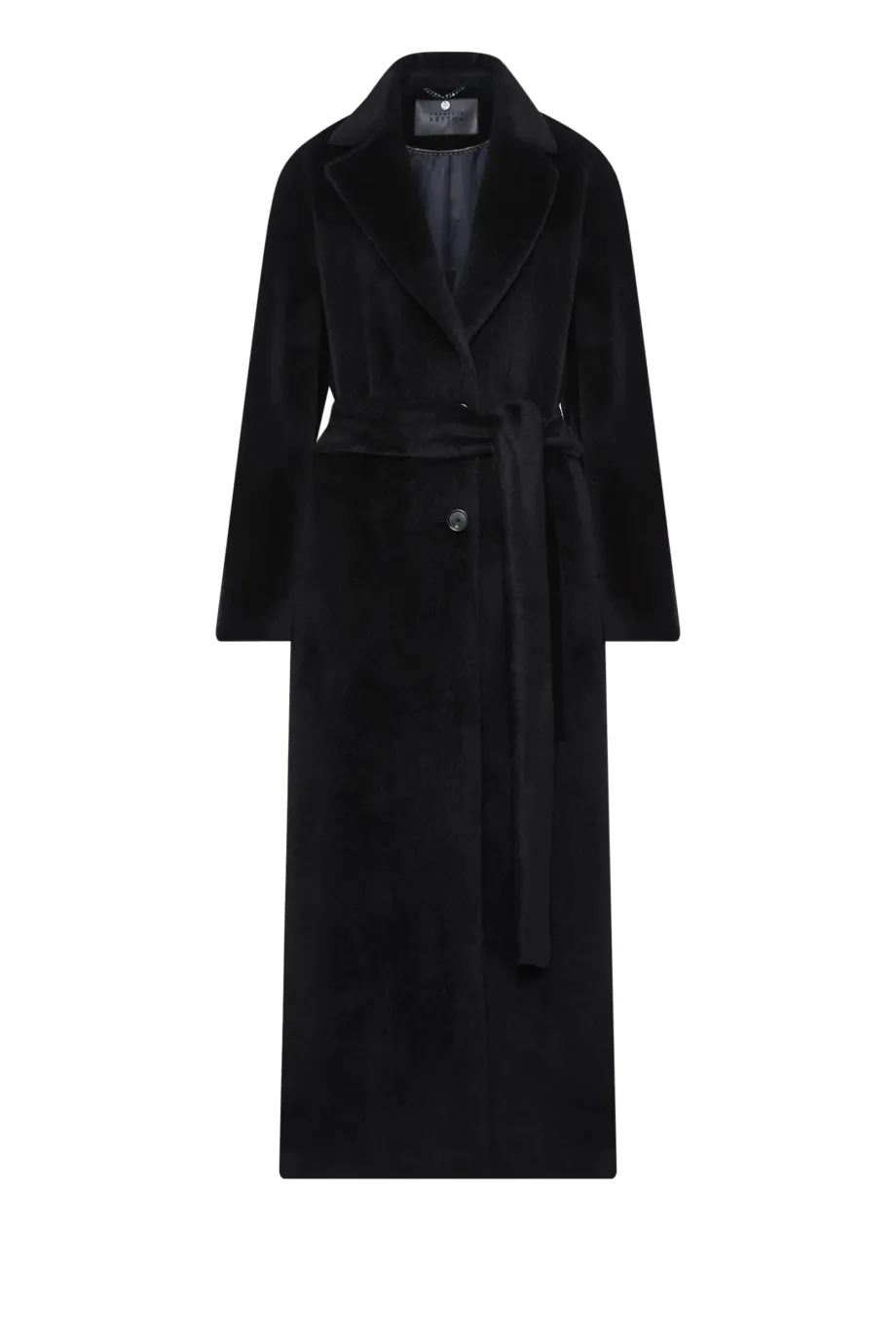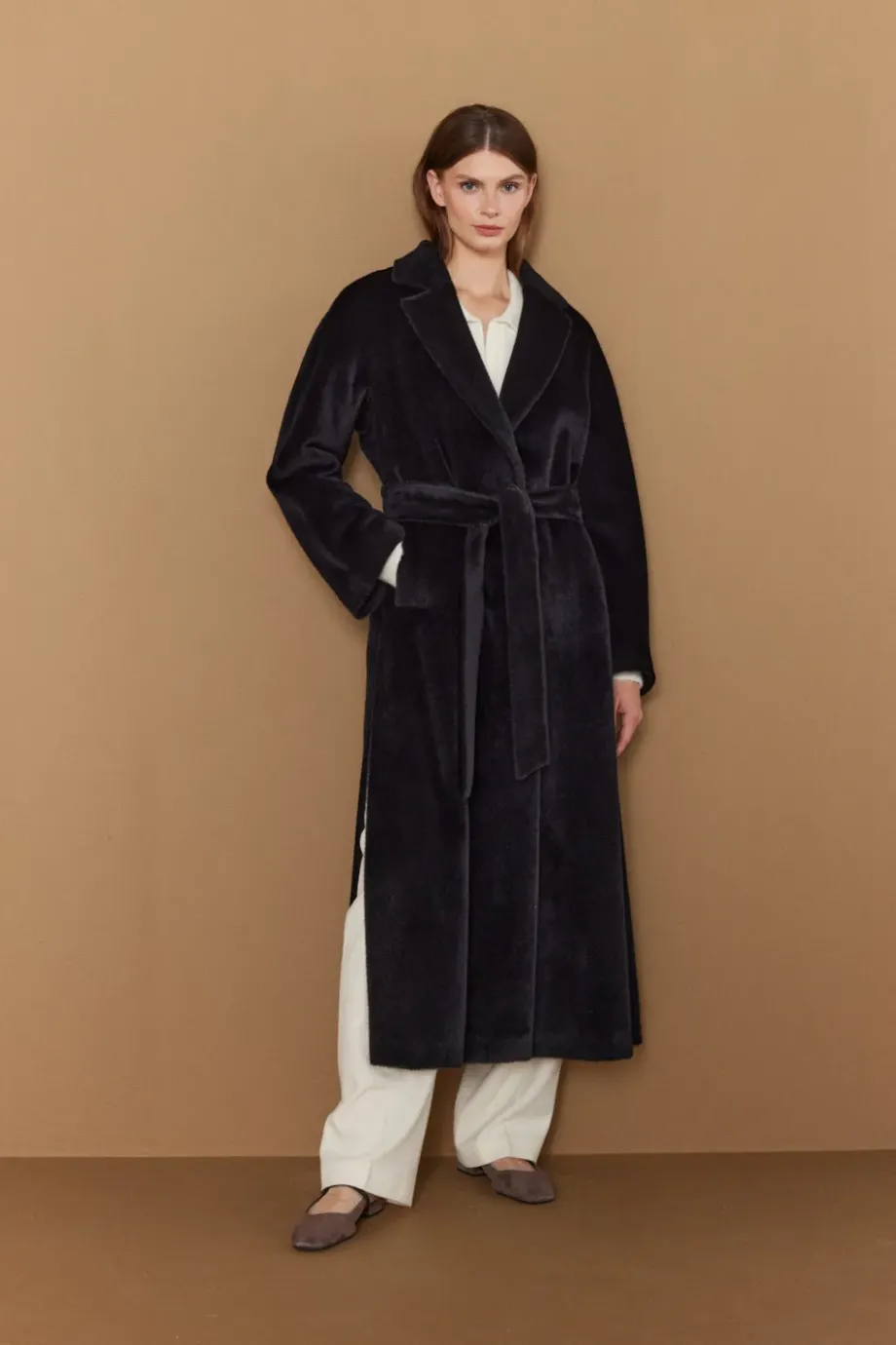 Schwarzer Mantel mit Gürtel aus Suri-Alpaka