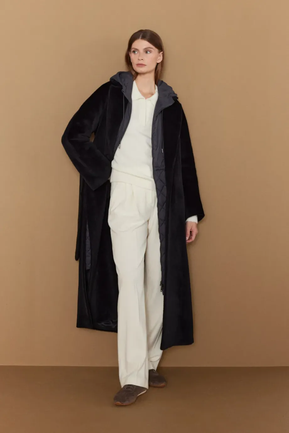 Einfaches Midi-Modell aus weichem Stoff mit Baby-Suri-Alpaka-Anteil. Gürtel in der Taille, Kimonoärmel und Kragen. Das gesamte Kleidungsstück ist mit Ziersteppnähten, Paspeln und Einfassungen von innen gefüttert. Verschluss innen mit einem Knopf aus Corozo-Nuss, außen aus Naturhorn. Farbe: Schwarz.