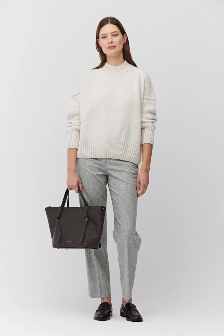 Pullover aus Merinowolle und Baumwolle. Stehkragen, lange Ärmel, lockere Passform. Weiches Gestrick im lockeren Single-Jersey, gefertigt auf einer Maschine mit 2 GG Feinheit. Farbe Beige.