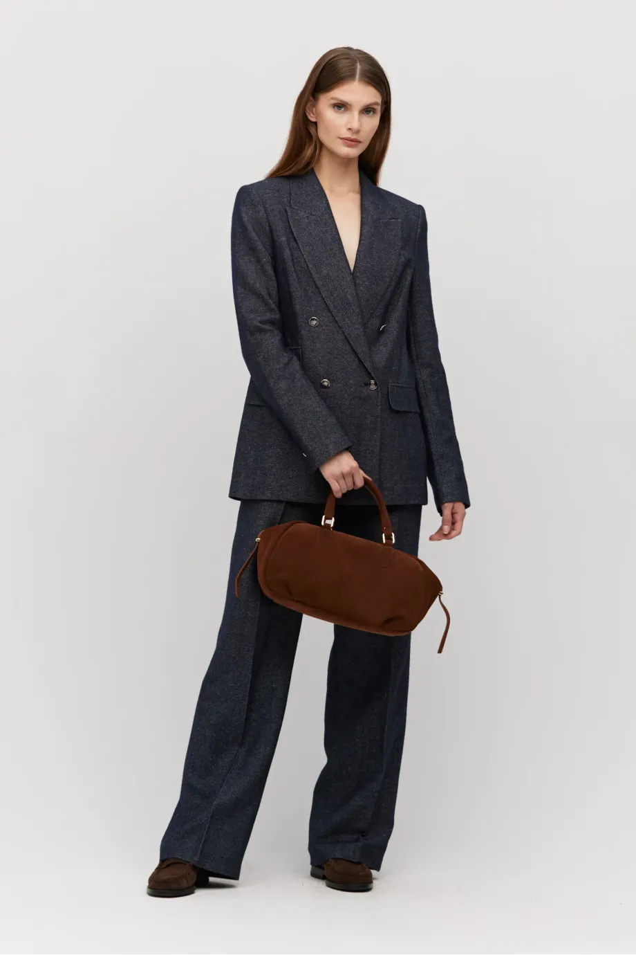 Anzughose aus einer Mischung aus Lammwolle, Leinen und Kaschmir. Weites Bein, Gürtelschlaufen, Stoffgürtel mit Metallschnalle sowie innenliegender Knopf aus natürlicher Corozo-Nuss. Mit Taschen. Innen mit dekorativer Einfassung verarbeitet.