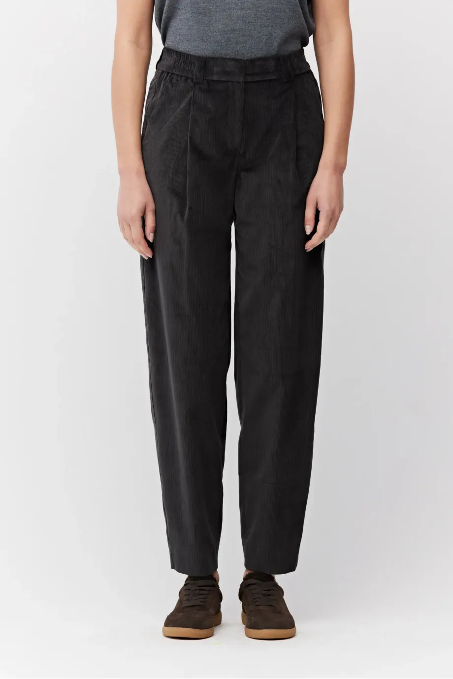 Hose aus weichem Cordstoff. Farbe: Dunkelgrau. Verengte Hosenbeine, elastischer Bund hinten. Seitentaschen, dekorative Innenverzierungen. Verschluss mit Stahlhaken und Knopf aus natürlichem Corozo-Nussbaumholz. Aus Baumwolle gefertigt.