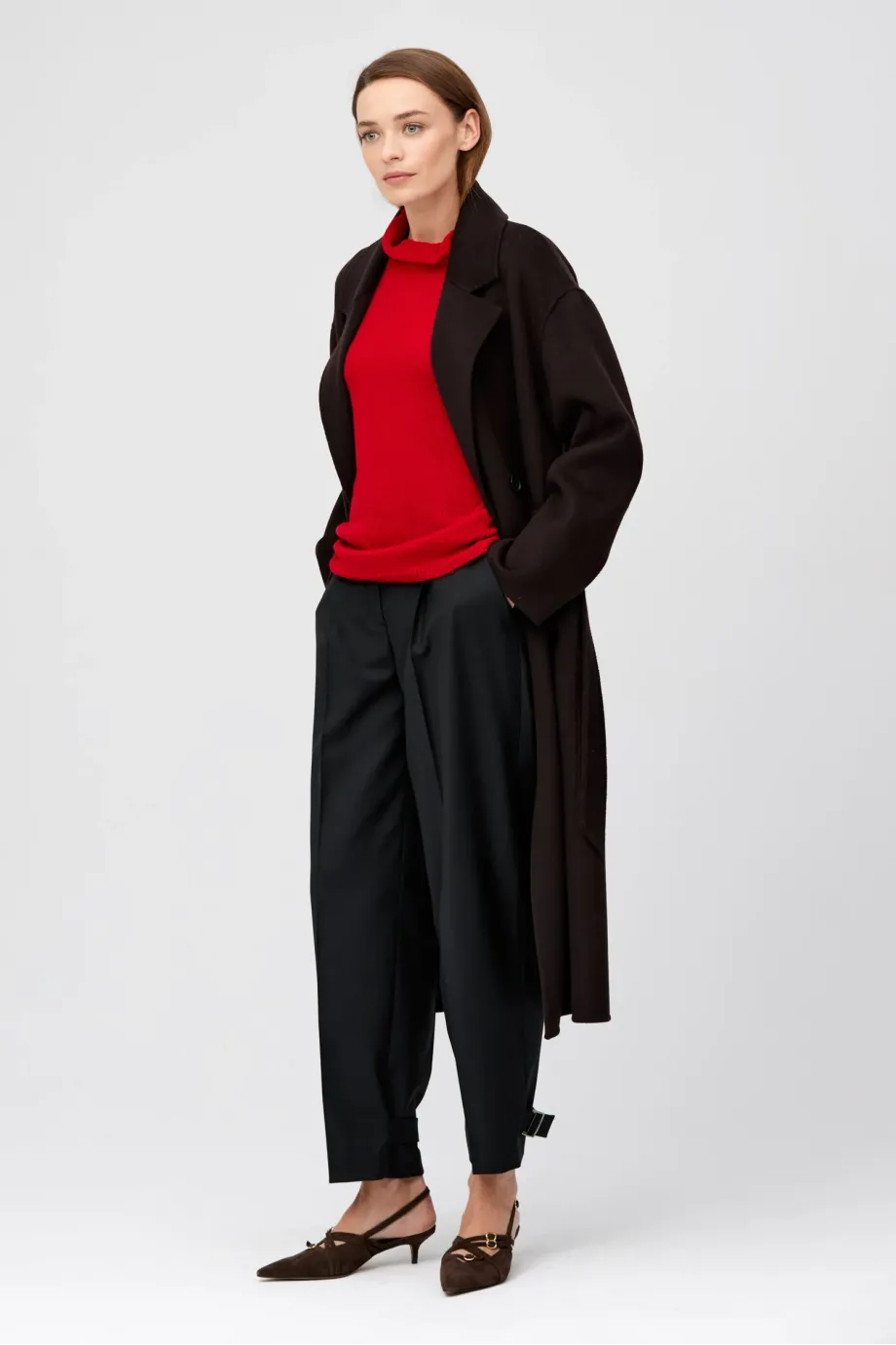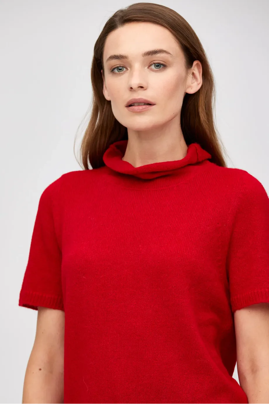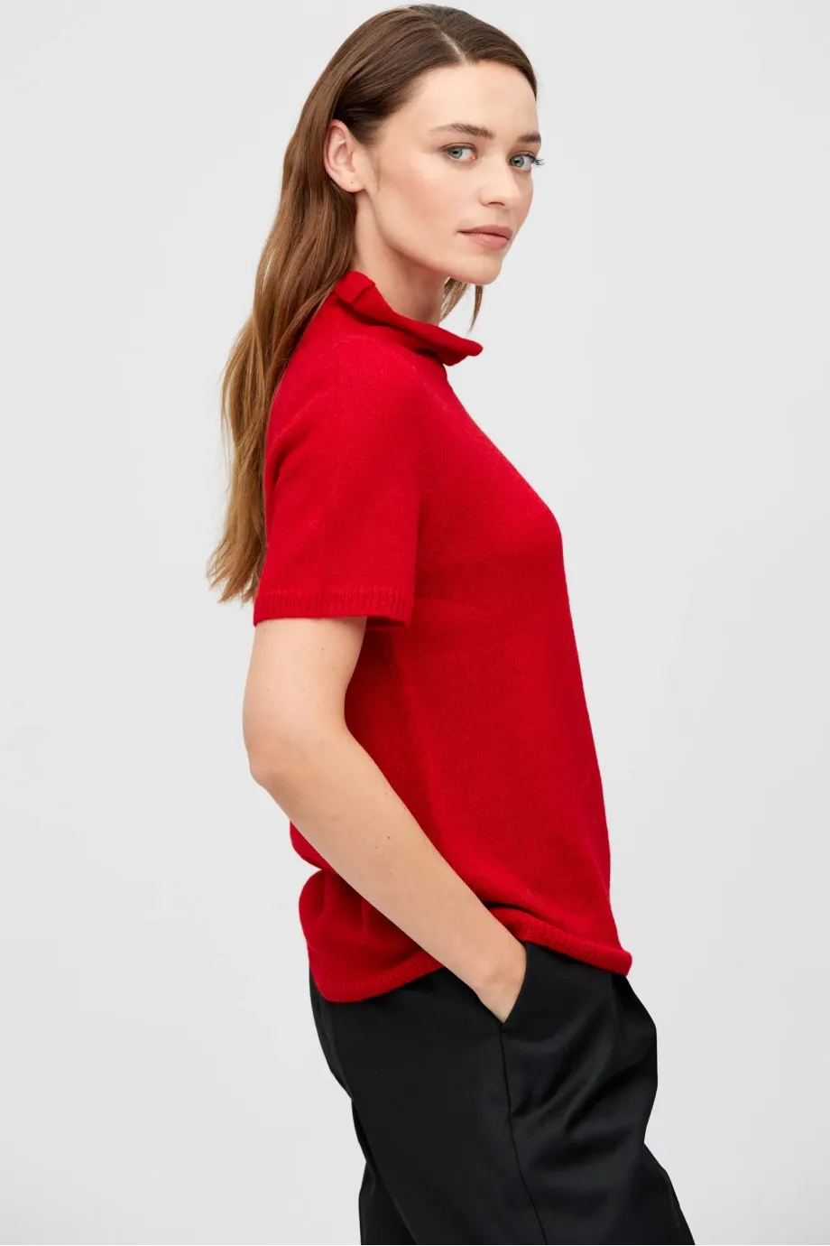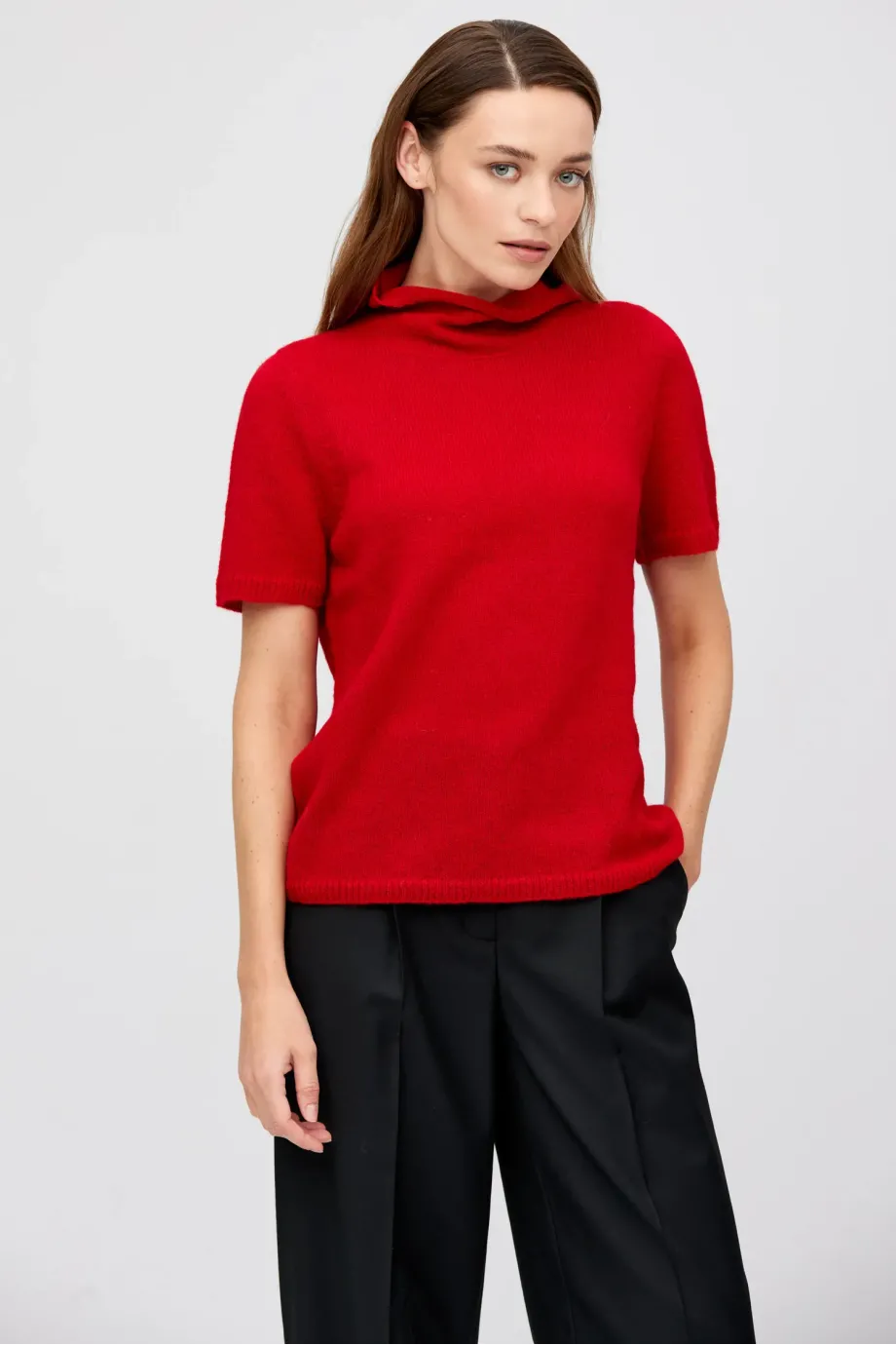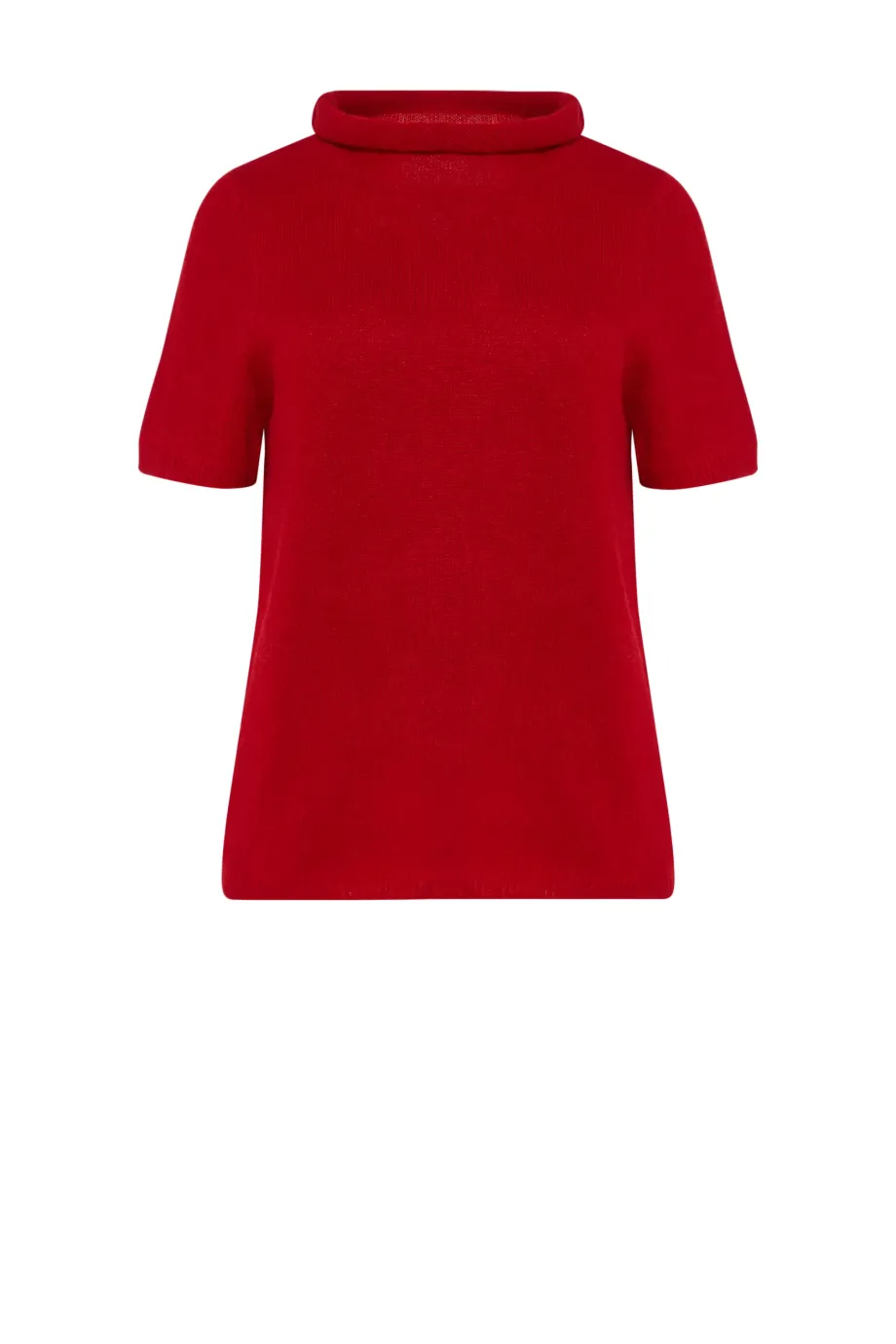 Stehkragenpullover aus Baby-Alpakawolle. Kurze Ärmel, schlichte Form. Weicher, warmer Stoff mit lockerem Single-Jersey-Strick, hergestellt auf einer Maschine mit 5 GG. Farbe rot.