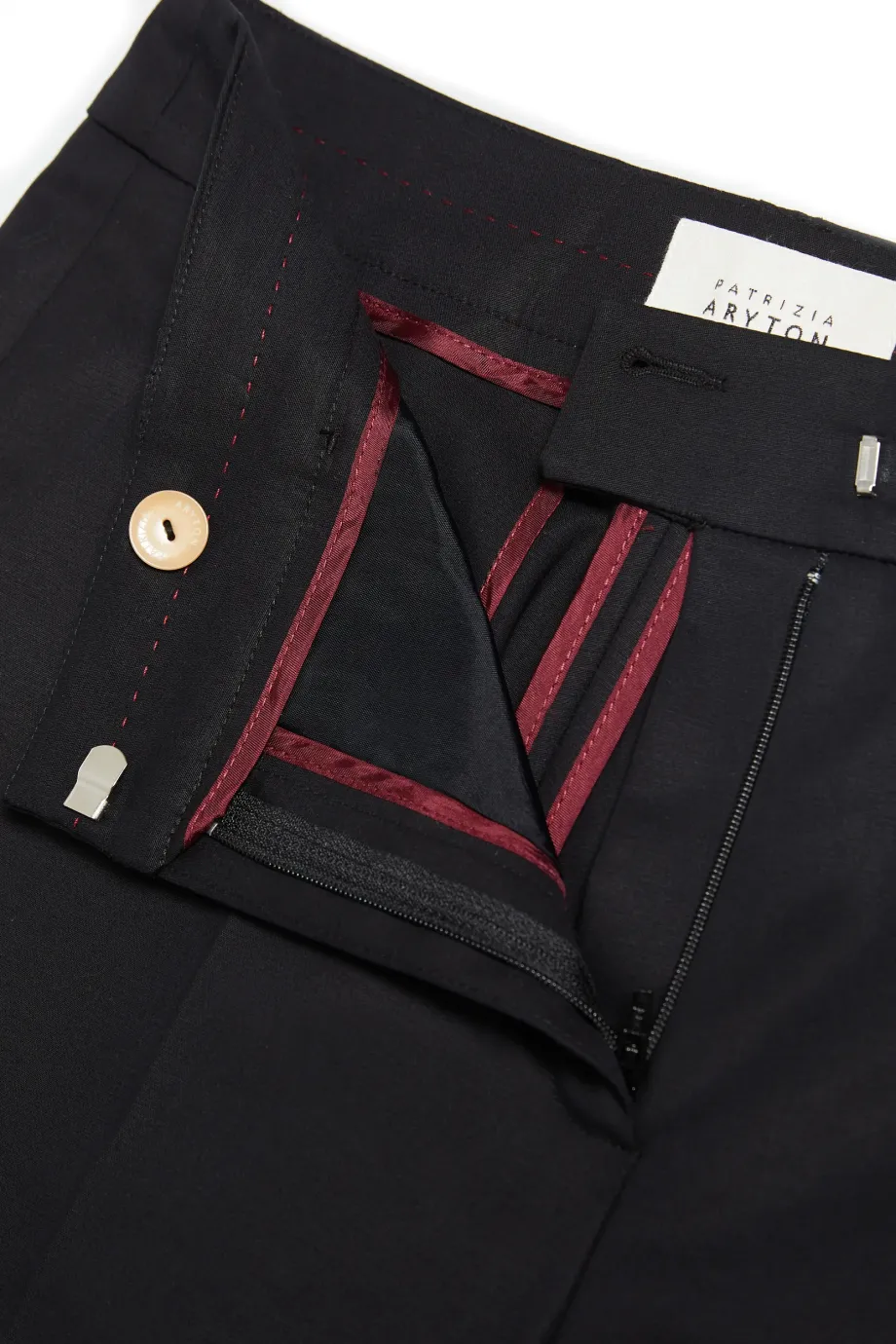 Baumwollhose mit schmal zulaufendem Bein. Verschluss mit Reißverschluss, Haken und innenliegendem Knopf. Gürtelschlaufen und Taschen. Innen dekorative Paspeln. Farbe: Schwarz.