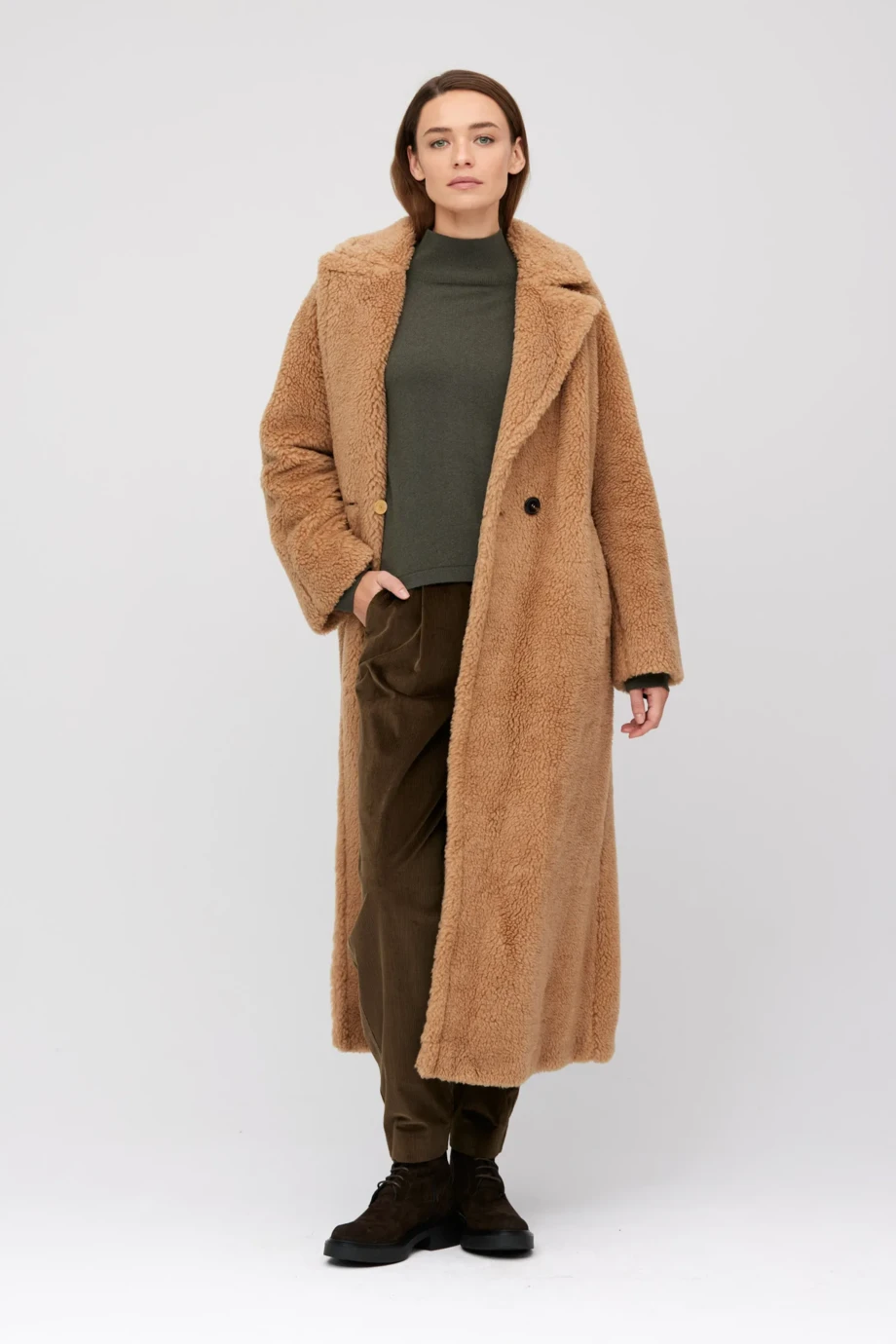 Teddy-Mantel mit Kamelwolle und Seide. Gerader, lockerer Schnitt in Midilänge. Zweireihiges Modell, außen mit Hornknöpfen, innen mit Nussknopfverschluss. Lange Ärmel, Kragen, Taschen. Farbe: Camel. Gefüttert.