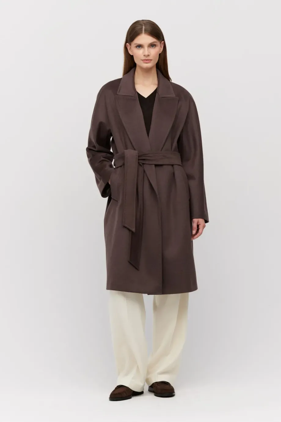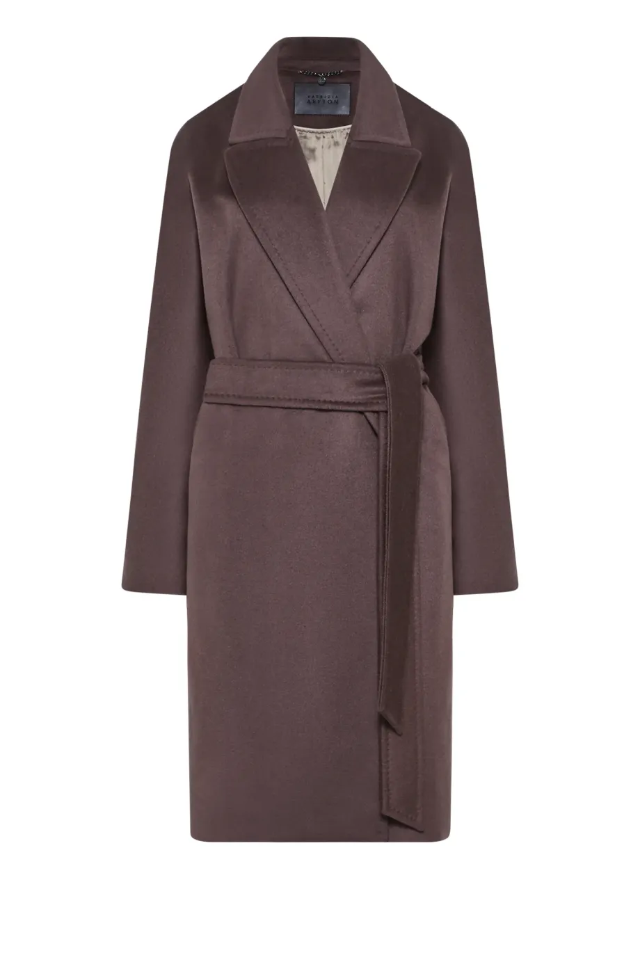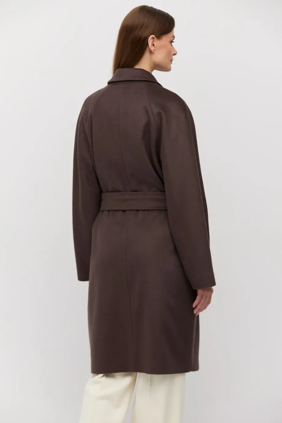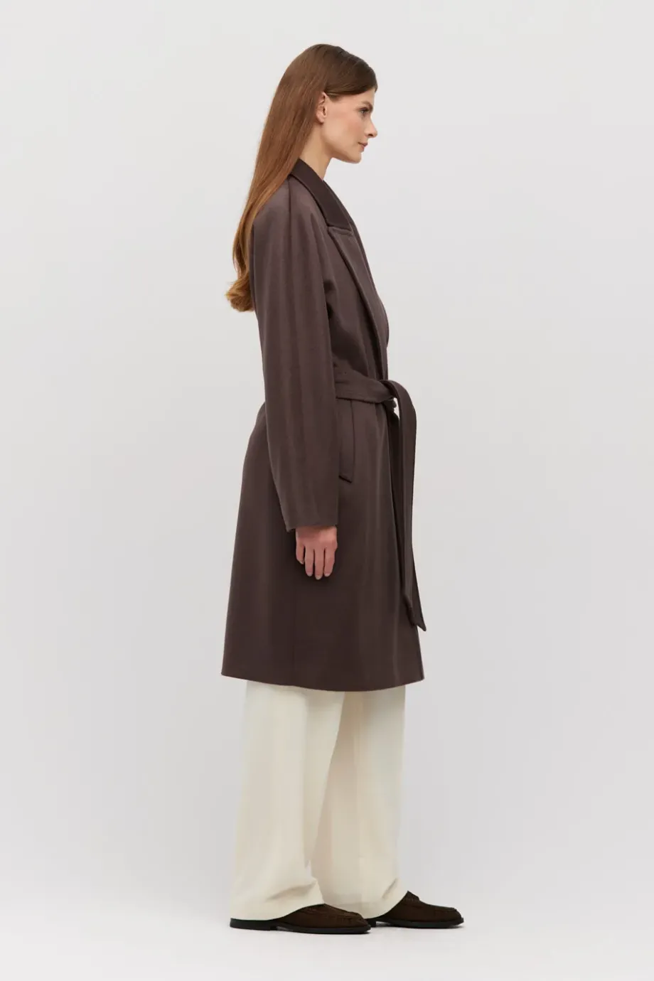 Wollmantel in Braunton, mit Gürtelverschluss, Taschen und knielanger Länge. Gefüttert, innen mit dekorativer Paspelierung und Steppnähten verarbeitet.