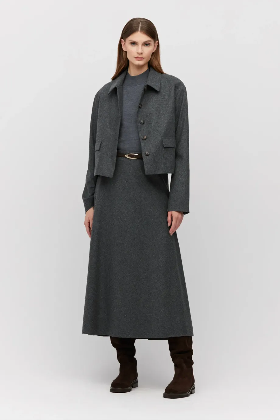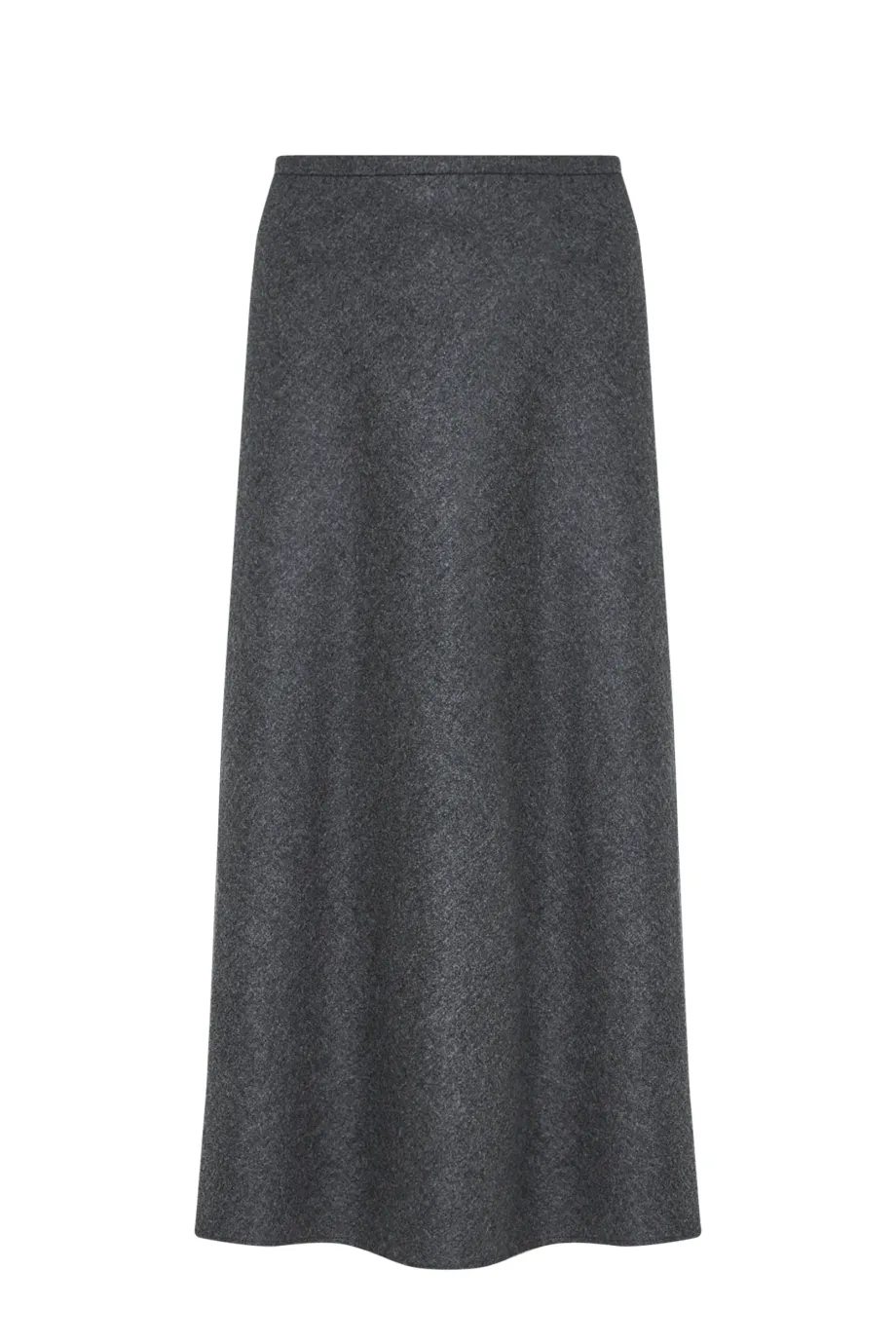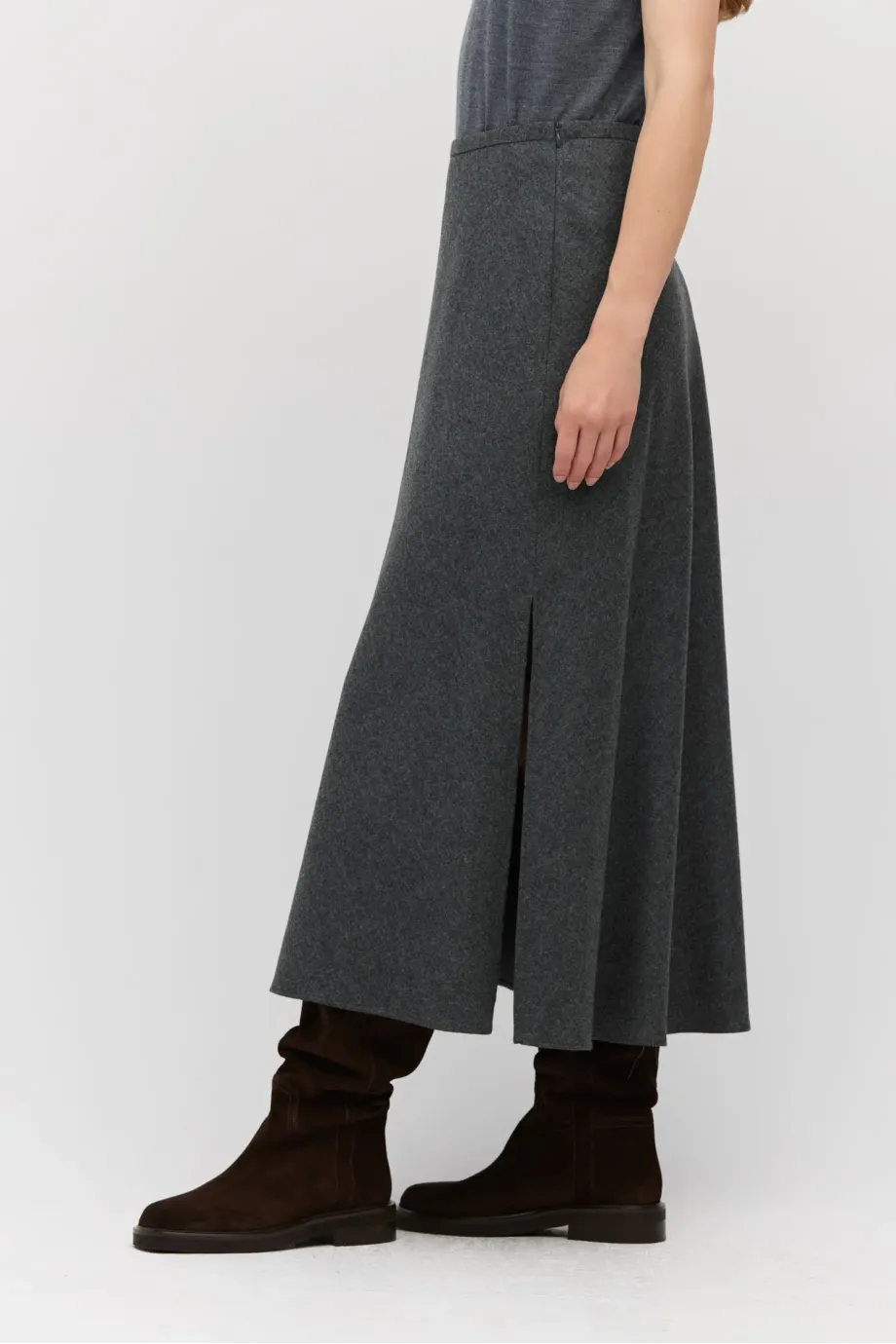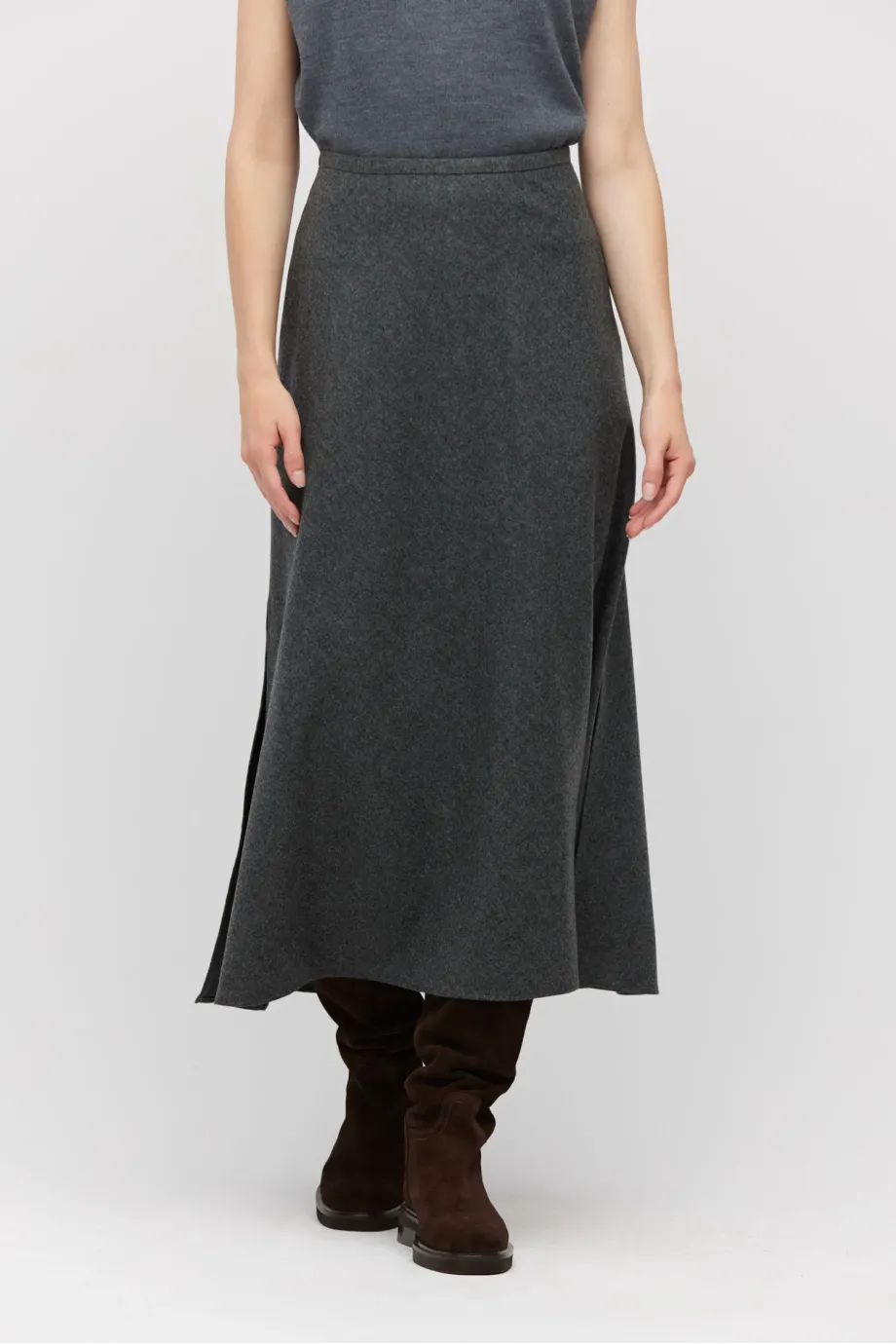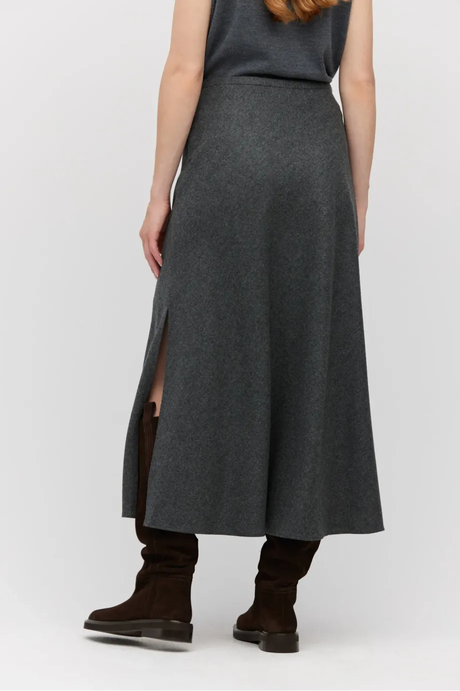 Dunkelgrauer Midirock mit Futter. Stoff mit Kaschmiranteil. Klassischer Bund, schräg geschnittener Saum. Reißverschluss auf der linken Seite.