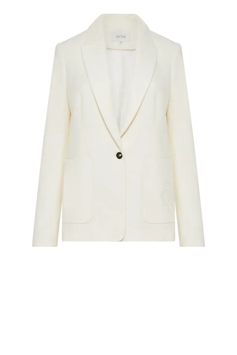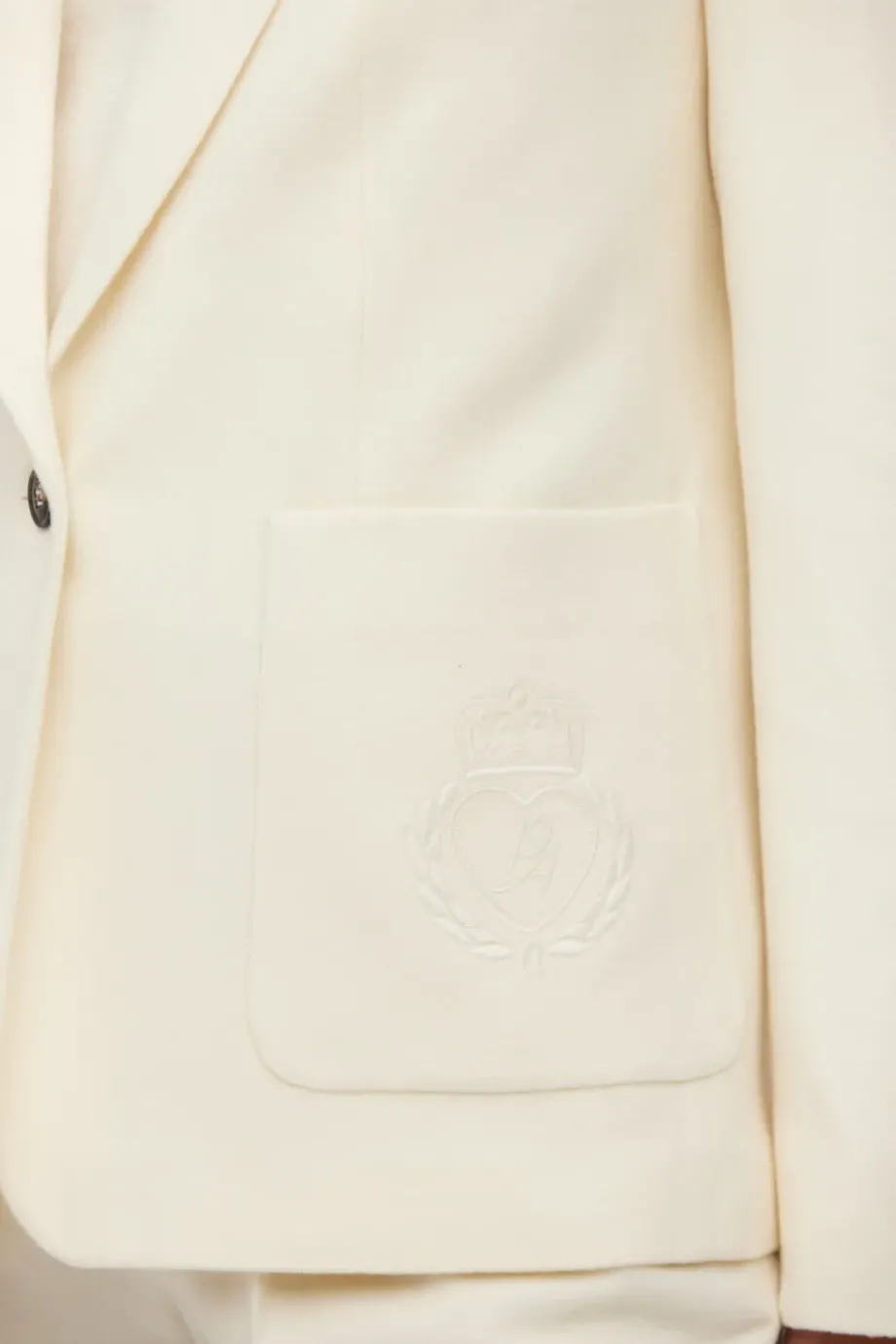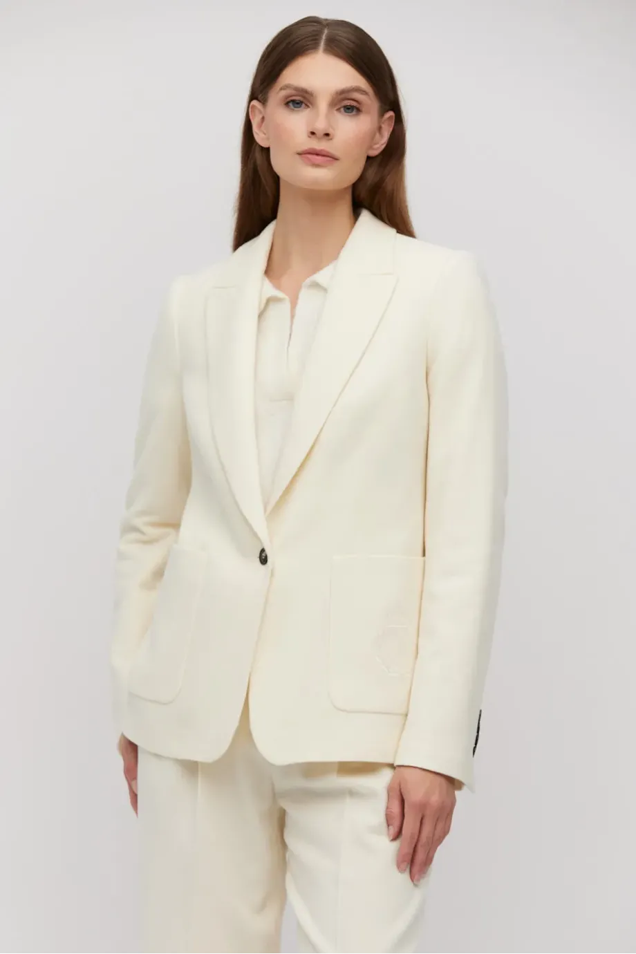Einreihiges Sakko aus Wolle mit Kaschmiranteil. Leicht taillierter Schnitt, lange Ärmel, Ein-Knopf-Verschluss. Voll gefüttert, mit Steppnähten und Paspelierungen innen. Aufgesetzte Taschen mit Stickerei. Zur Komplettierung des Outfits eine Hose aus dem gleichen Stoff.